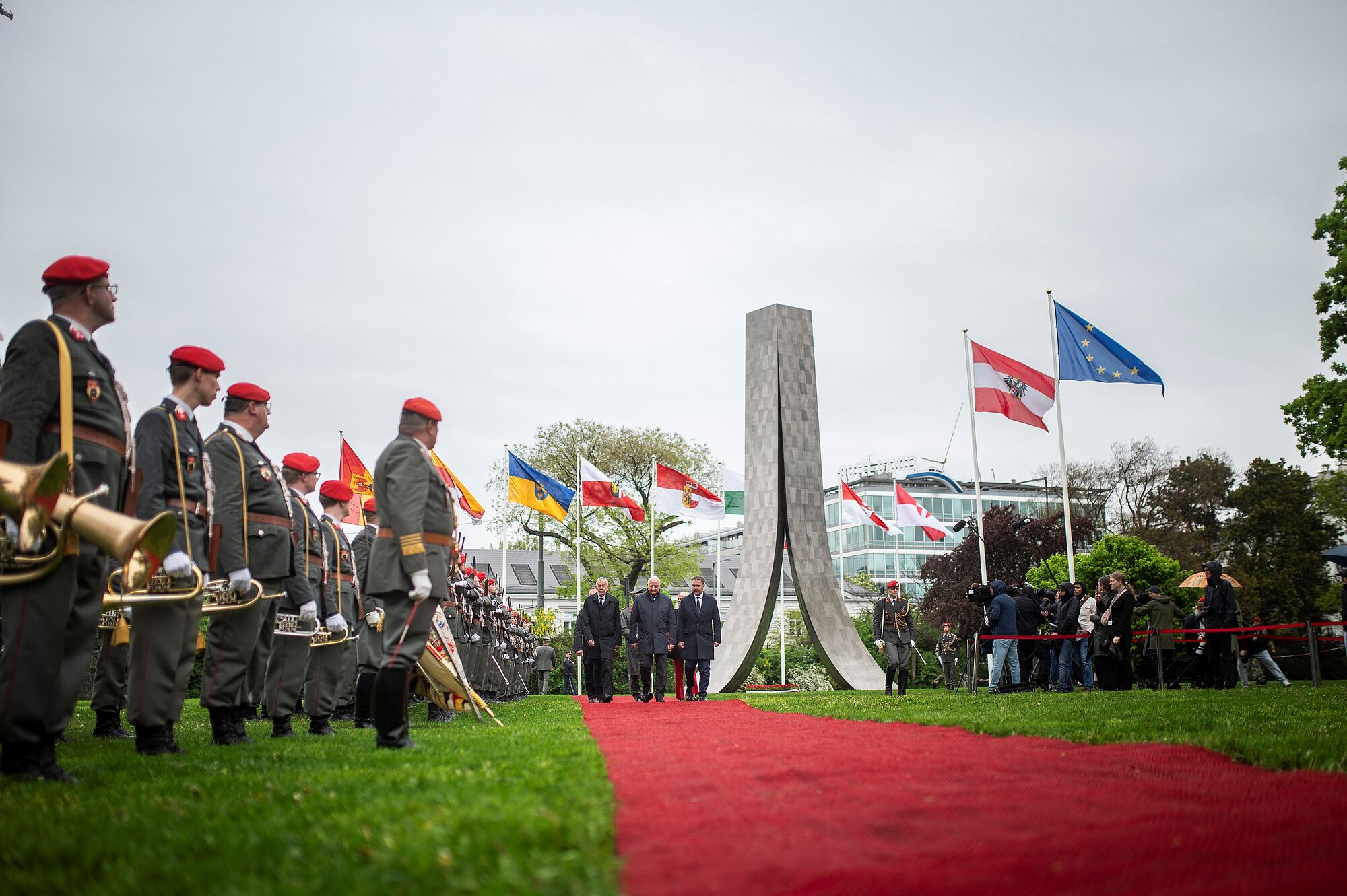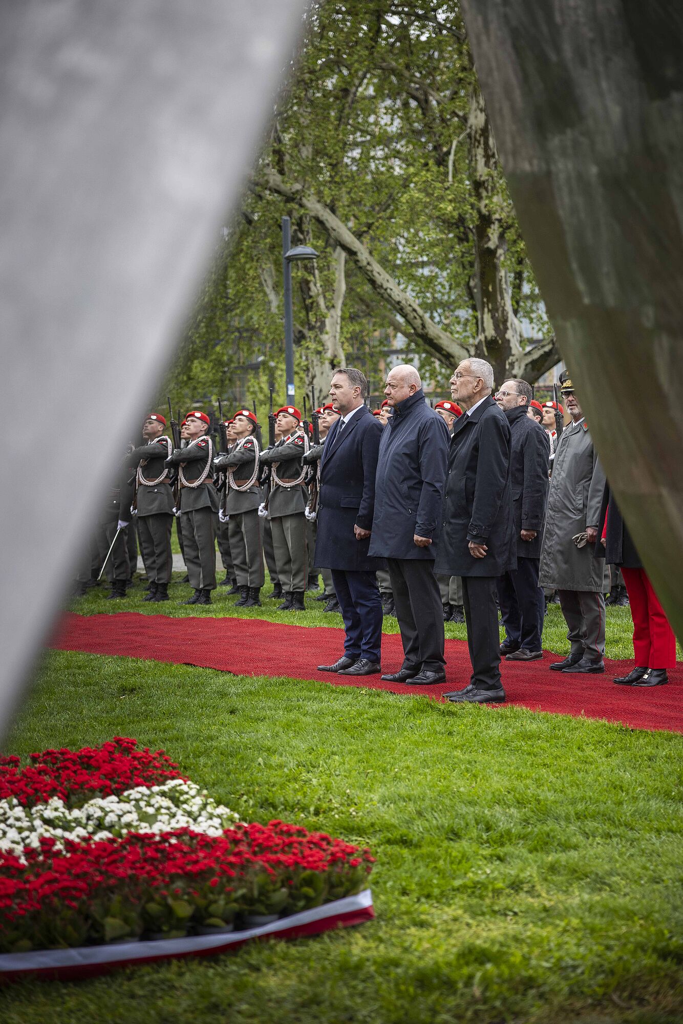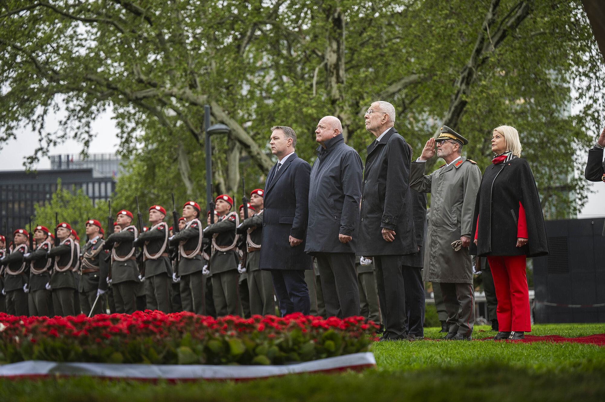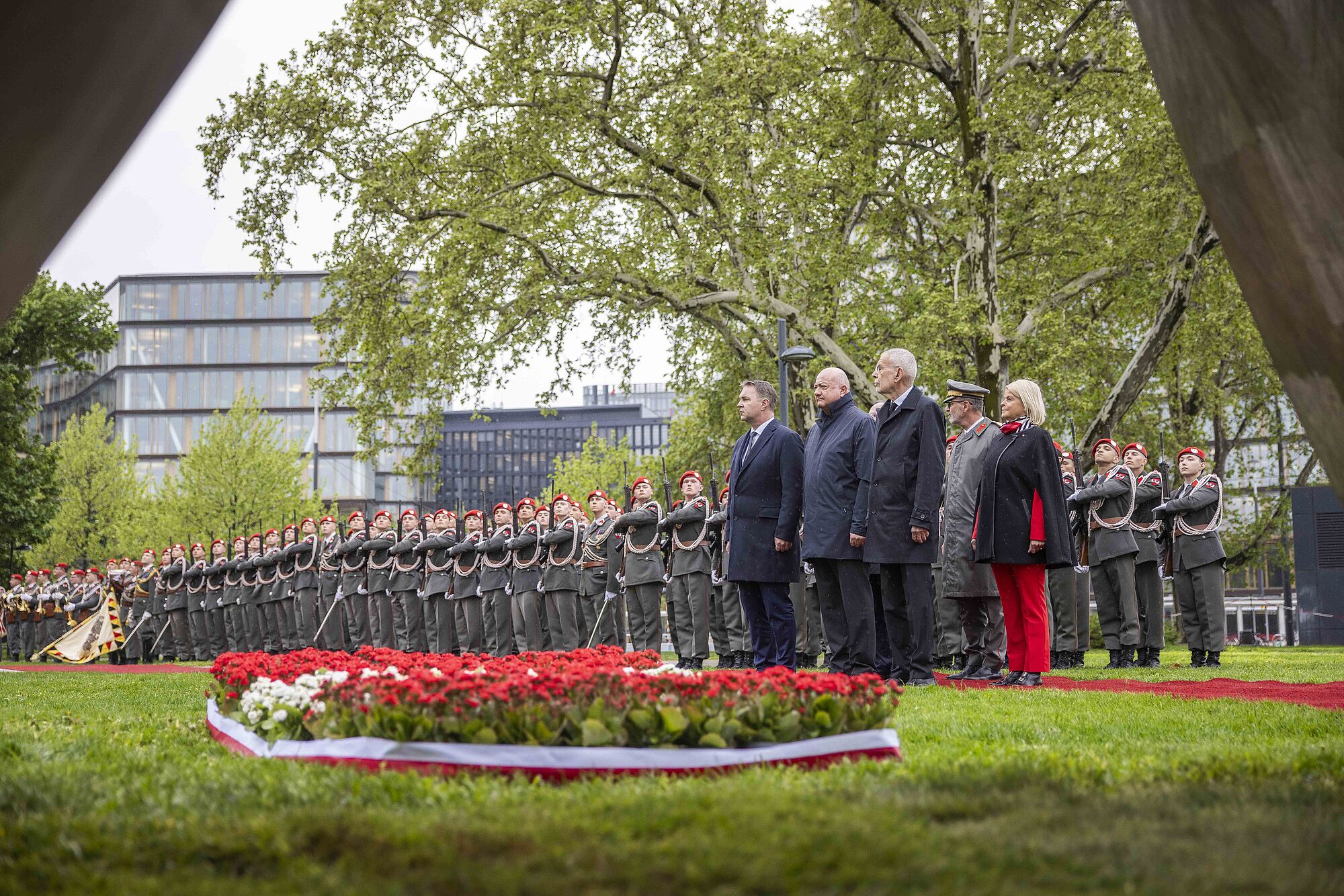 Ebenfalls angetreten war das Gardebataillon des Bundesheeres, um die Zeremonie mit einem militärischen Festakt zu umrahmen. Auch einige Schaulustige hatten sich unter Regenschirmen hinter den Absperrungen versammelt, um dem Gedenken beizuwohnen. Nach Erklingen der Bundeshymne und dem Abschreiten der Front wurde die Flagge gehisst. Anschließend gab die Gardemusik noch die Europahymne zum Besten.