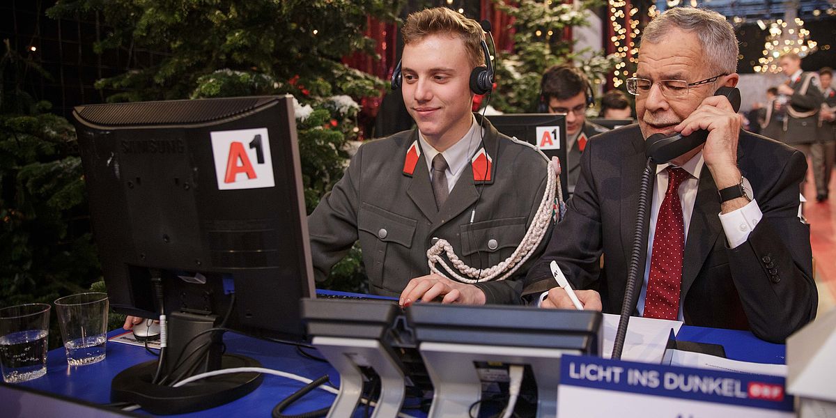 Bundespräsident Alexander Van der Bellen und Frau Doris Schmidauer am Spendentelefon für »Licht ins Dunkel«.