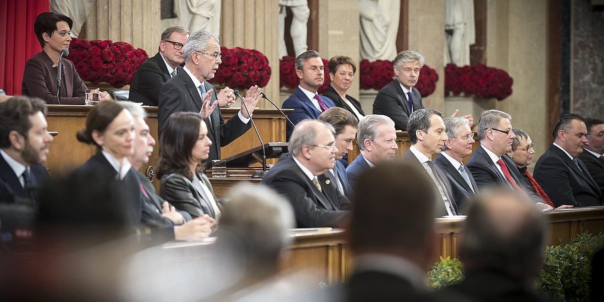 Mit den Worten "Österreich, das sind wir alle" betonte das neue Staatsoberhaupt mehrmals den Zusammenhalt in der Gesellschaft, egal woher die Menschen kämen und gleich, "ob sie nun Männer oder Frauen lieben". "Dieses Gerede von Spaltung halte ich für maßlos übertrieben." In Zeiten der Veränderung sei dies wichtig, verwies er auf Herausforderungen am Arbeitsmarkt, durch Flucht und Migration, Nationalismus und Terror oder durch den Klimawandel.