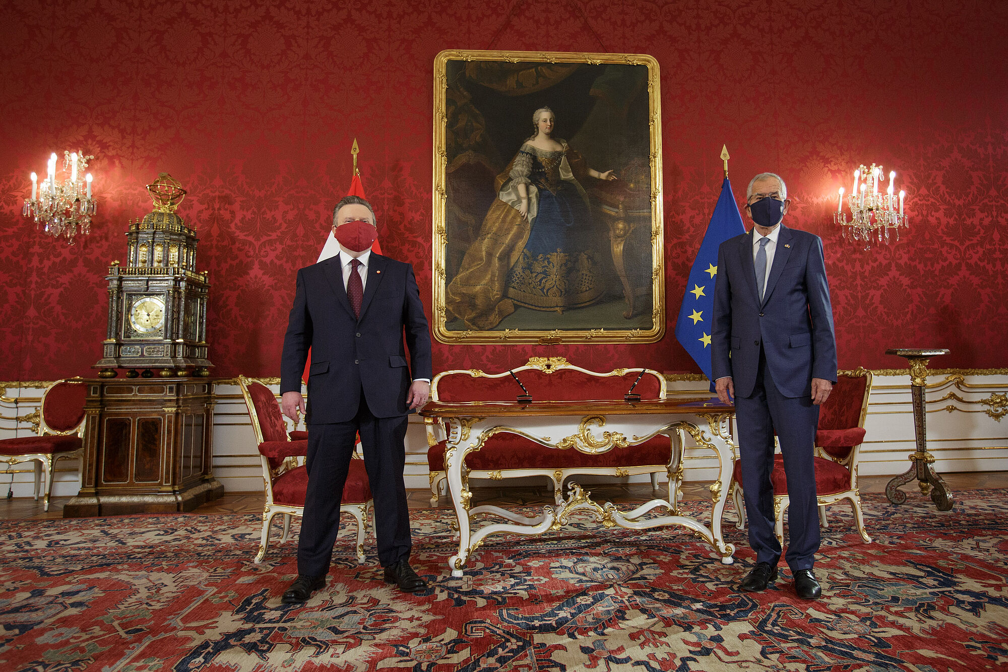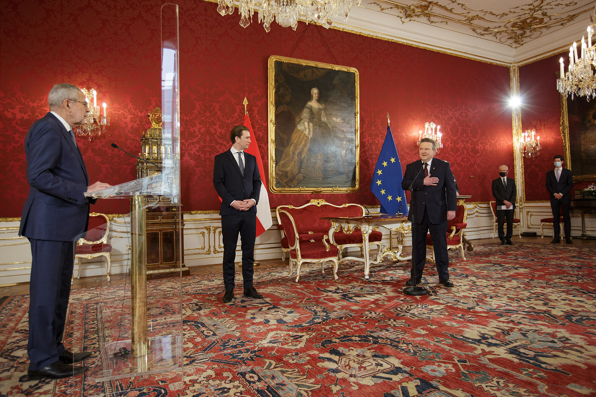 Danach sprach Ludwig die offizielle Gelöbnisformel. Die beiden Herren begaben sich im Anschluss mit Maske - "Setzen wir diese wunderbaren Dinger wieder auf", meinte Van der Bellen - an den Tisch, um die geforderten Unterschriften zu leisten. Der traditionelle Handschlag musste pandemie-bedingt entfallen.