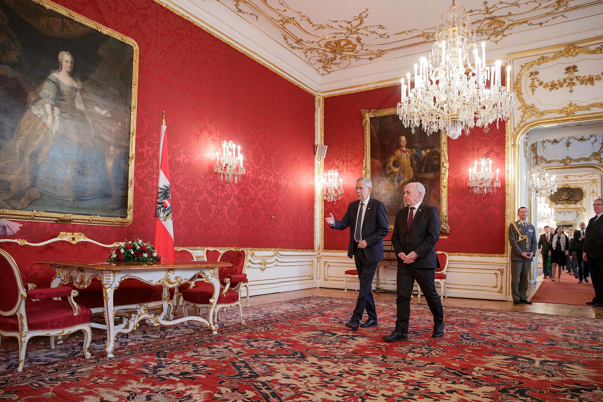 Bundespräsident Alexander Van der Bellen hatte seinen Amskollegen Maurer im Inneren Burghof mit militärischen Ehren zum offiziellen Antrittsbesuch in Österreich empfangen.