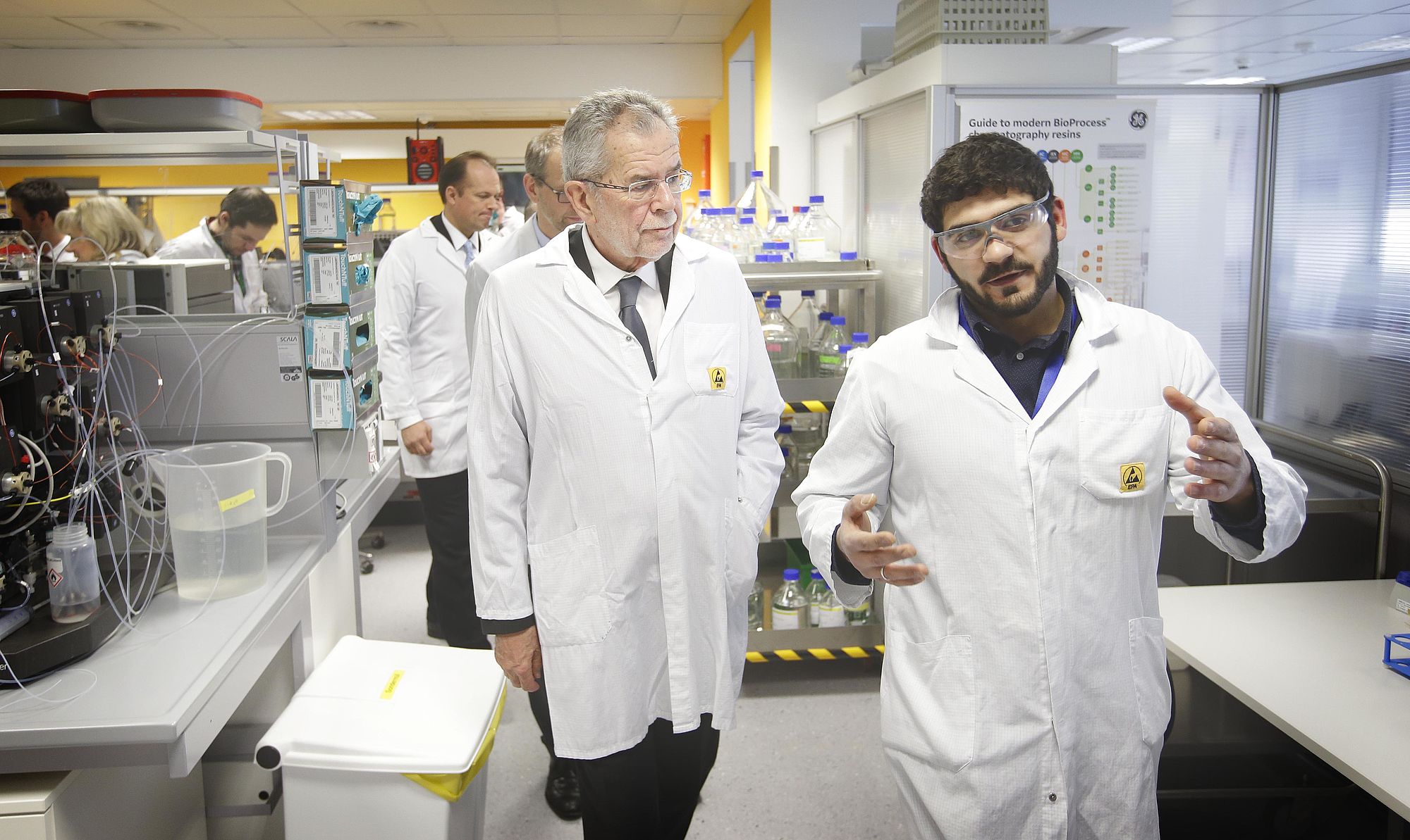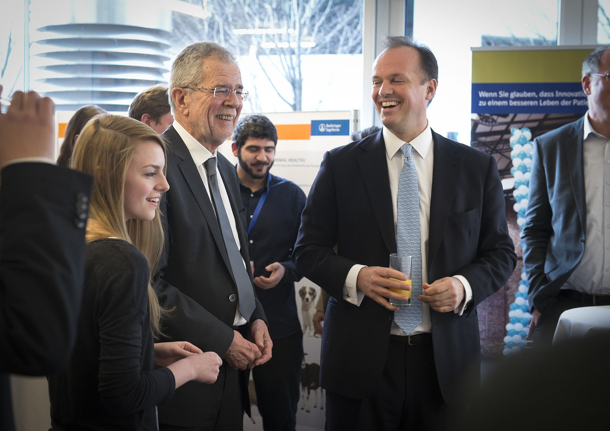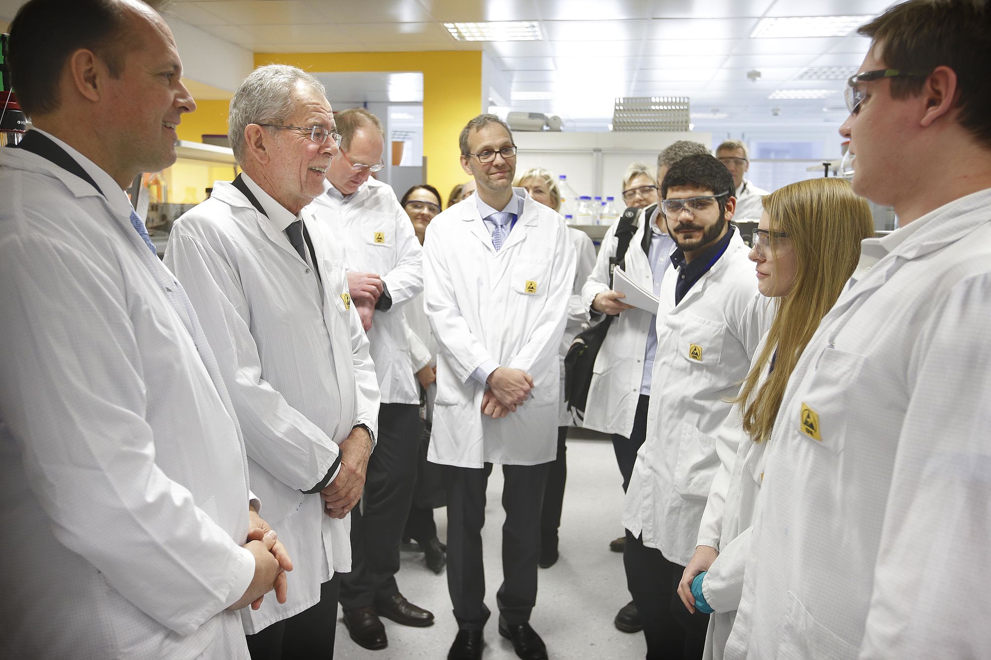 Bei seinem ersten Betriebsbesuch trifft der Bundespräsident in der Firma Boehringer Ingelheim mit den Lehrlingen zusammen und besichtigt das Labor des Bereichs Biopharma Process Science.