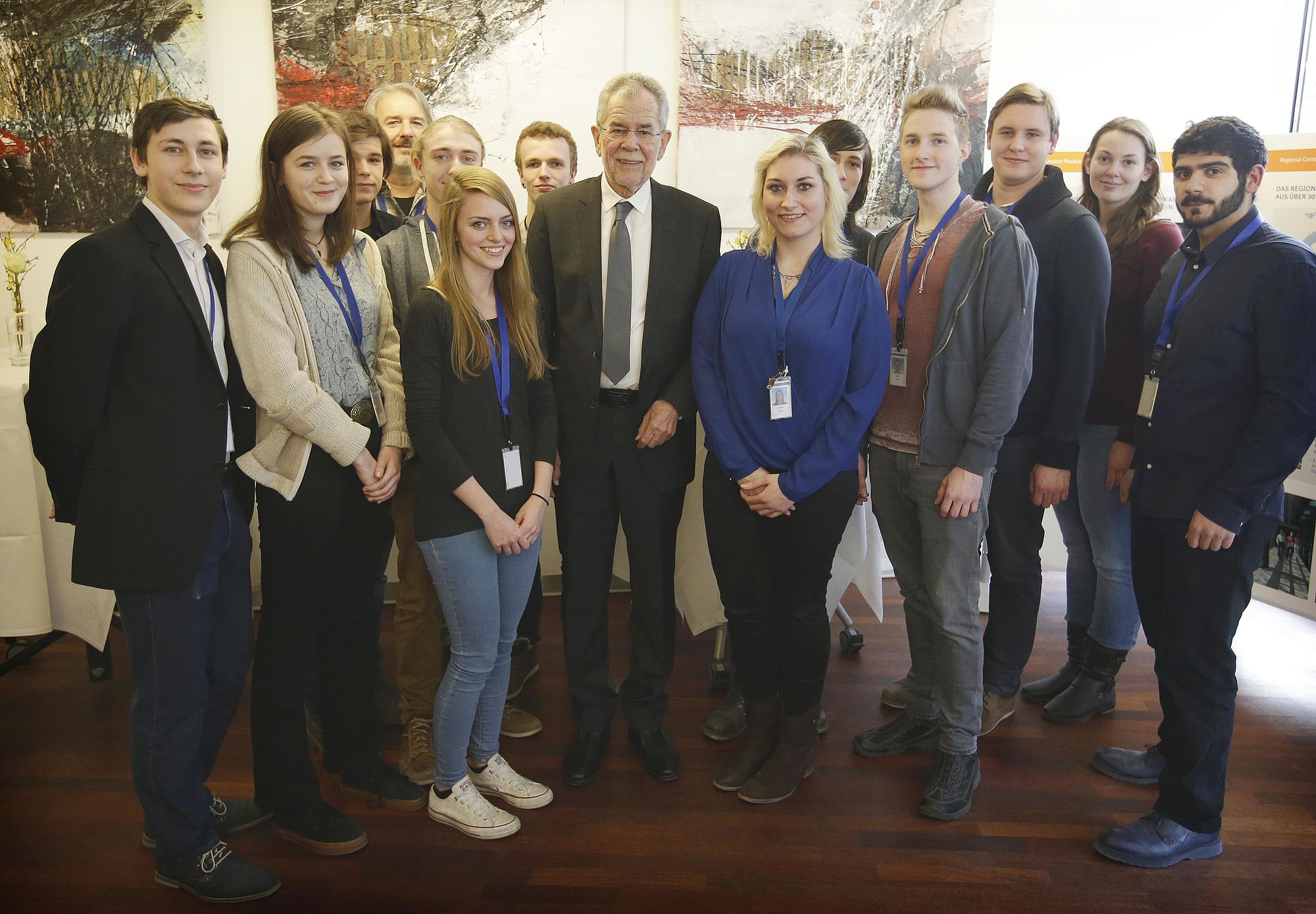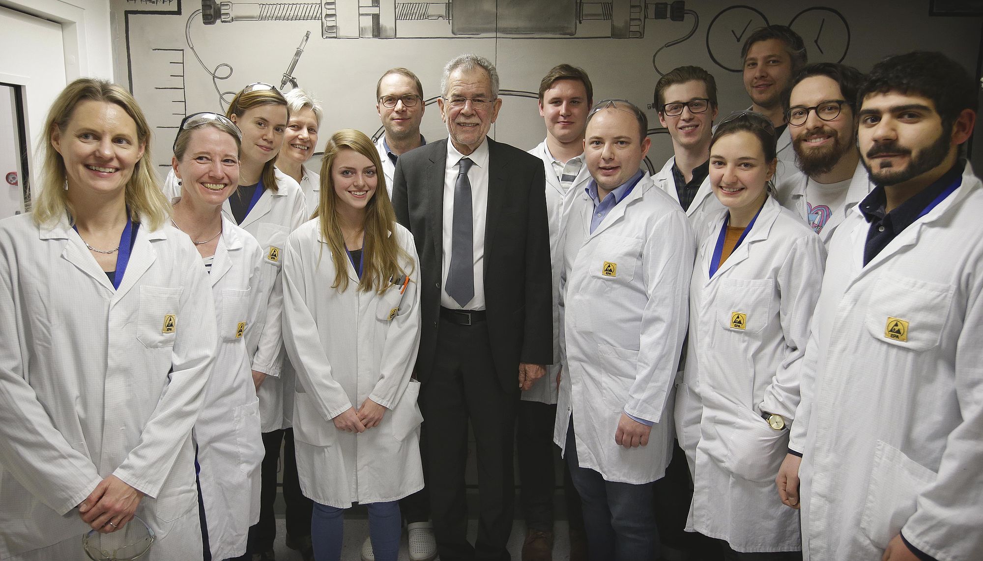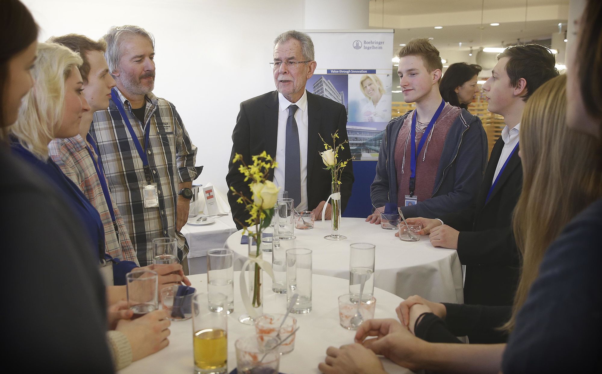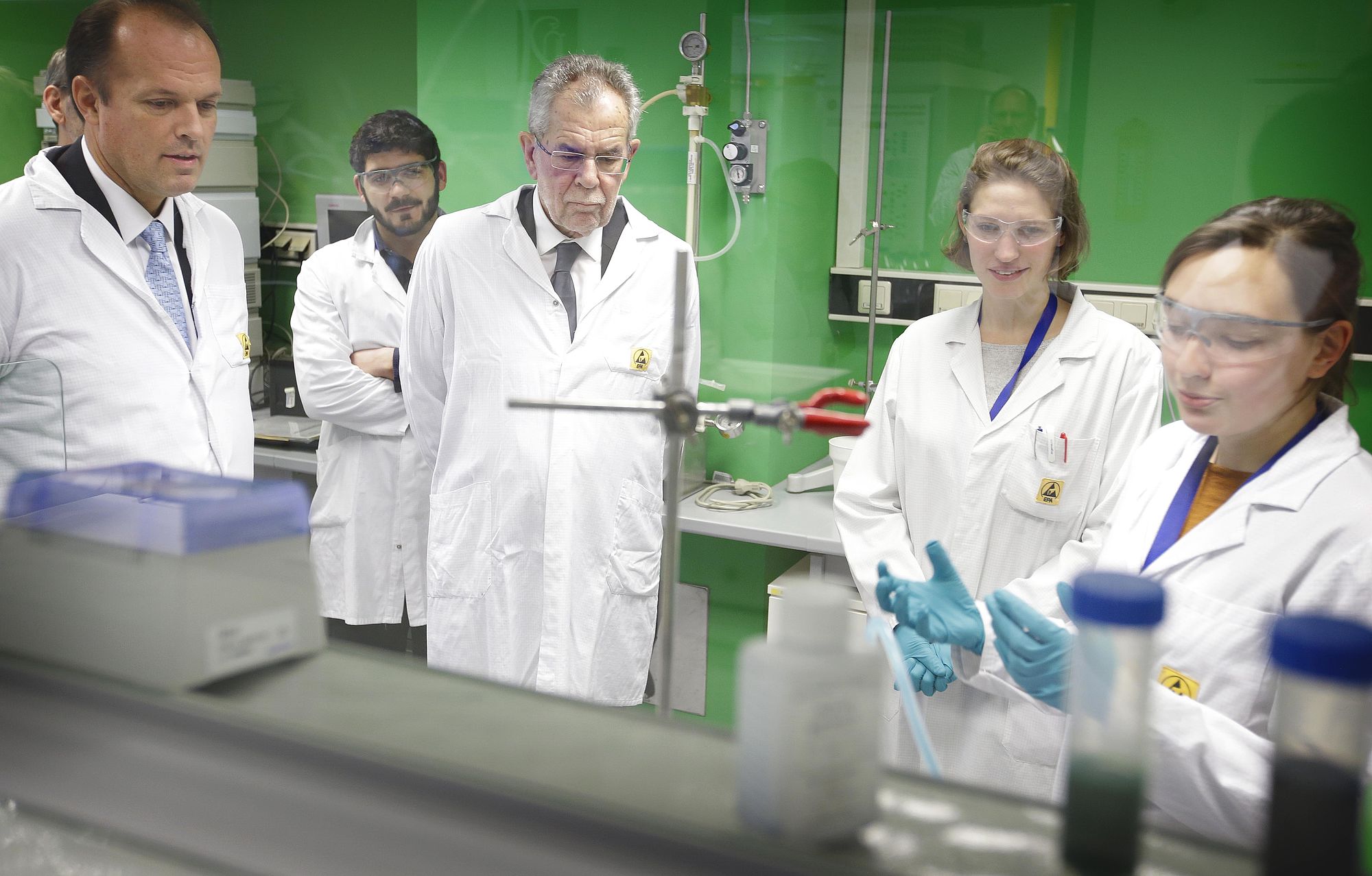 Bei seinem ersten Betriebsbesuch trifft der Bundespräsident in der Firma Boehringer Ingelheim mit den Lehrlingen zusammen und besichtigt das Labor des Bereichs Biopharma Process Science.