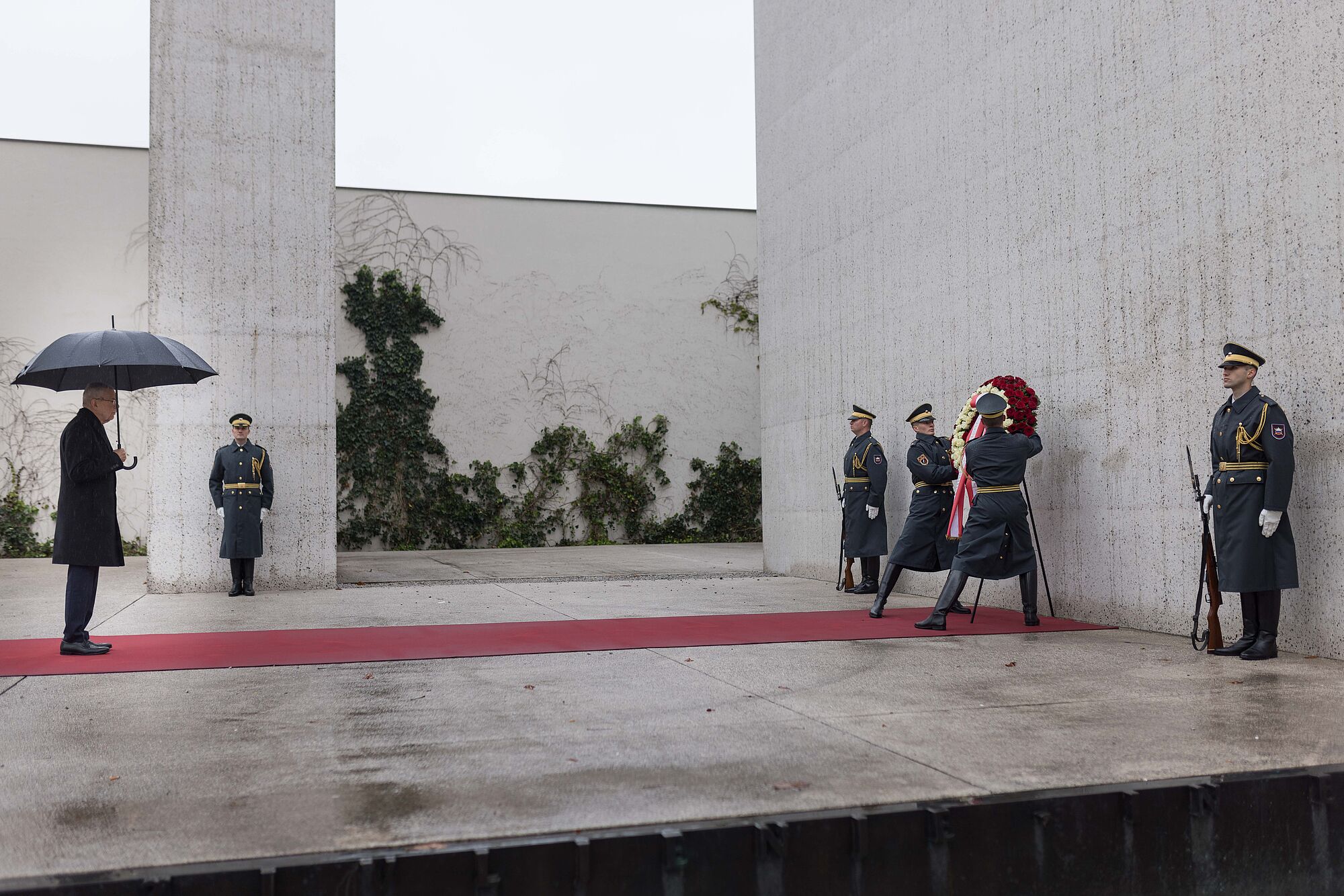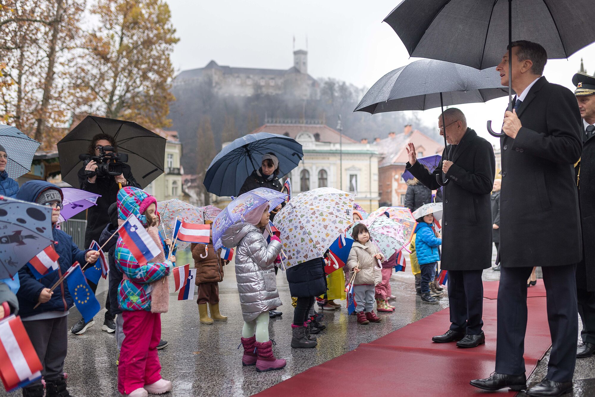 Borut Pahor empfing Alexander Van der Bellen mit militärischen Ehren auf dem Kongressplatz im Zentrum Ljubljanas. Er bereitete dem Bundespräsidenten einen ebenso betont herzlichen Empfang wie bei Alexander Van der Bellens Antrittsbesuch im Jahr 2017. Auch diesmal kam eine Gruppe von Kindergartenkindern auf den Kongressplatz, um slowenische, österreichische und europäische Fähnchen zu schwenken.
