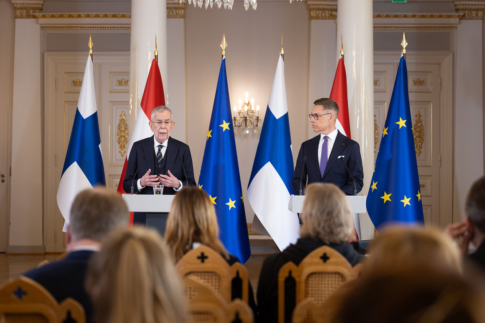 "Die Welt befindet sich im Umbruch." Angesichts dieser Erkenntnis müssten die Länder Europas "zusammenrücken und zu neuem Selbstvertrauen finden". Darin waren sich Bundespräsident Alexander Van der Bellen und sein finnischer Amtskollege Alexander Stubb am Donnerstag nach einem Treffen in Helsinki einig. "Unser vor Jahren noch so stabil schwimmendes Schiff befindet sich in einem Sturm", formulierte Alexander Van der Bellen. "Aber in einen Sturm muss man weiterrudern."