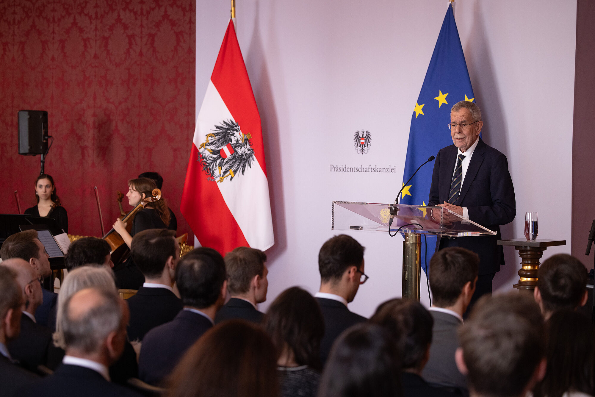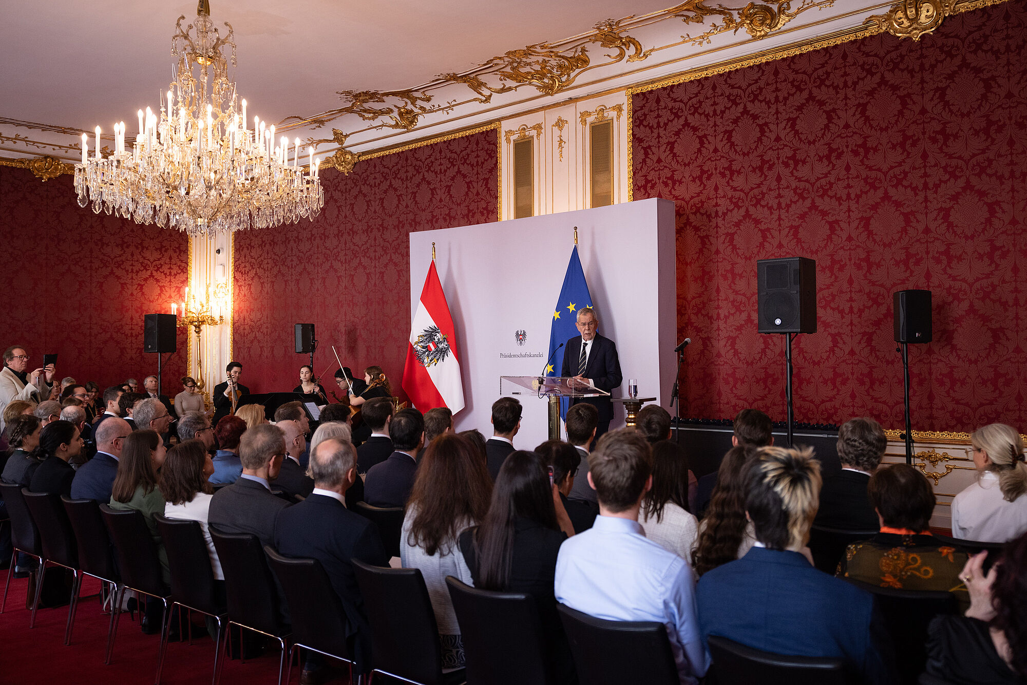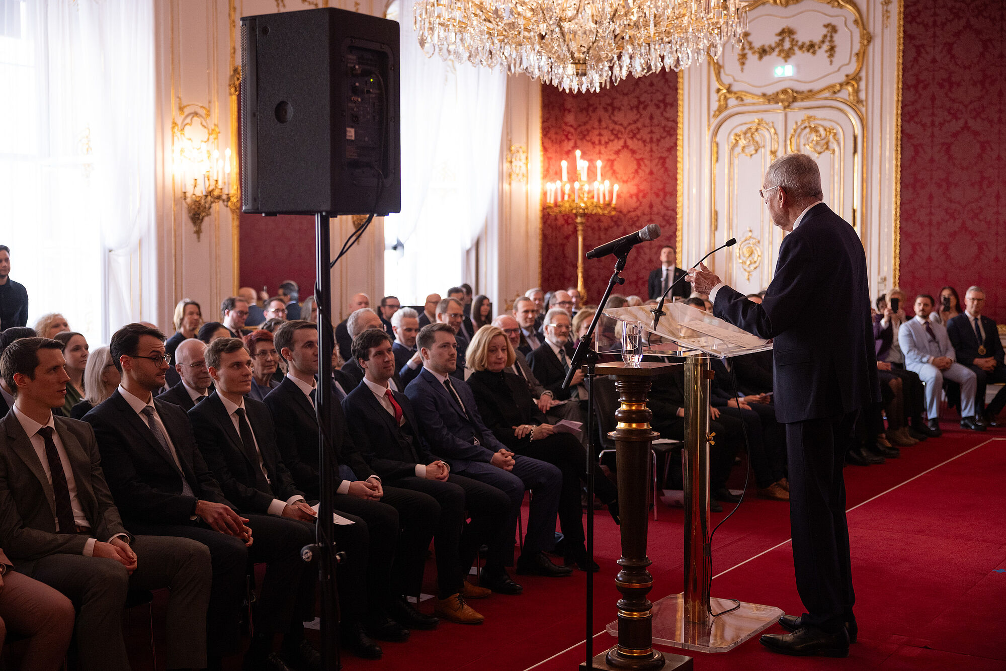 Bundespräsident Alexander Van der Bellen nutzte seine Rede in der Geheimen Ratsstube für ein Plädoyer für eigenständiges, kritisches Denken gerade auch in Zeiten von Künstlicher Intelligenz. Die KI könne vielleicht große Datenmengen effizienter analysieren. Ob sie aber Neugier kenne oder den Drang, Dinge zu verstehen, etwas Neues zu erschaffen oder Verantwortung zu übernehmen, stellte der Bundespräsident in Frage. "Sie bringen all diese Fähigkeiten in höchstem Maße mit. Ihre akademischen Leistungen sind auch deshalb so viel wert, weil sie ihre eigenen sind", so Van der Bellen in Richtung der Ausgezeichneten. Es sei ein Qualitätsmerkmal von Wissenschaft, unsicher zu sein und Antworten zuerst einmal nicht zu wissen und im Notfall auch alles umzukrempeln. Wissenschaft sei eine stetige Suche. "Sie alle tragen mit Ihrer Leistung dazu bei, dass wir es eben immer besser wissen."