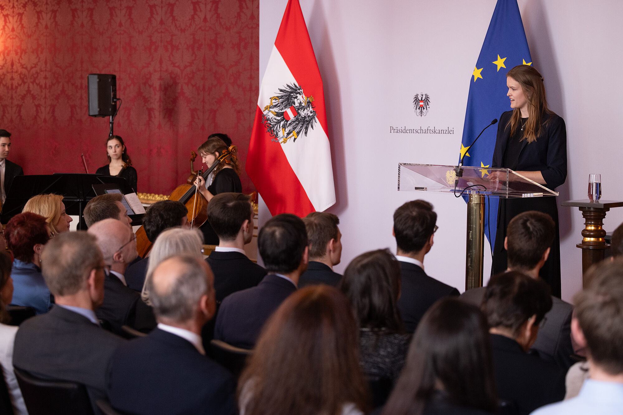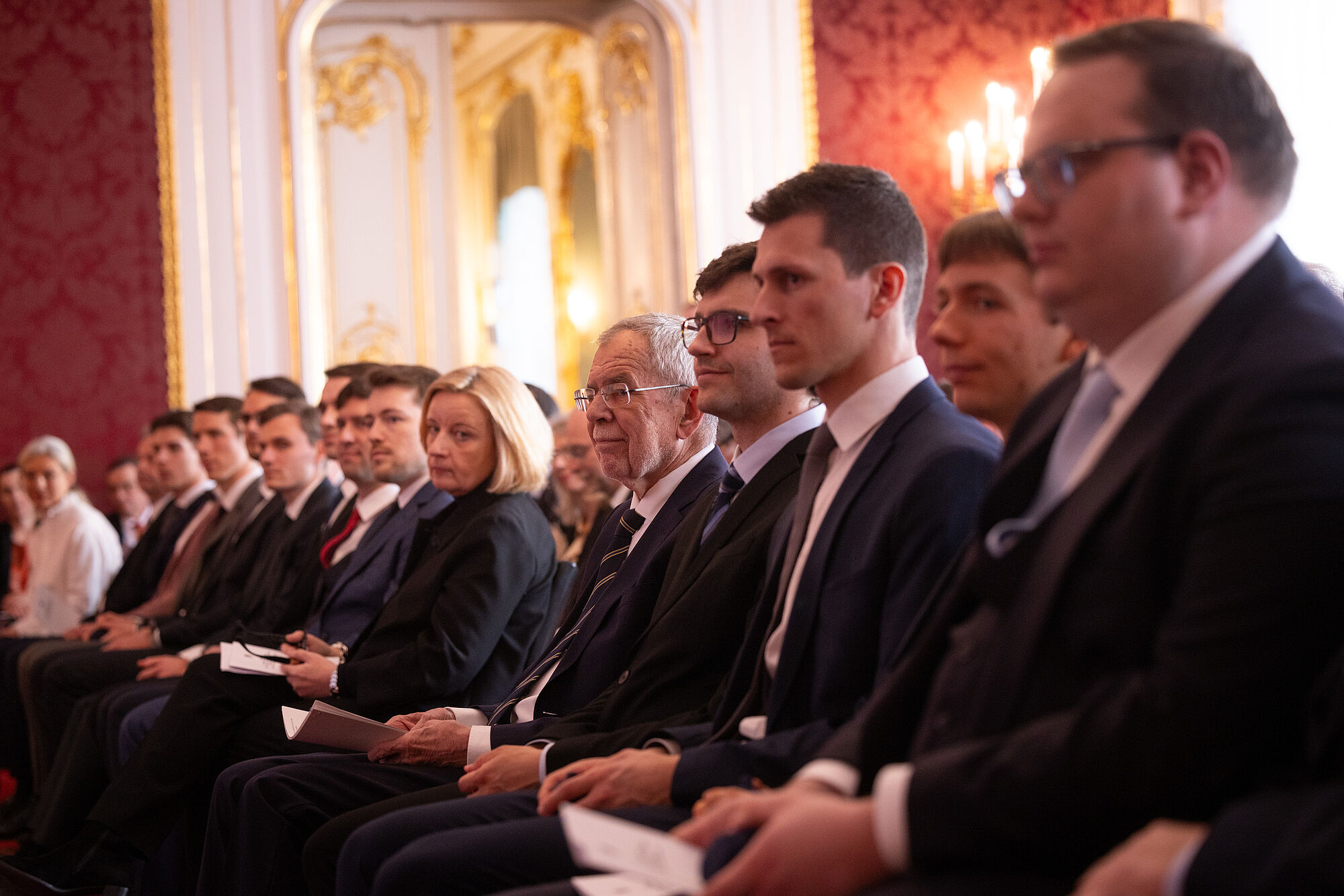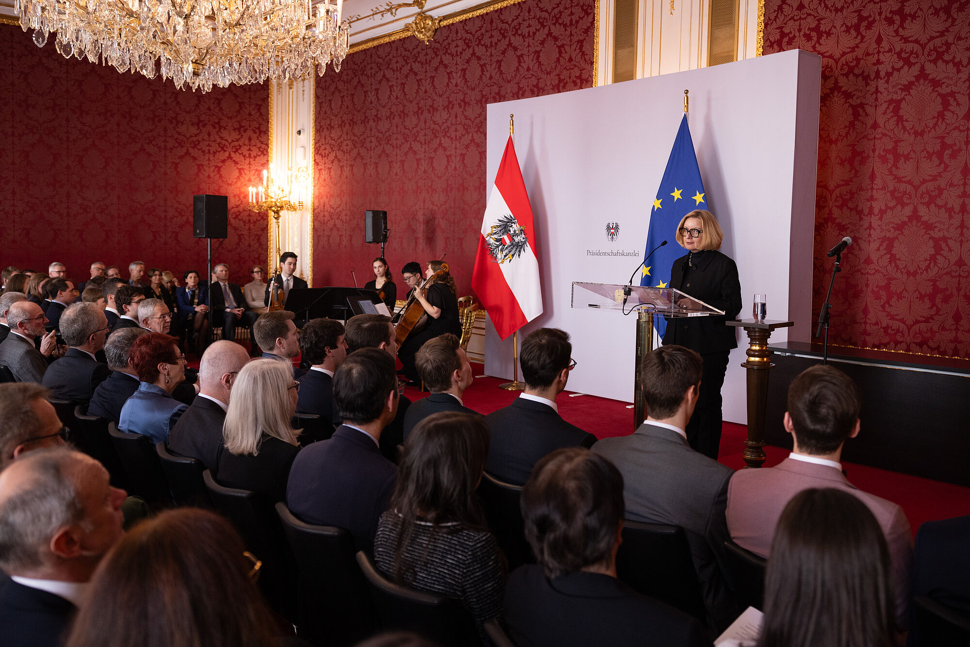 Bundespräsident Alexander Van der Bellen nutzte seine Rede in der Geheimen Ratsstube für ein Plädoyer für eigenständiges, kritisches Denken gerade auch in Zeiten von Künstlicher Intelligenz. Die KI könne vielleicht große Datenmengen effizienter analysieren. Ob sie aber Neugier kenne oder den Drang, Dinge zu verstehen, etwas Neues zu erschaffen oder Verantwortung zu übernehmen, stellte der Bundespräsident in Frage. "Sie bringen all diese Fähigkeiten in höchstem Maße mit. Ihre akademischen Leistungen sind auch deshalb so viel wert, weil sie ihre eigenen sind", so Van der Bellen in Richtung der Ausgezeichneten. Es sei ein Qualitätsmerkmal von Wissenschaft, unsicher zu sein und Antworten zuerst einmal nicht zu wissen und im Notfall auch alles umzukrempeln. Wissenschaft sei eine stetige Suche. "Sie alle tragen mit Ihrer Leistung dazu bei, dass wir es eben immer besser wissen."