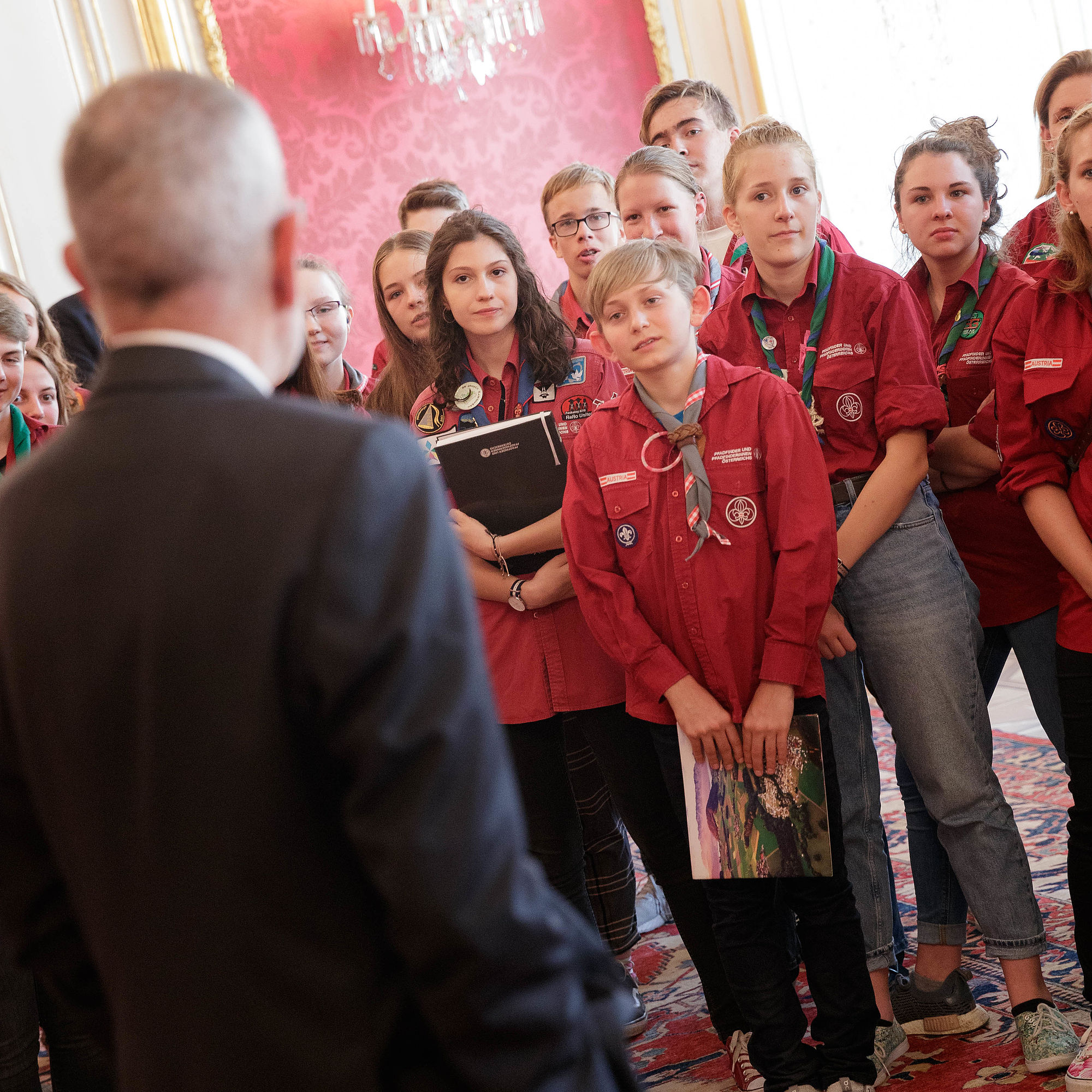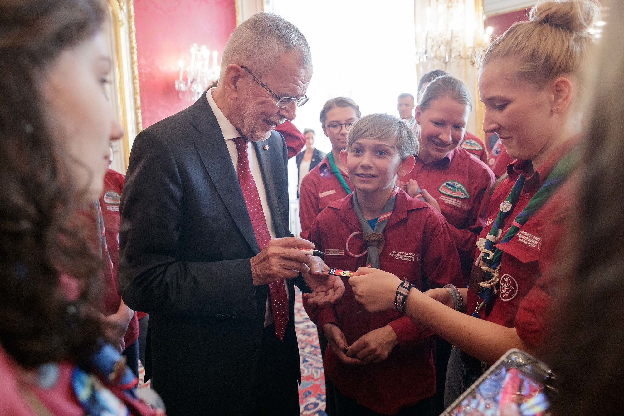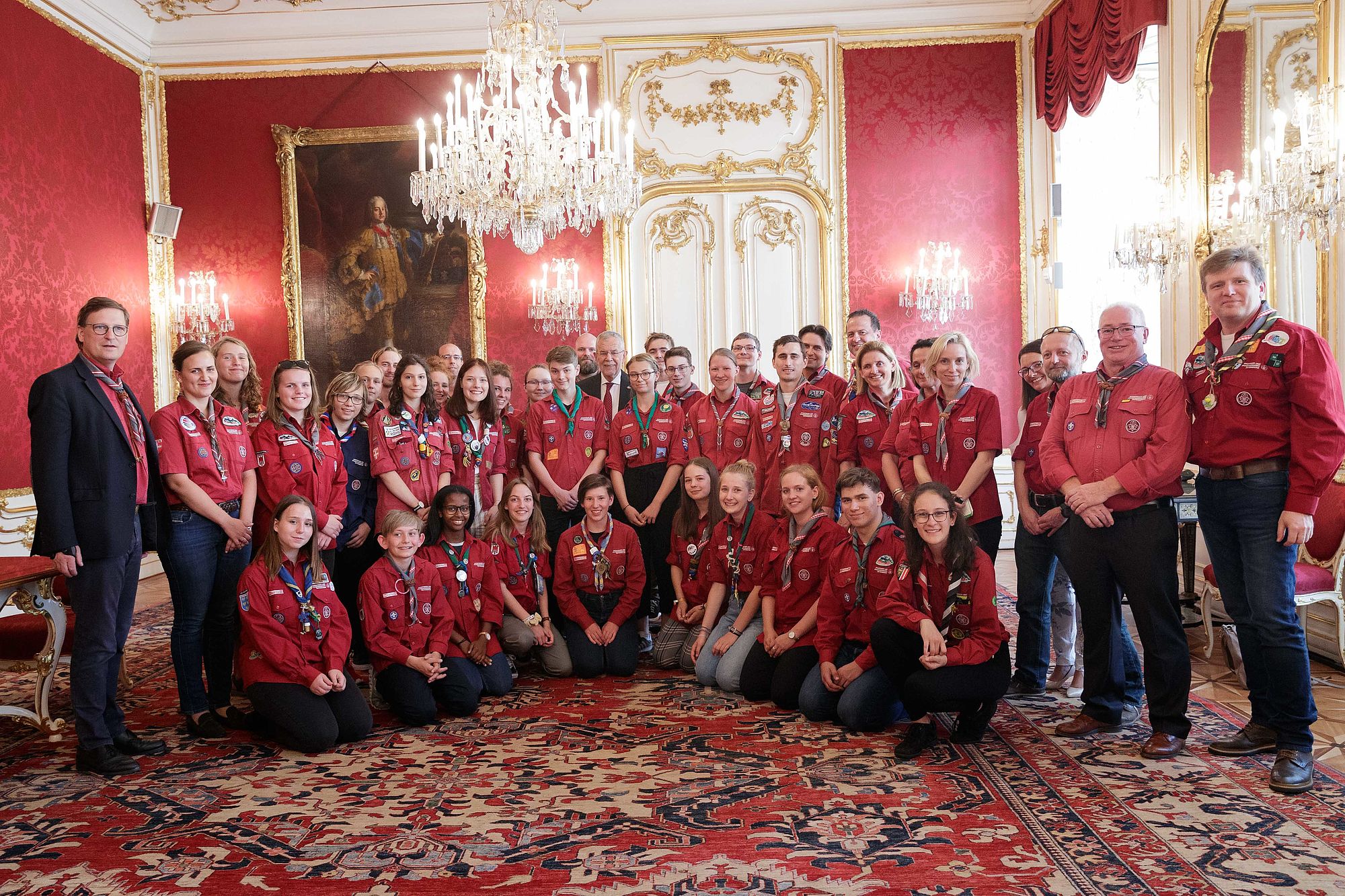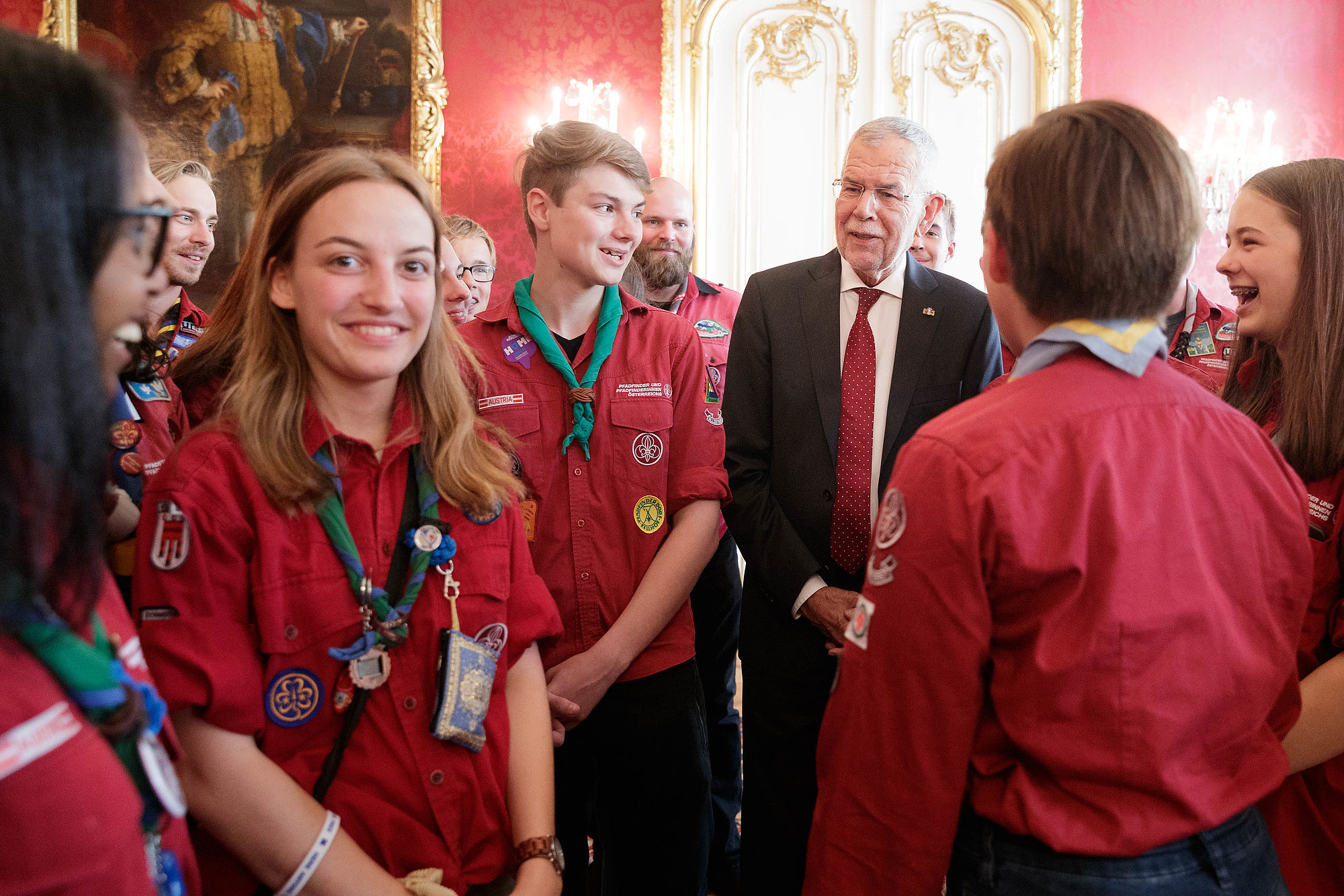 Bundespräsident Alexander Van der Bellen traf rund 45 Pfadfinderinnen und Pfadfinder aus ganz Österreich in der Hofburg. Der Grund für den Besuch war die offizielle Verabschiedung der Delegation der österreichischen Jamboreeteilnehmerinnen und -teilnehmer anlässlich des Abfluges zum 24. World Scout Jamboree nach West Virginia.