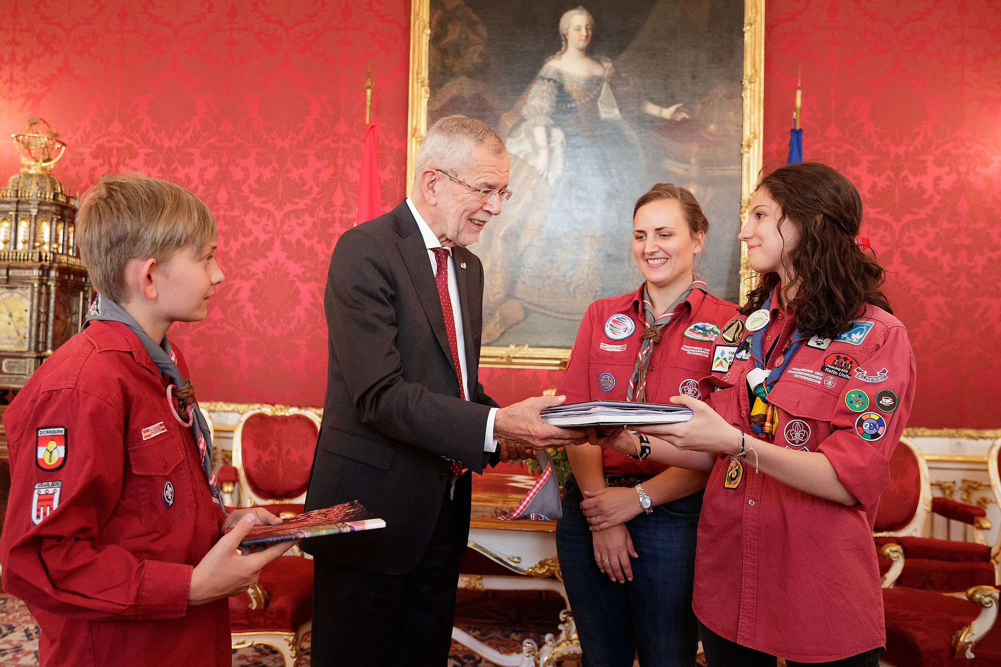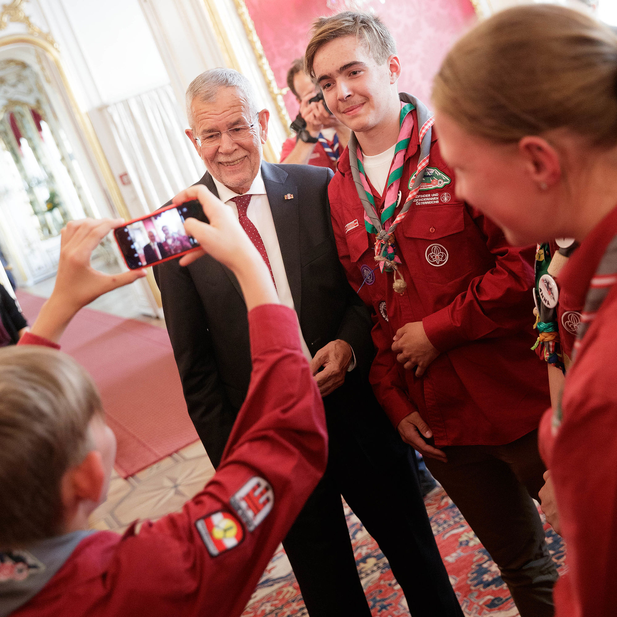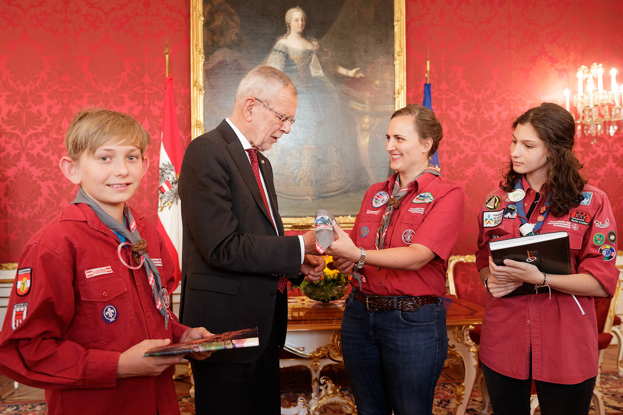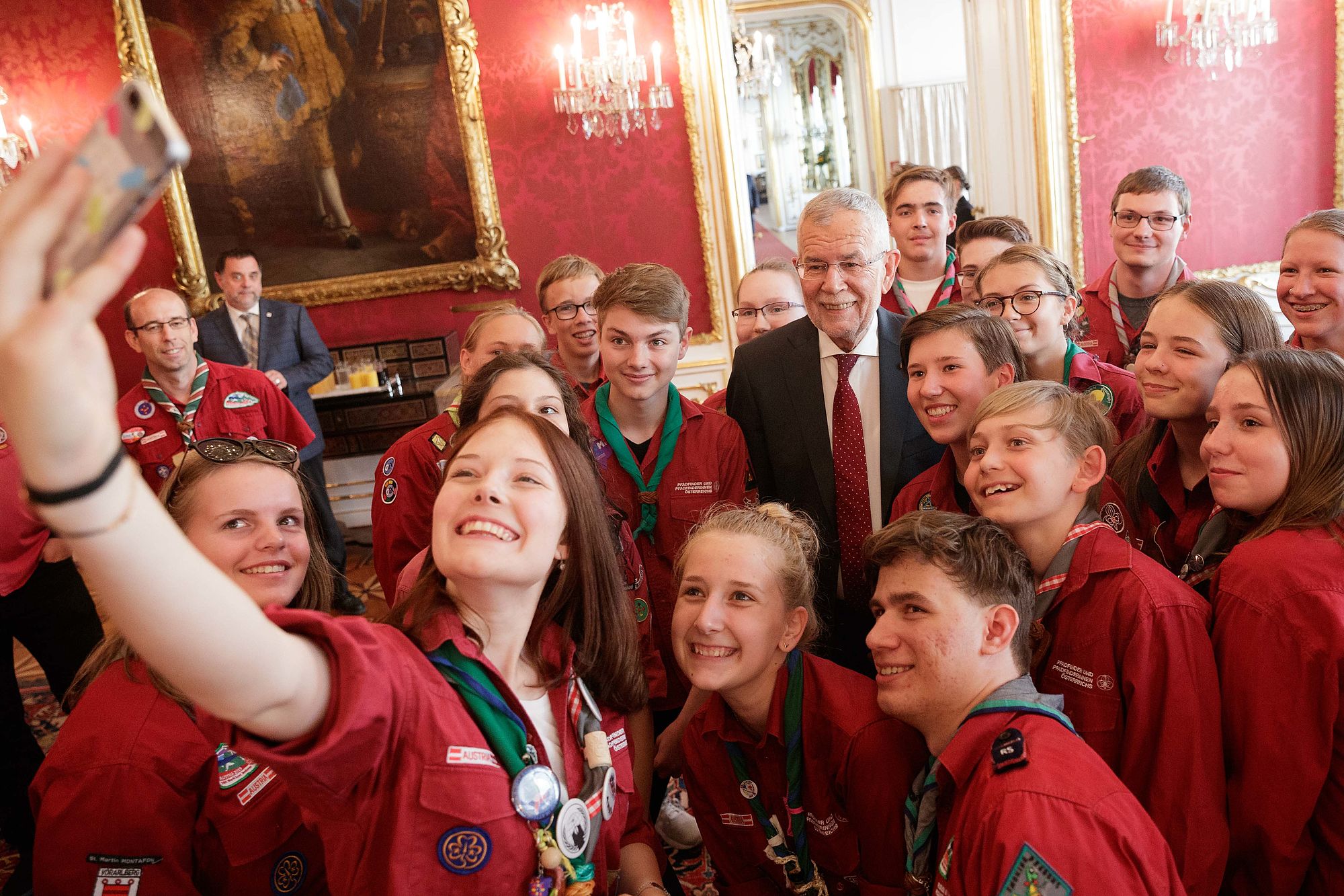 Bundespräsident Alexander Van der Bellen traf rund 45 Pfadfinderinnen und Pfadfinder aus ganz Österreich in der Hofburg. Der Grund für den Besuch war die offizielle Verabschiedung der Delegation der österreichischen Jamboreeteilnehmerinnen und -teilnehmer anlässlich des Abfluges zum 24. World Scout Jamboree nach West Virginia.