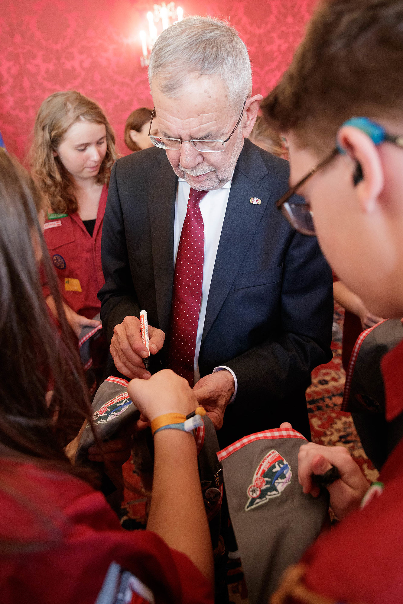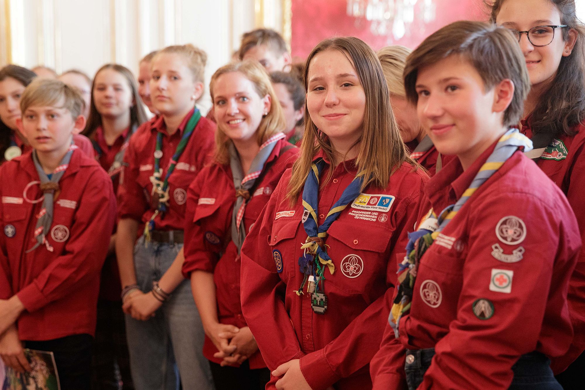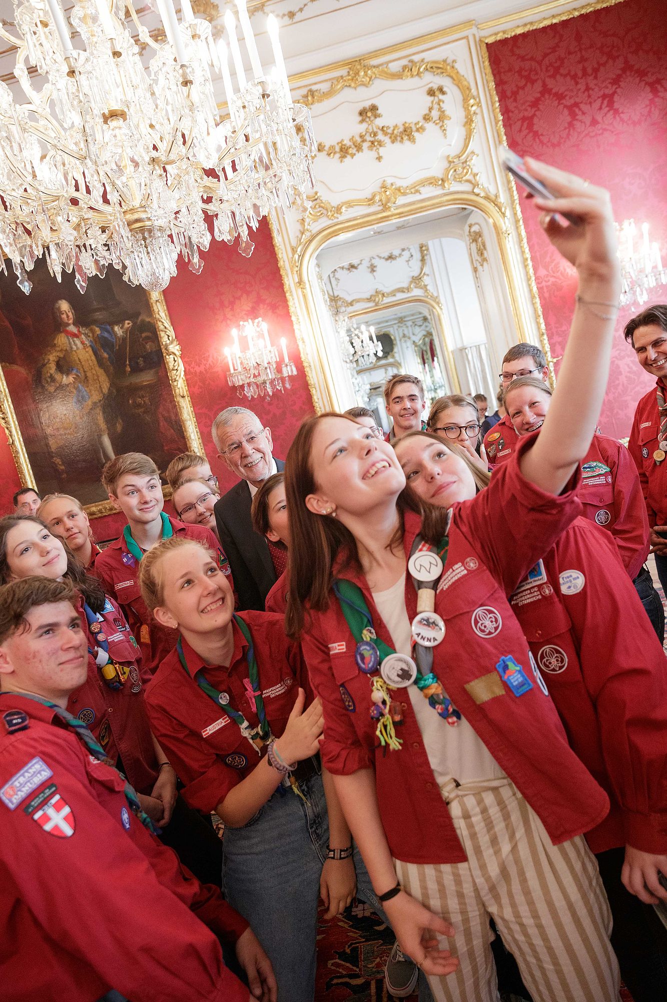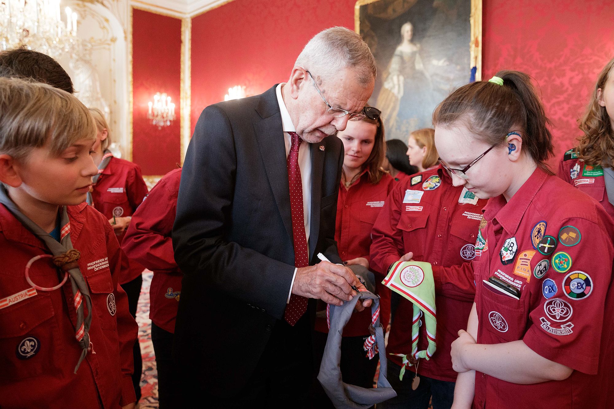 Bundespräsident Alexander Van der Bellen traf rund 45 Pfadfinderinnen und Pfadfinder aus ganz Österreich in der Hofburg. Der Grund für den Besuch war die offizielle Verabschiedung der Delegation der österreichischen Jamboreeteilnehmerinnen und -teilnehmer anlässlich des Abfluges zum 24. World Scout Jamboree nach West Virginia.