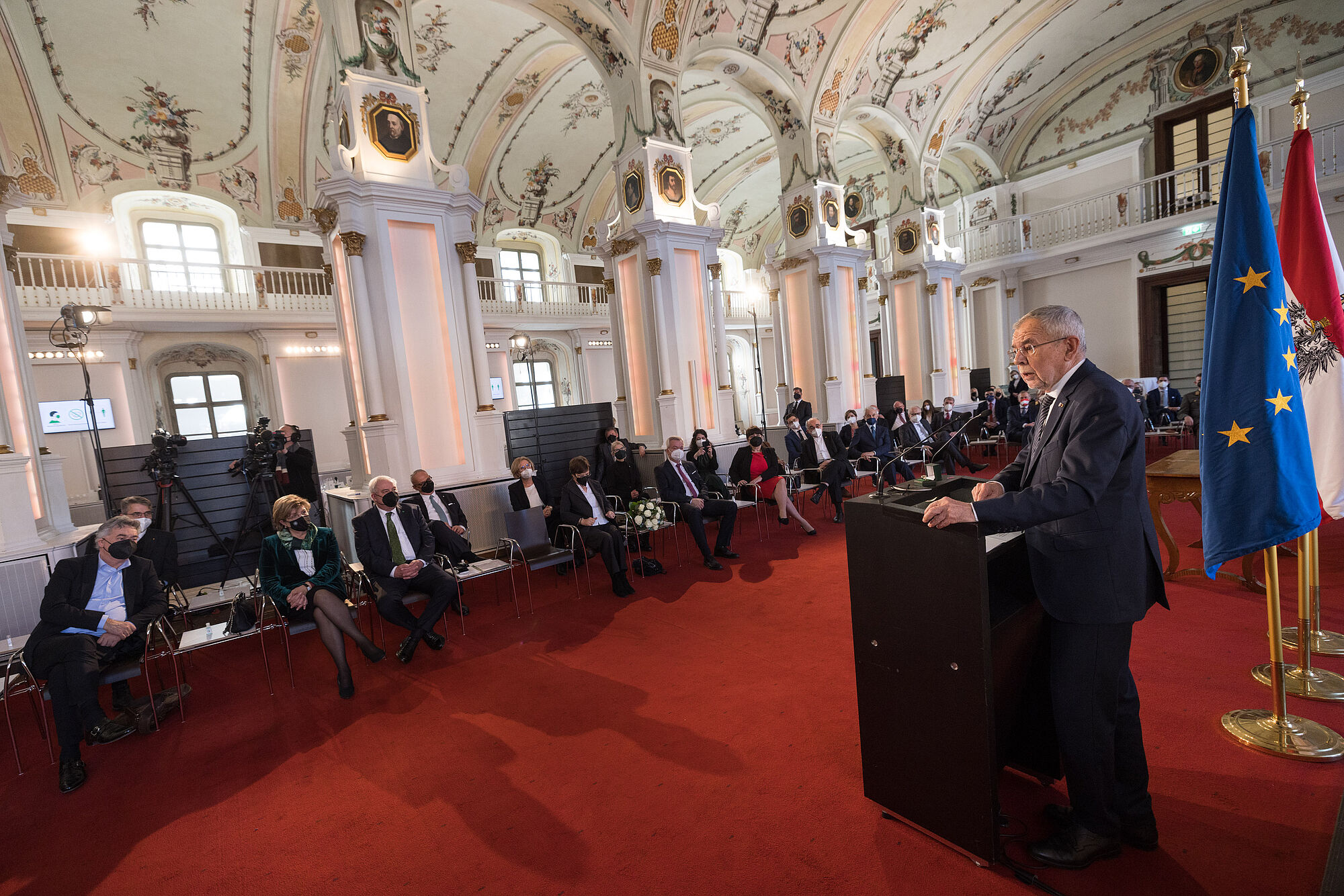 Zum aktuellen politischen Geschehen äußerte sich Bundespräsident Van der Bellen nur kurz: "Wir leben in einer liberalen Demokratie und manche Freunde und Kollegen, und andere die uns SMS, Briefe oder Mails schreiben, meinen, wir leben in einer Diktatur. Ich würde gerne verstehen, warum. Man darf demonstrieren, man darf die Meinung frei äußern, es kann jeder auf seine Weise Stellung nehmen. Streiten wir uns, ja, dafür ist eine Demokratie da, aber nicht über etwas, das offenkundig nicht stimmt."