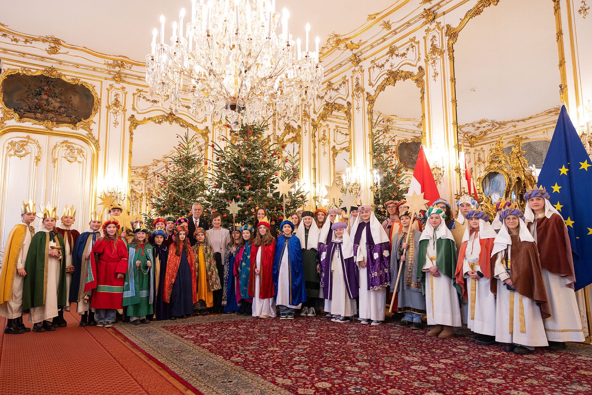 Nicht nur drei sondern, gleich ein paar dutzend "Heilige drei Könige" haben am Freitag Bundespräsident Alexander Van der Bellen und seiner Frau Doris Schmidauer Segensgrüße überbracht. Die Delegation umfasste Sternsinger aus dem ganzen Land, von Unterwart im Burgenland bis Weiler in Vorarlberg. Auch eine Gastgruppe aus Südtirol trat die Reise in die Präsidentschaftskanzlei an.