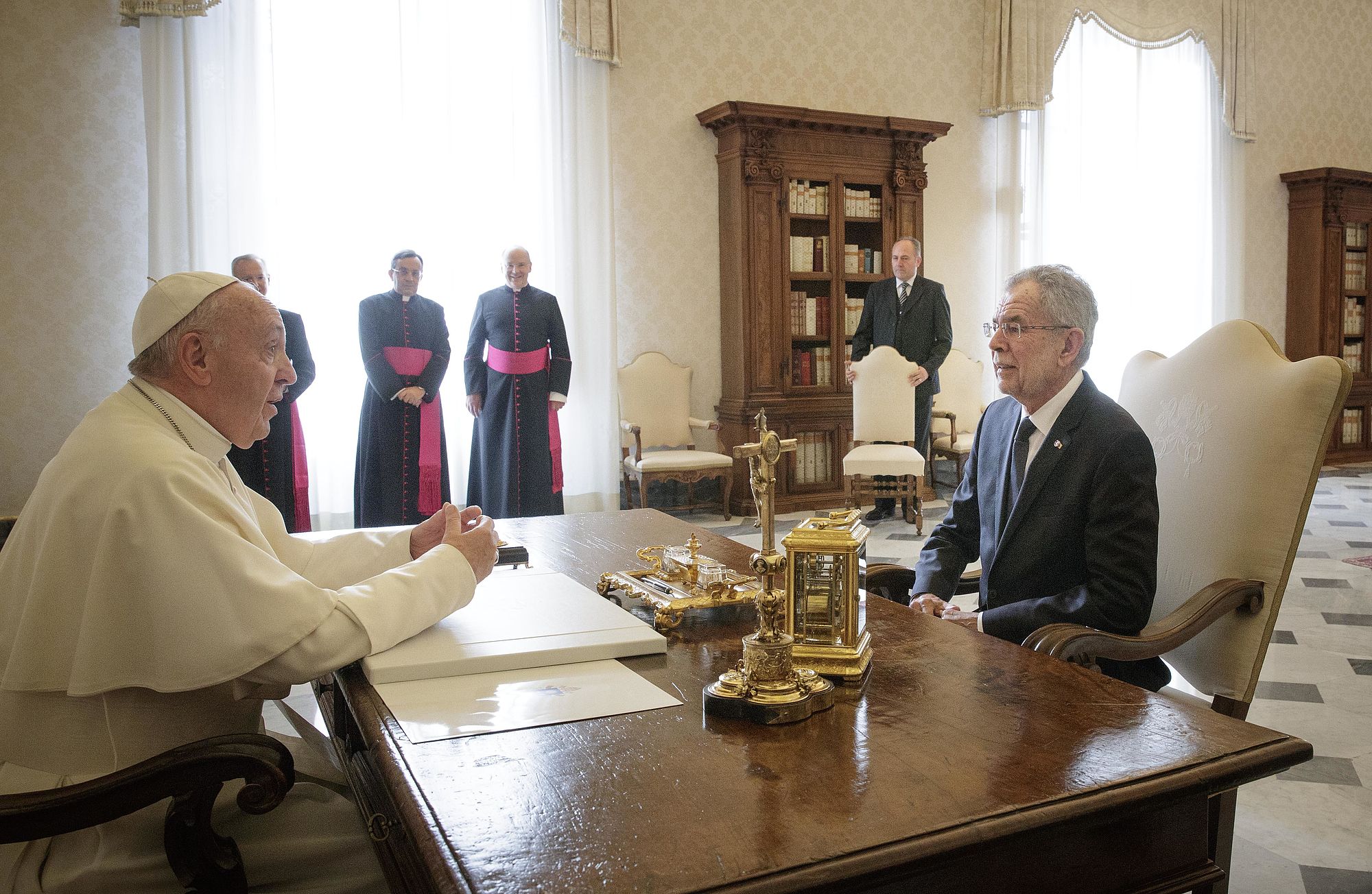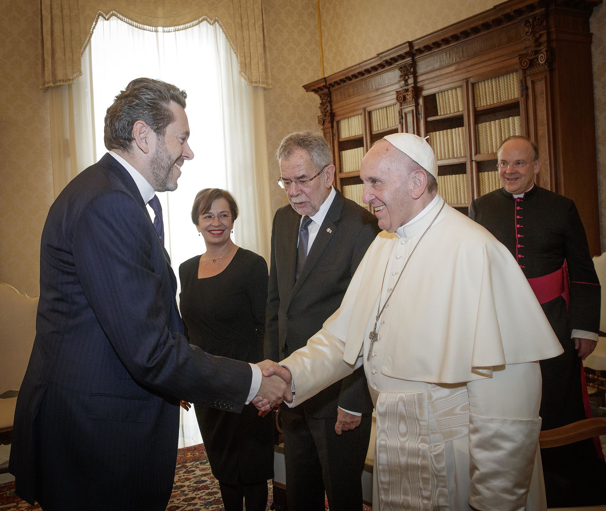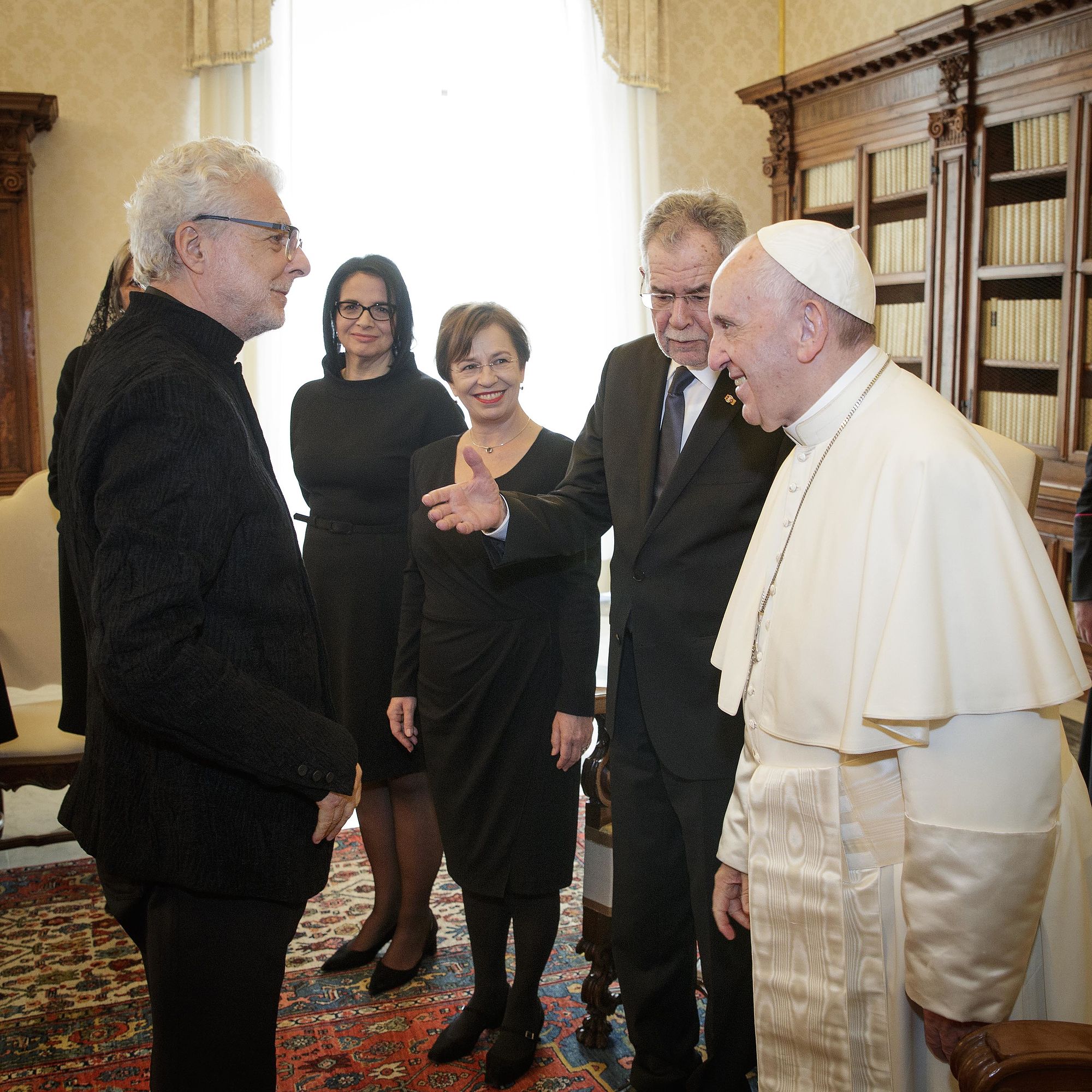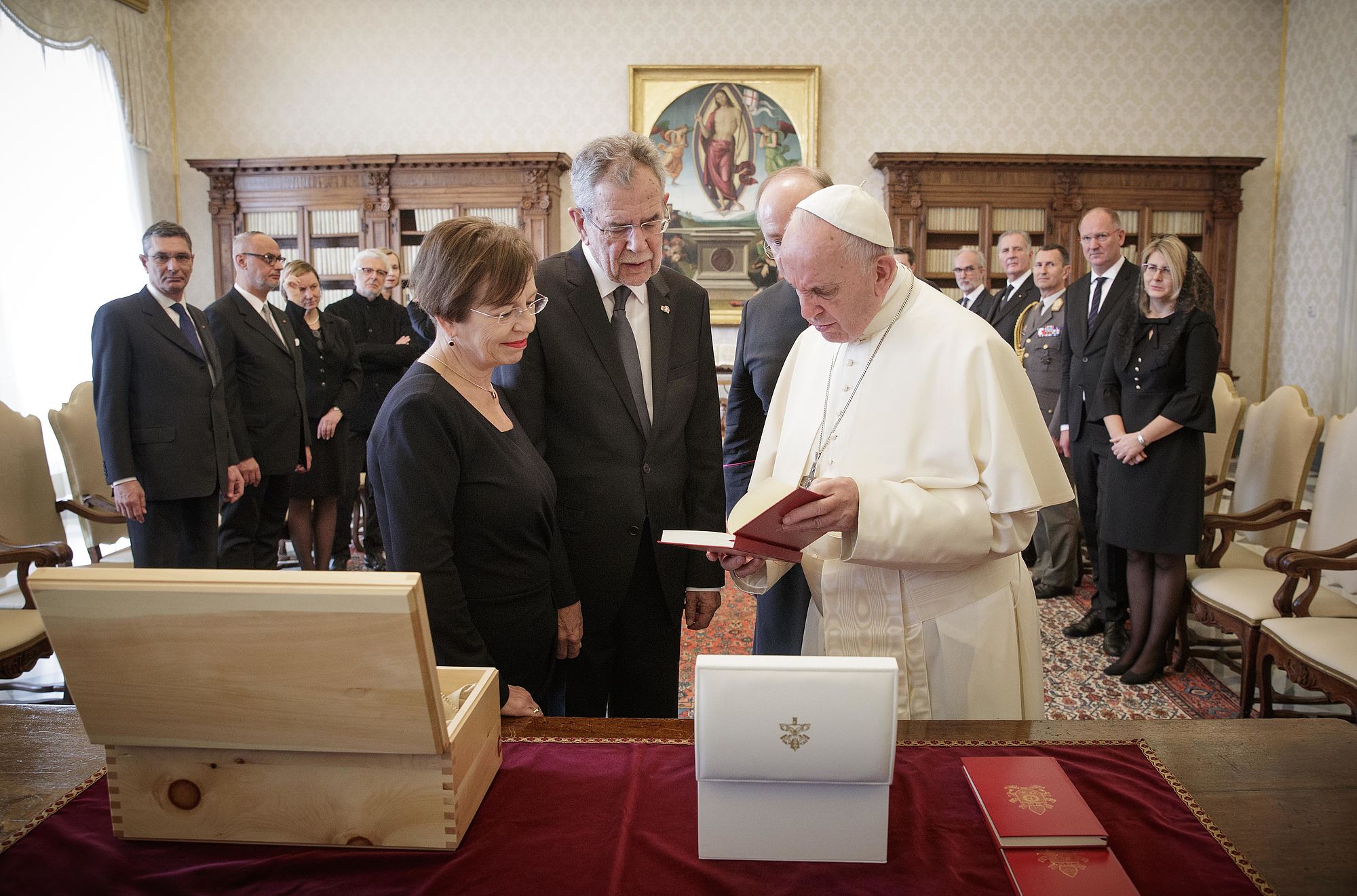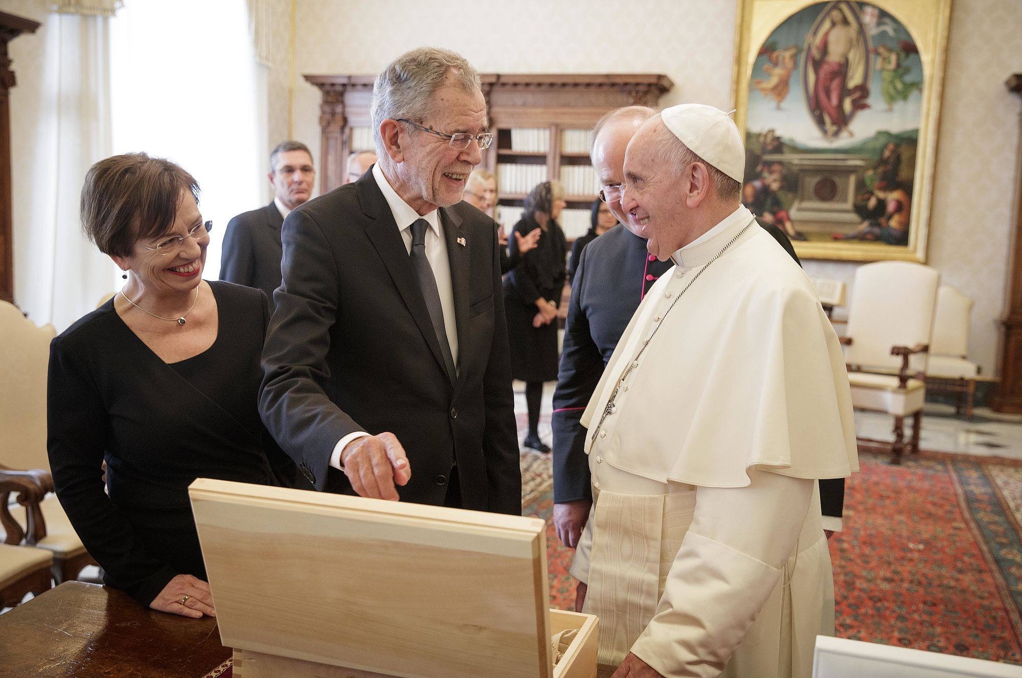 Bundespräsident Van der Bellen wurde gemeinsam mit seiner Frau Doris Schmidauer, die auf den bei Papst-Audienzen früher üblichen Schleier verzichtete, in Begleitung von Noch-Wirtschaftsminister und designiertem Wirtschaftskammerpräsidenten Harald Mahrer und dem Künstler André Heller empfangen. Er erhielt seinerseits eine Medaille des Pontifikats von Franziskus, auf der als Friedenssymbol die Darstellung einer Taube mit Olivenzweig im Schnabel zu sehen ist, sowie eine deutschsprachige Ausgabe seiner apostolischen Schreiben "Amoris Laetitia", "Evangelii Gaudium" und "Laudato Si'".
