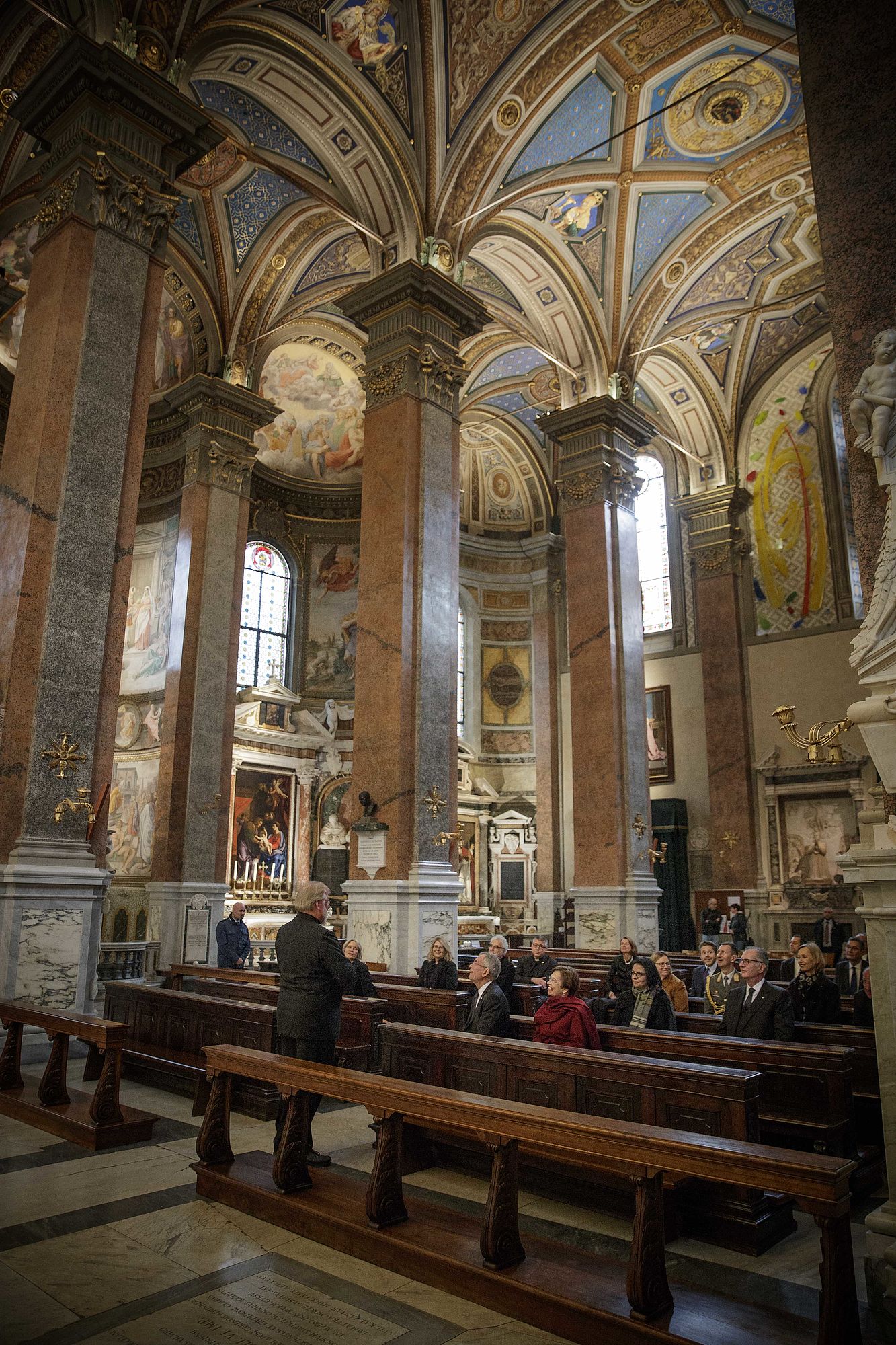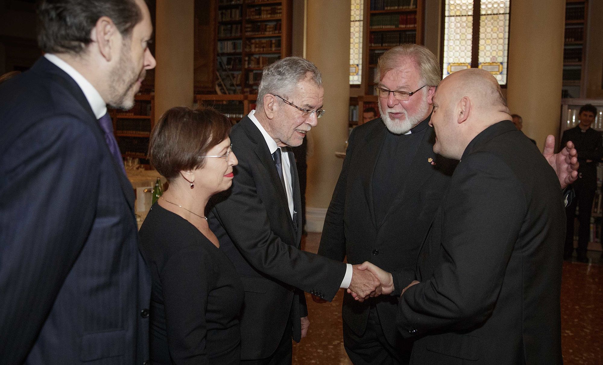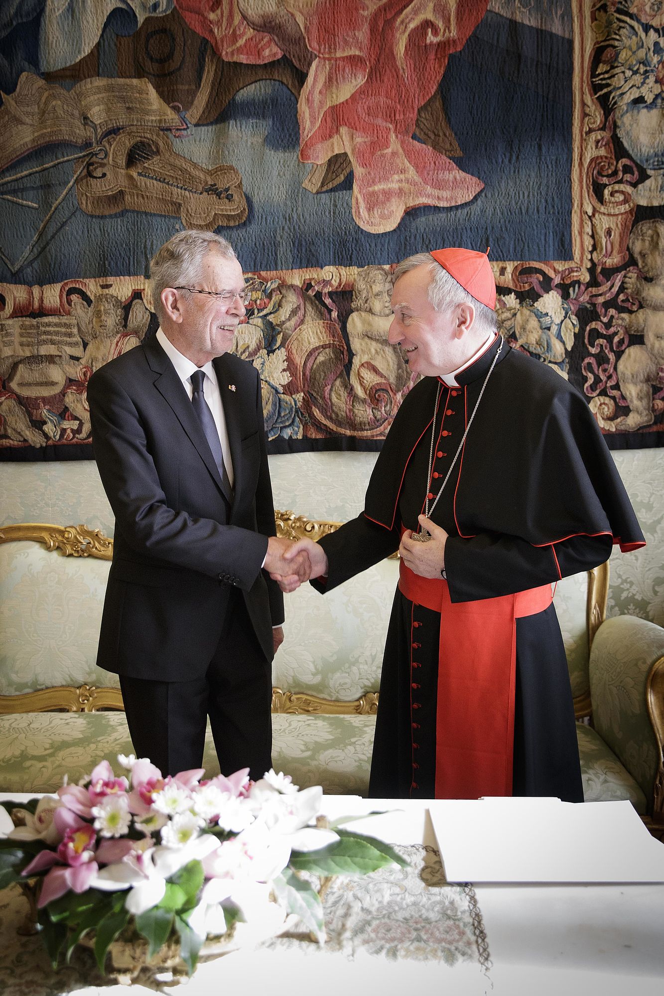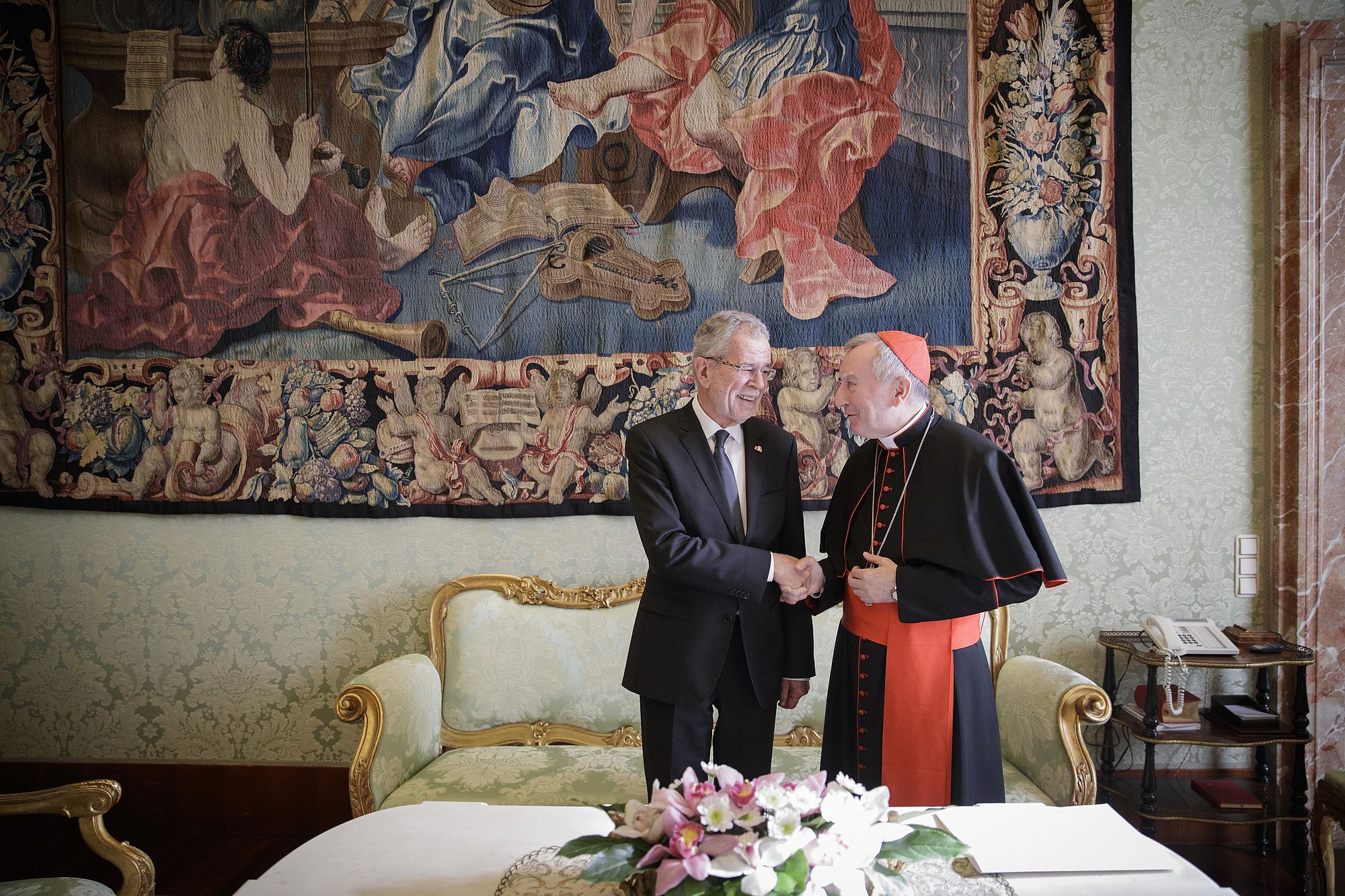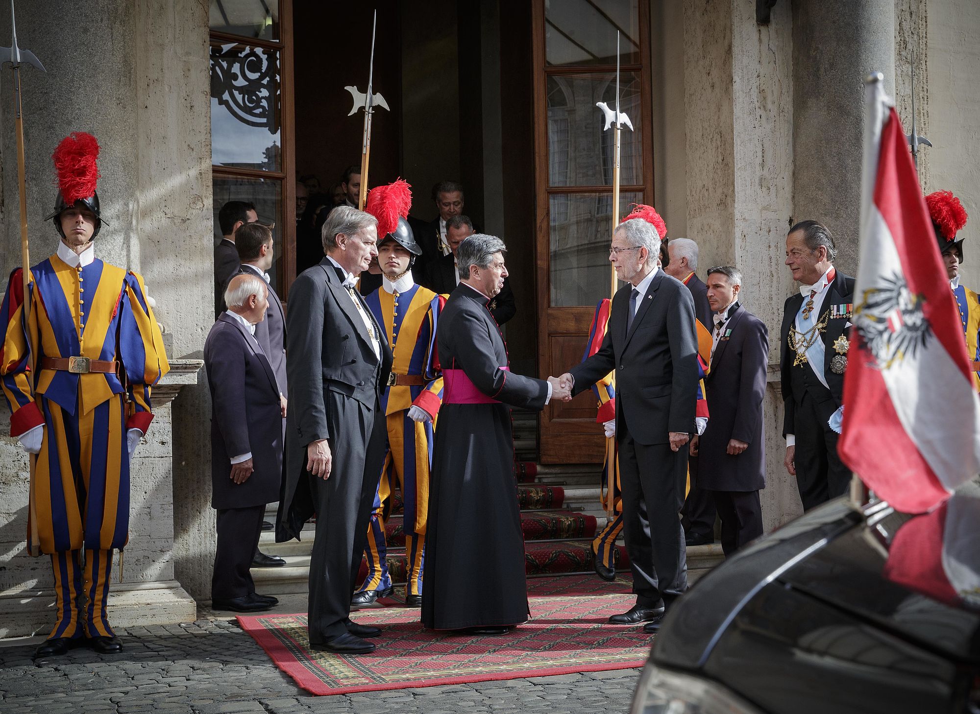 Bundespräsident Van der Bellen wurde gemeinsam mit seiner Frau Doris Schmidauer, die auf den bei Papst-Audienzen früher üblichen Schleier verzichtete, in Begleitung von Noch-Wirtschaftsminister und designiertem Wirtschaftskammerpräsidenten Harald Mahrer und dem Künstler André Heller empfangen. Er erhielt seinerseits eine Medaille des Pontifikats von Franziskus, auf der als Friedenssymbol die Darstellung einer Taube mit Olivenzweig im Schnabel zu sehen ist, sowie eine deutschsprachige Ausgabe seiner apostolischen Schreiben "Amoris Laetitia", "Evangelii Gaudium" und "Laudato Si'".