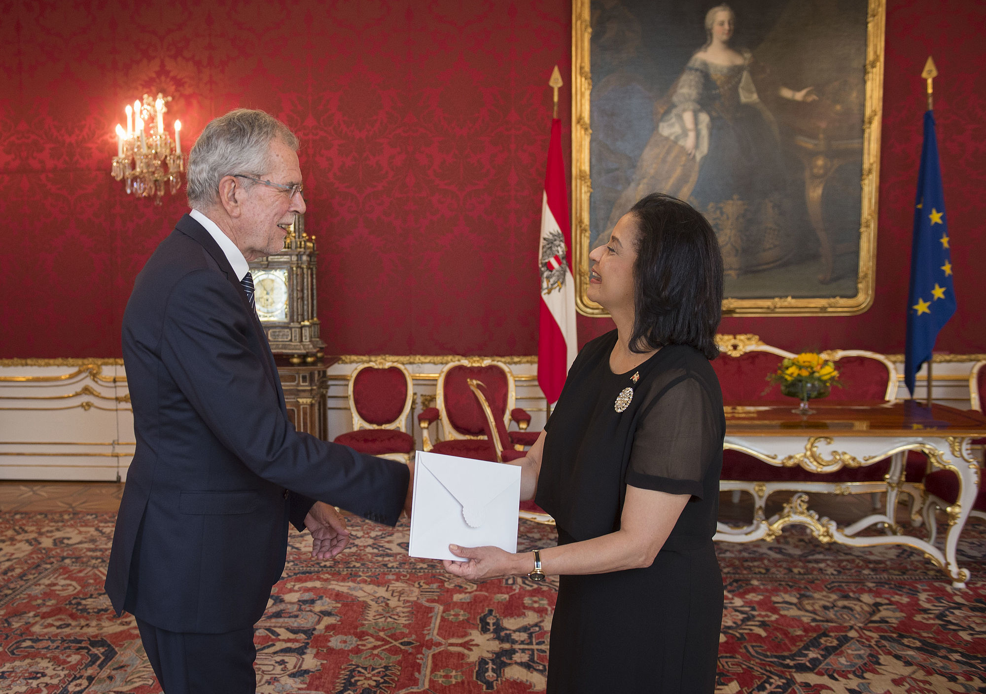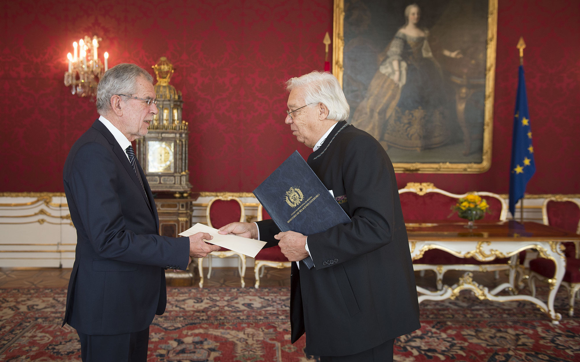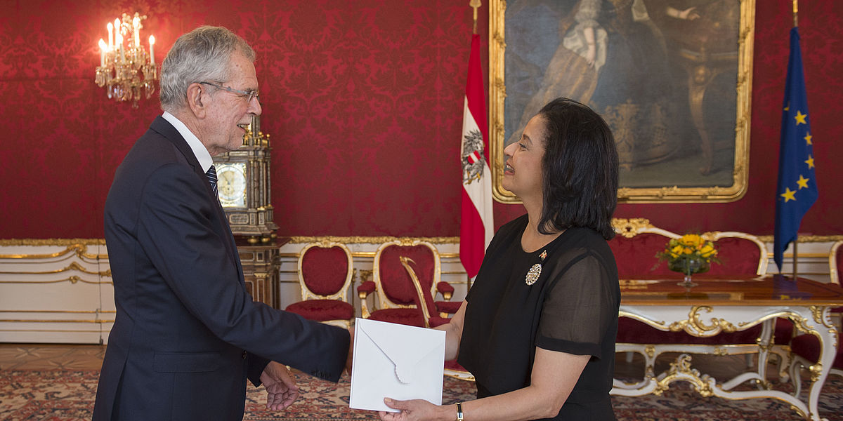 Die Botschafterin der Dominikanischen Republik sowie die Botschafter von Indonesien, der Republik Moldau, der Türkei, der Französischen Republik und des Plurinationalen Staates Bolivien überreichen ihre Beglaubigungsschreiben.
