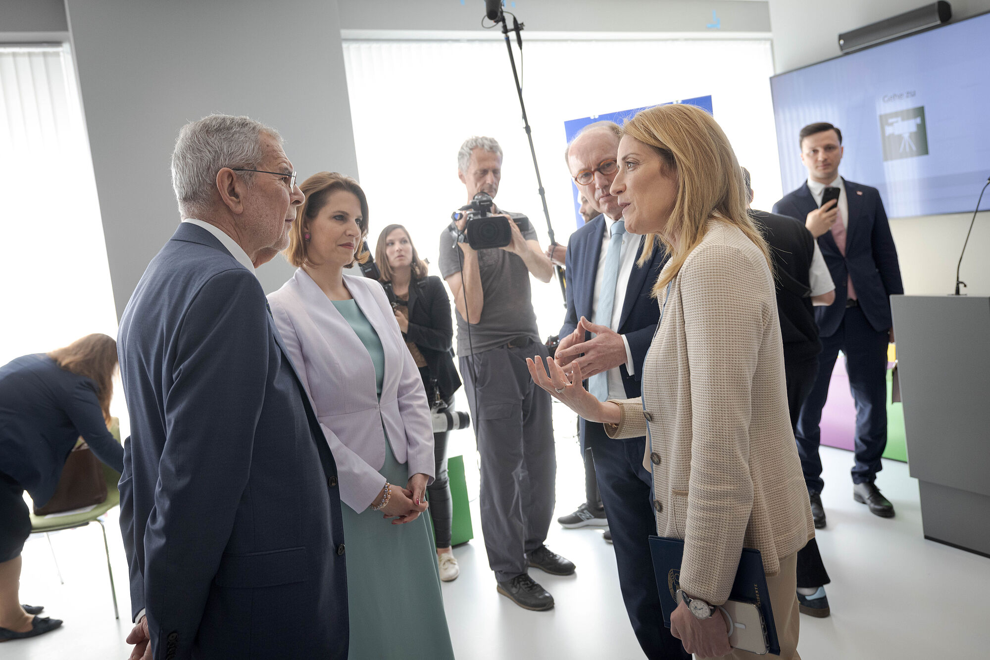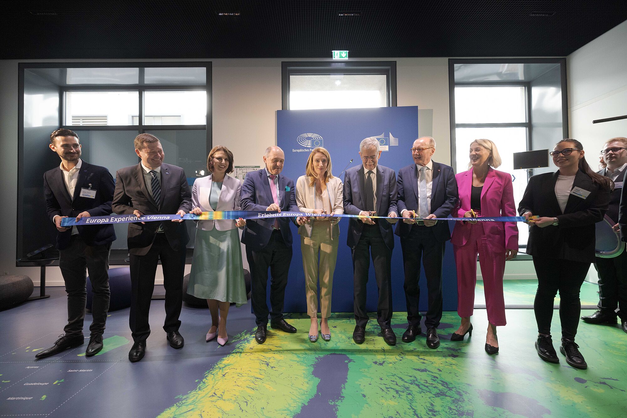 Der Bundespräsident eröffnet mit EU-Parlamentspräsidentin Roberta Metsola die interaktive Ausstellung »Erlebnis Europa« in Wien