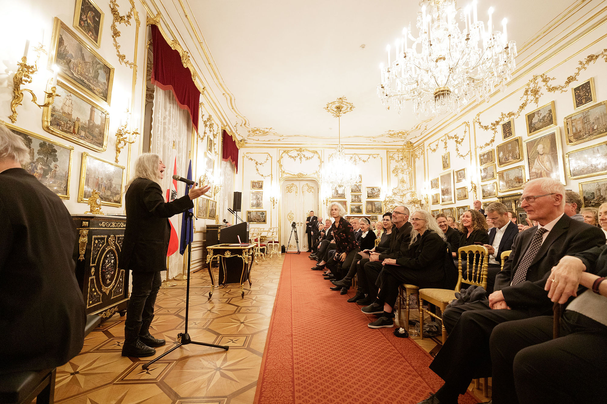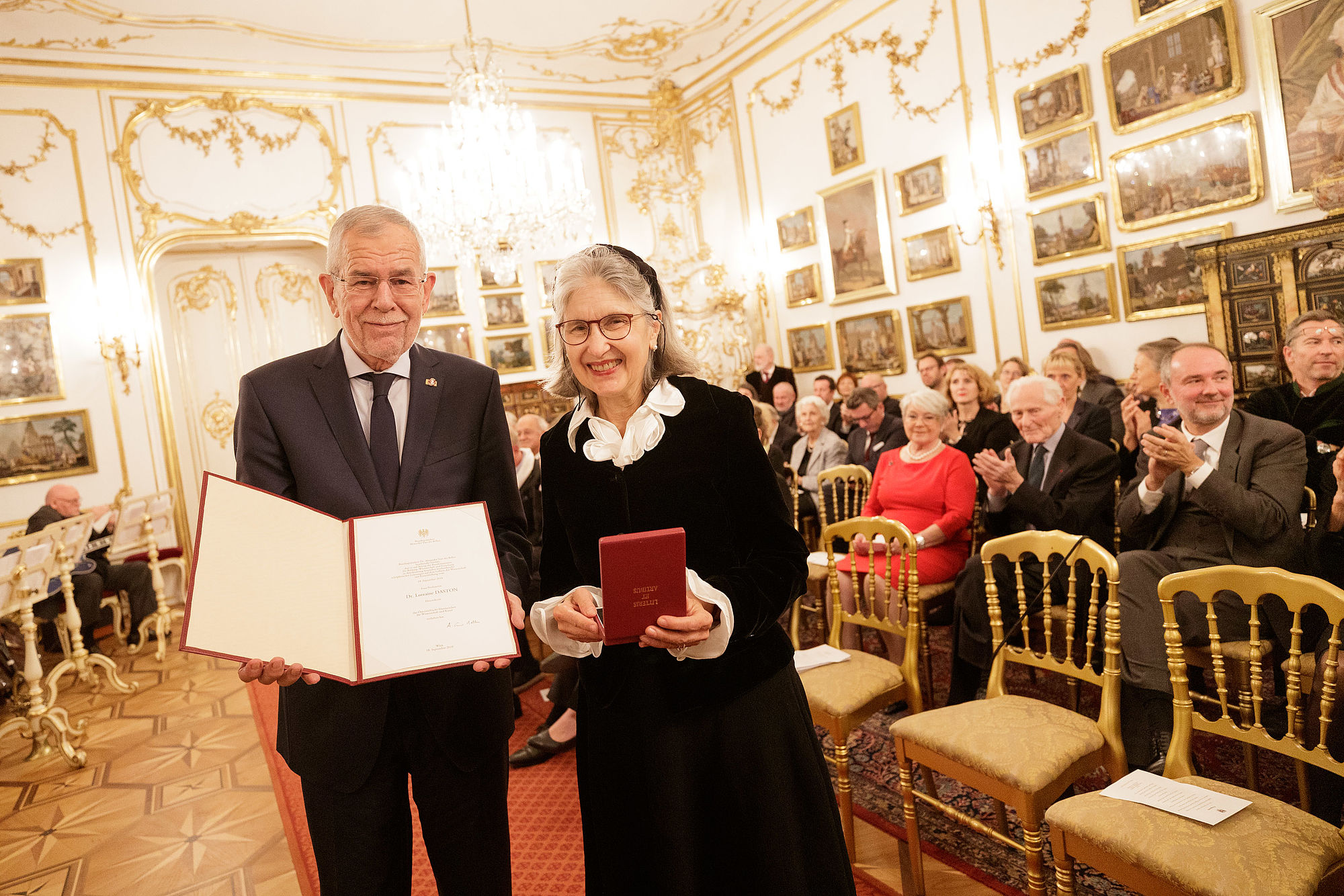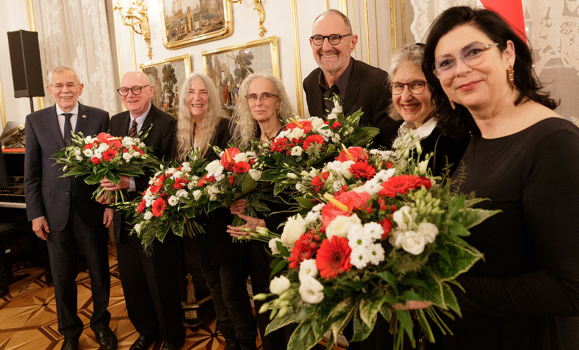 Bundespräsident Alexander Van der Bellen hat im Rahmen des jährlich stattfindenden Zusammentreffens mit den Mitgliedern der Kurie für Wissenschaft und Kunst das Österreichische Ehrenzeichen für Wissenschaft und Kunst an Lorraine Daston, Franz Koglmann, Eva Schlegl, Thom Mayne, Kiki Smith und Patti Smith überreicht.