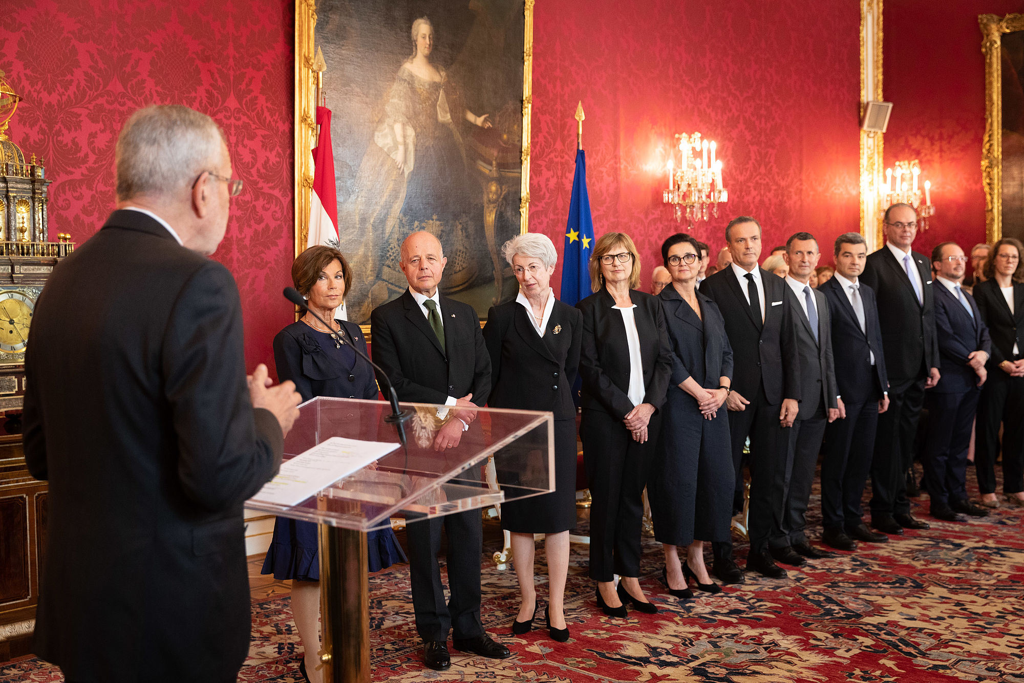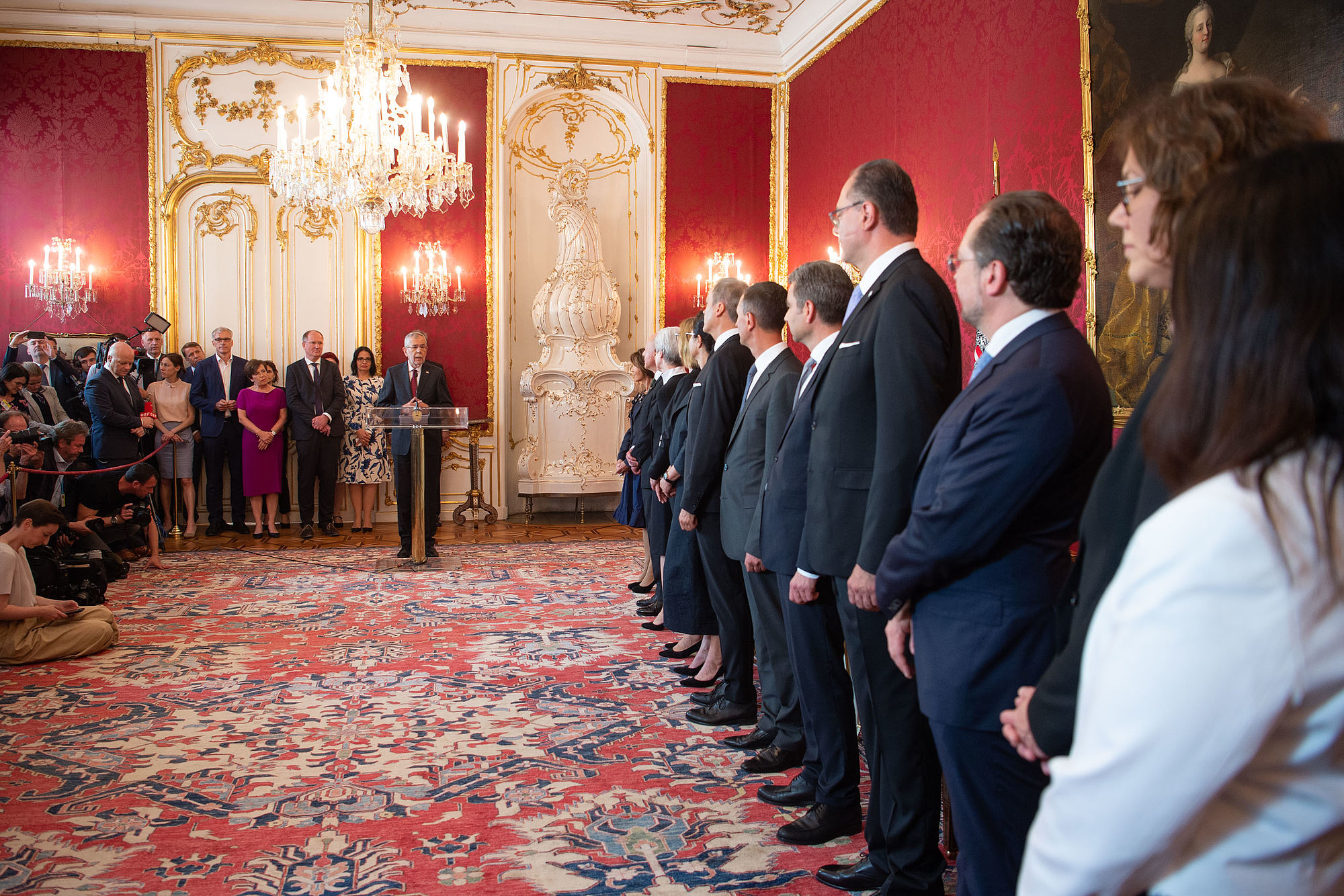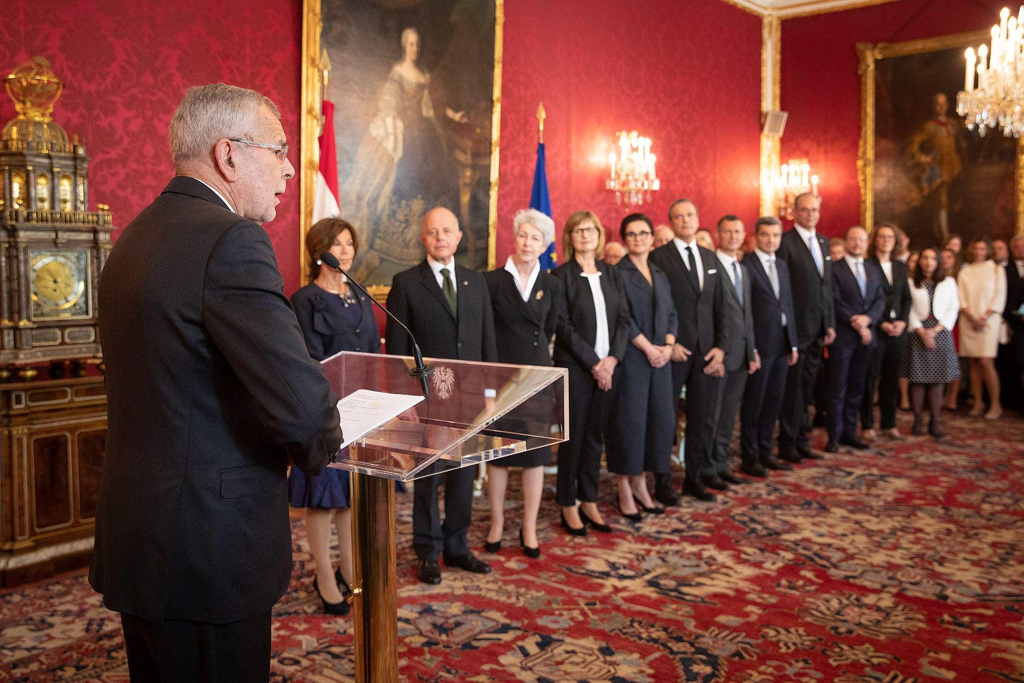 Nun, bevor ich zur Ernennung und Angelobung komme, möchte ich den scheidenden Ministerinnen und Ministern sowie dem schon vergangene Woche aus dem Amt geschiedenen Bundeskanzler Sebastian Kurz meinen Dank aussprechen für ihren Einsatz im Dienste der Republik.