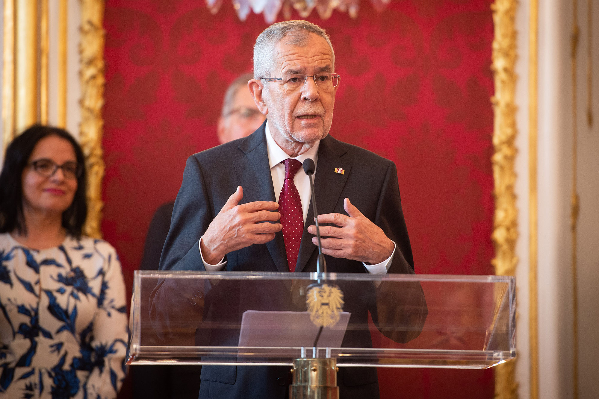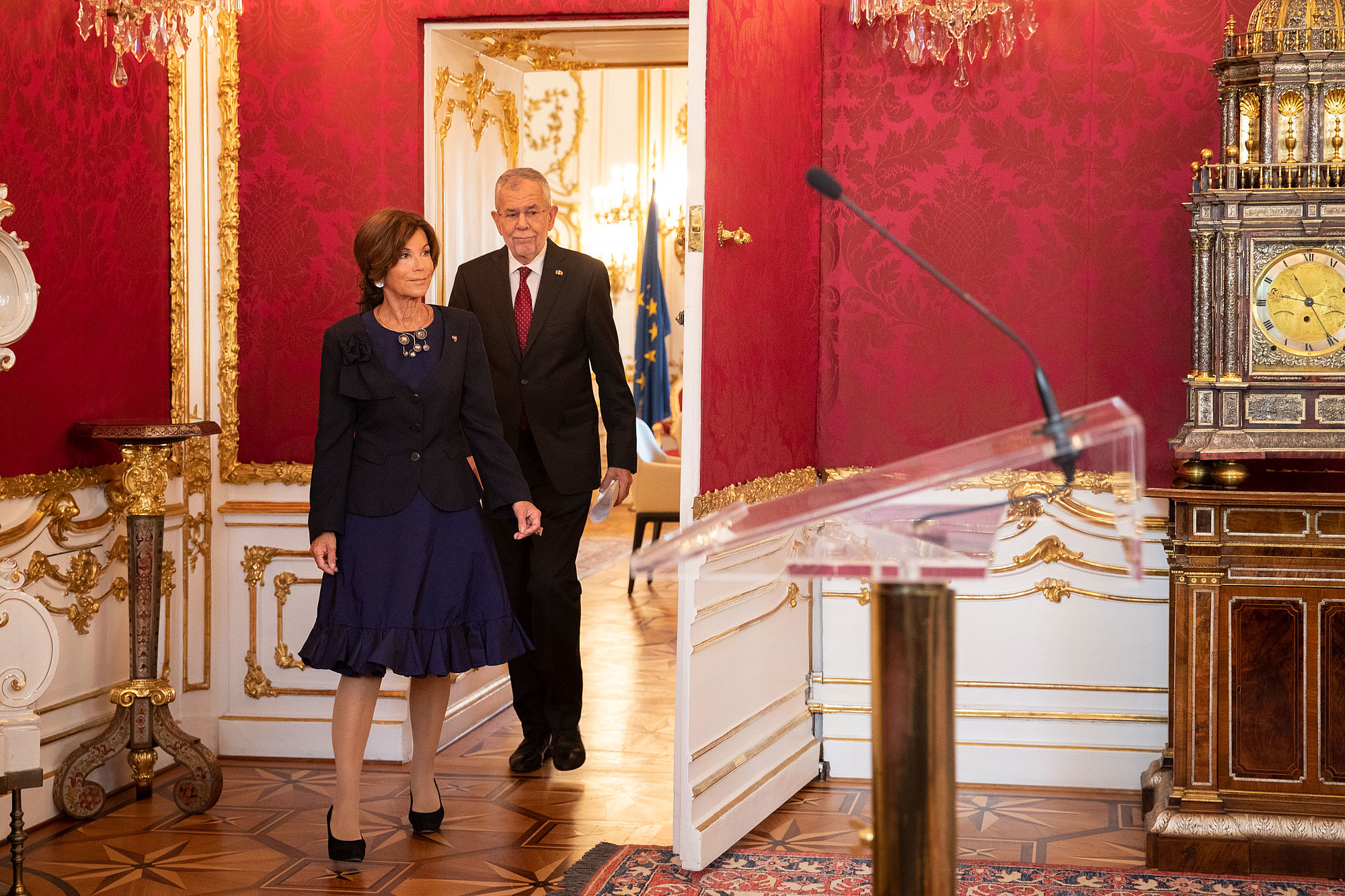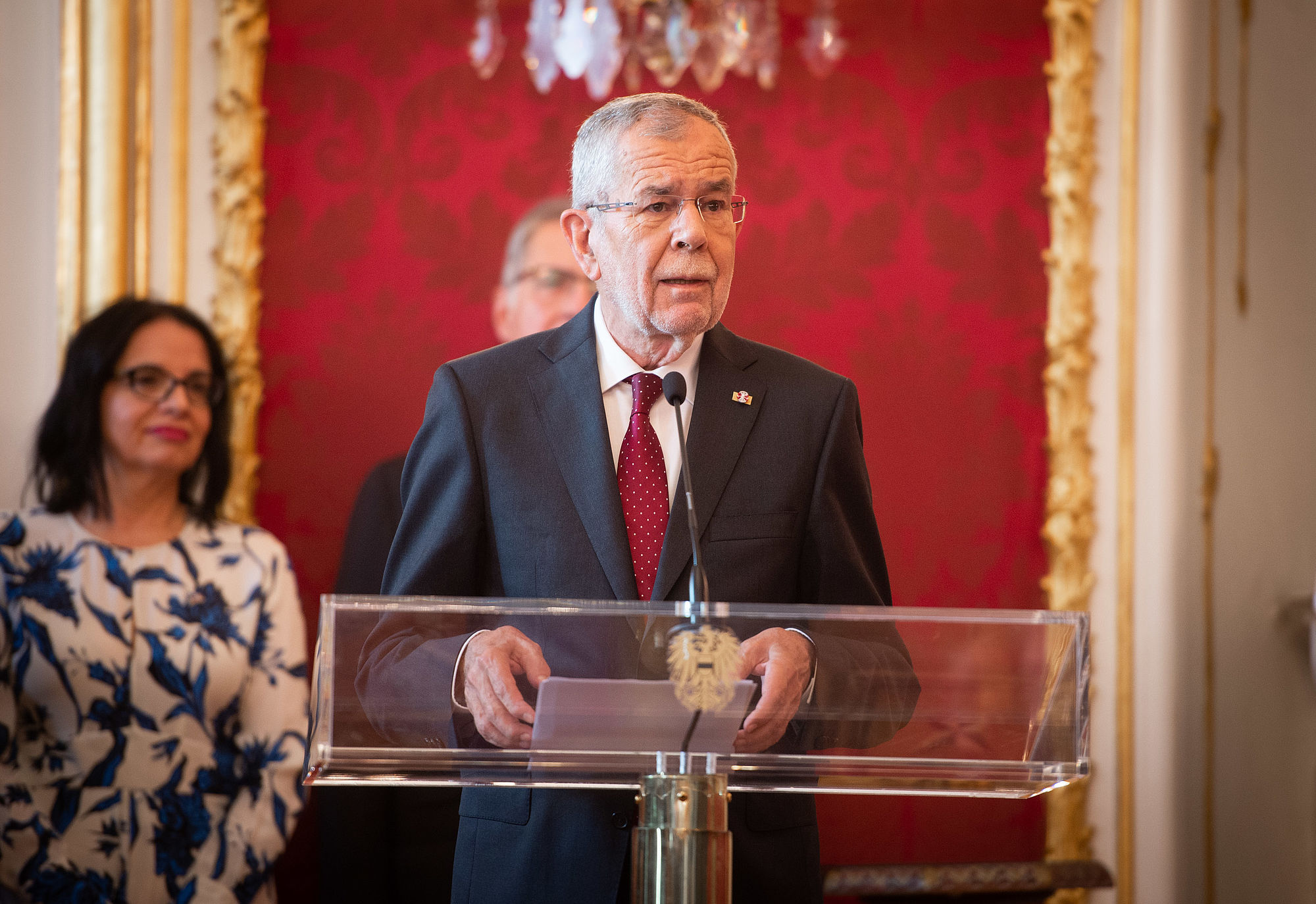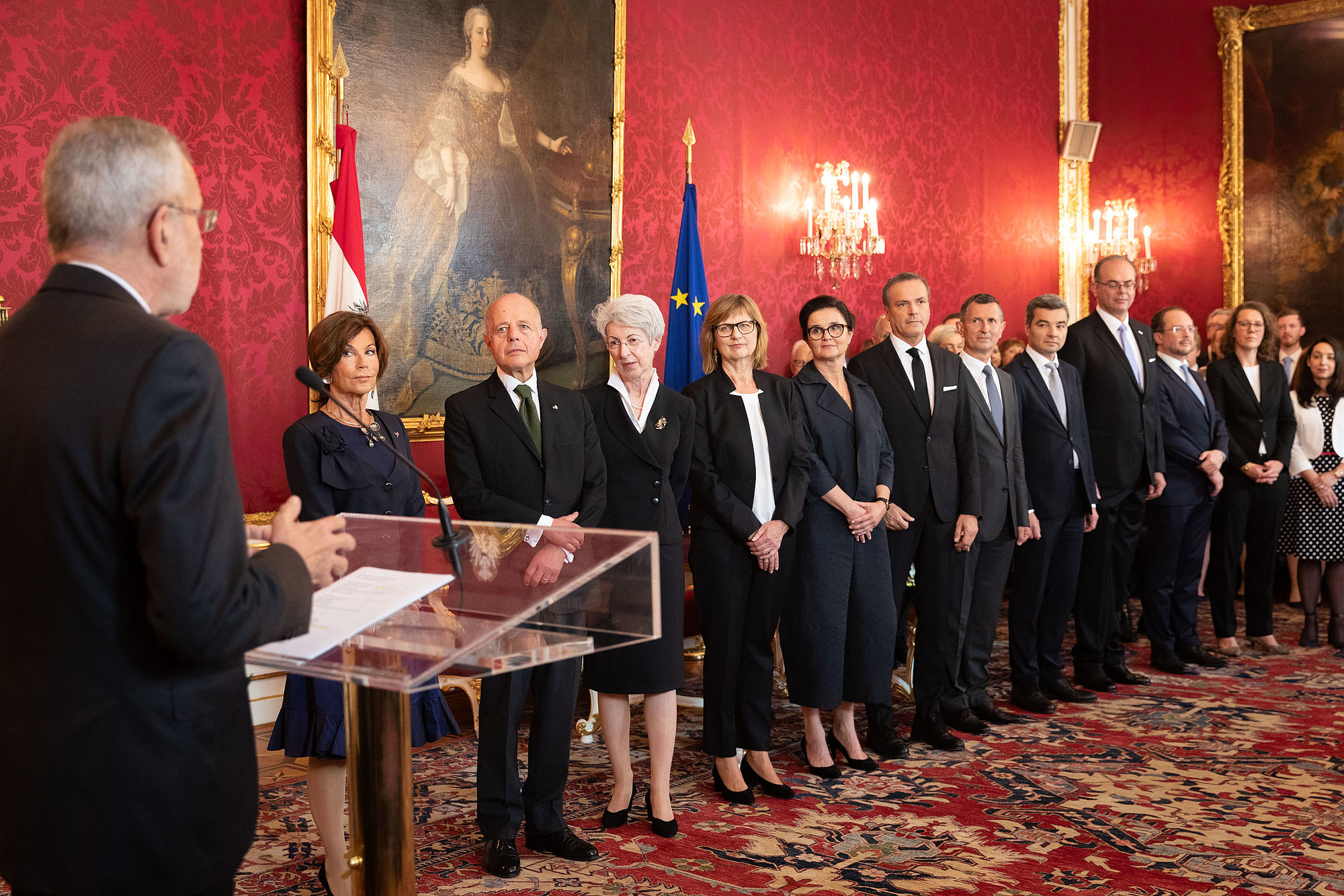 Nun, bevor ich zur Ernennung und Angelobung komme, möchte ich den scheidenden Ministerinnen und Ministern sowie dem schon vergangene Woche aus dem Amt geschiedenen Bundeskanzler Sebastian Kurz meinen Dank aussprechen für ihren Einsatz im Dienste der Republik.