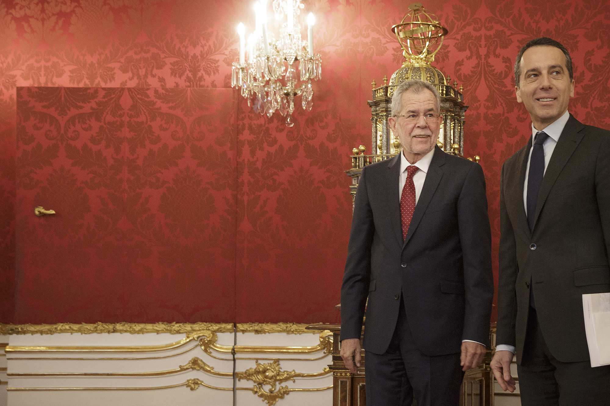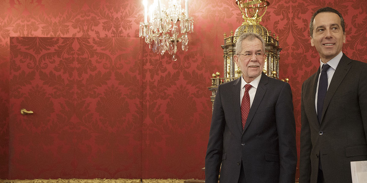 Alexander Van der Bellen und Christian Kern tauschen sich in der Präsidentschaftskanzlei über das erneuerte Regierungsprogramm aus.