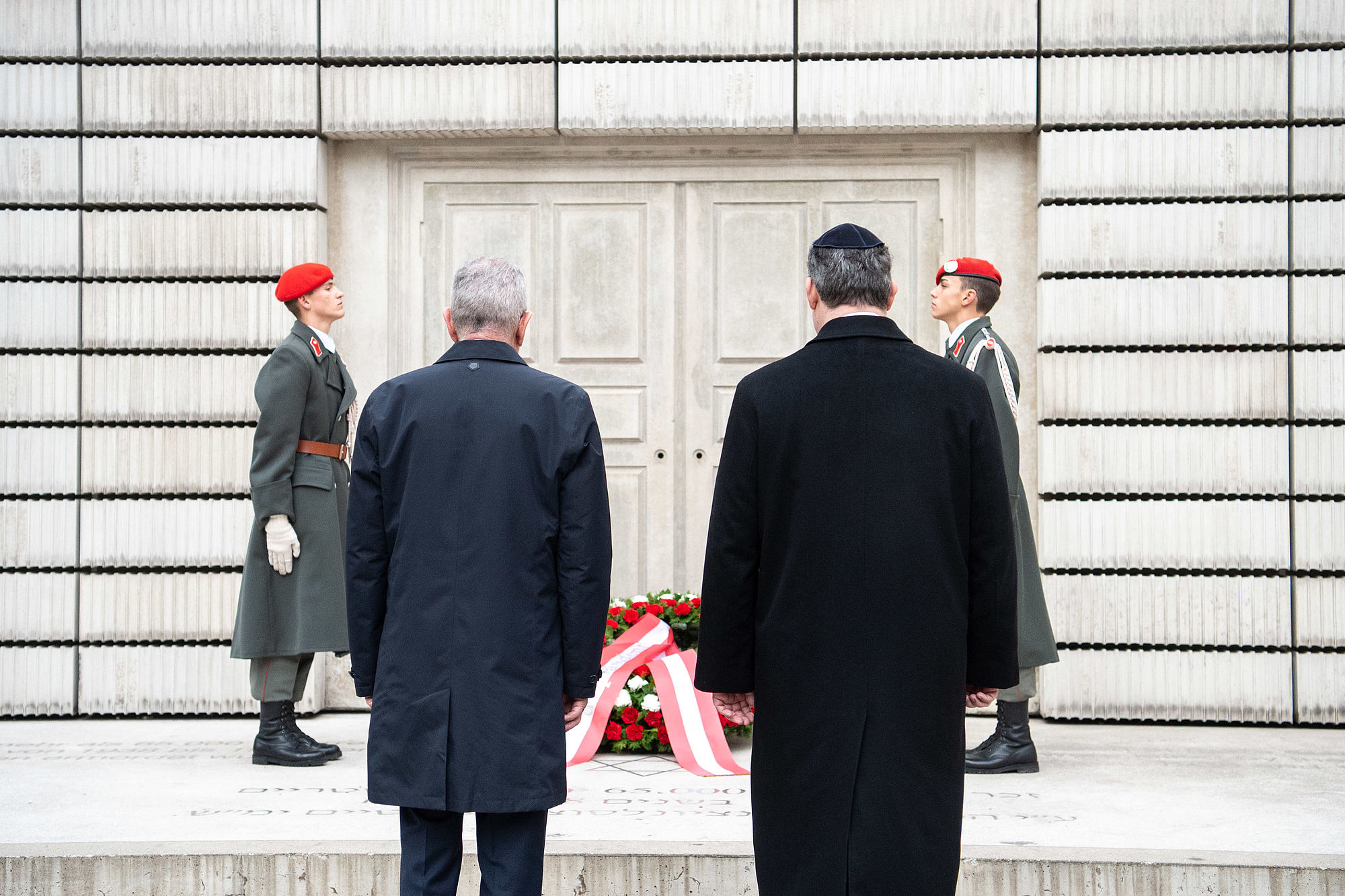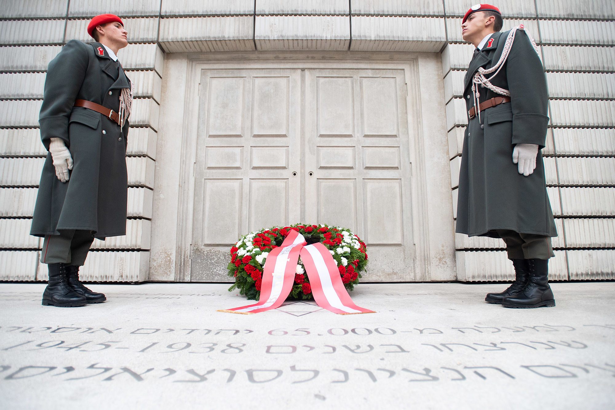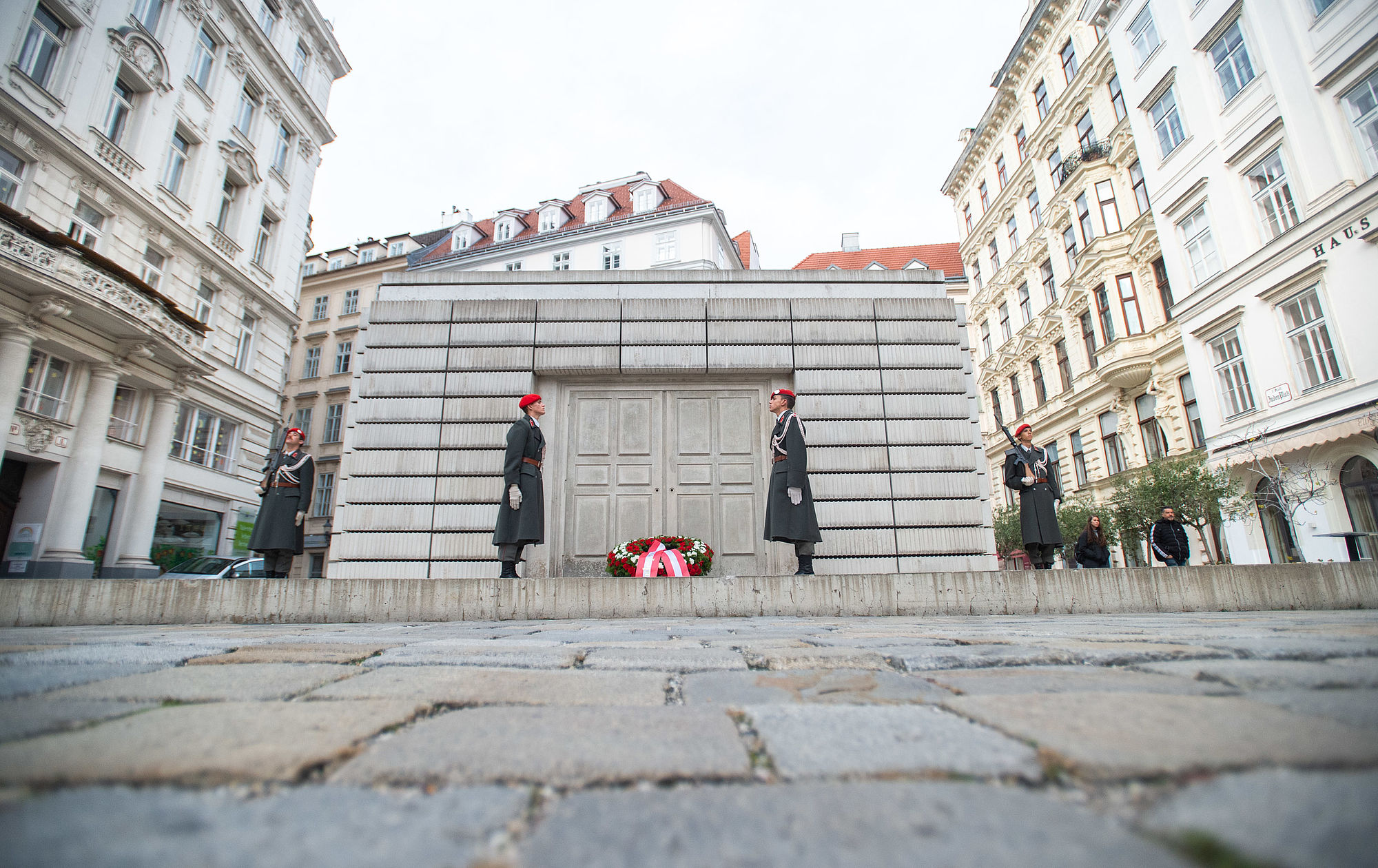 Kranzniederlegung anlässlich des Novemberpogroms beim Mahnmal für die österreichischen jüdischen Opfer der Schoah.
