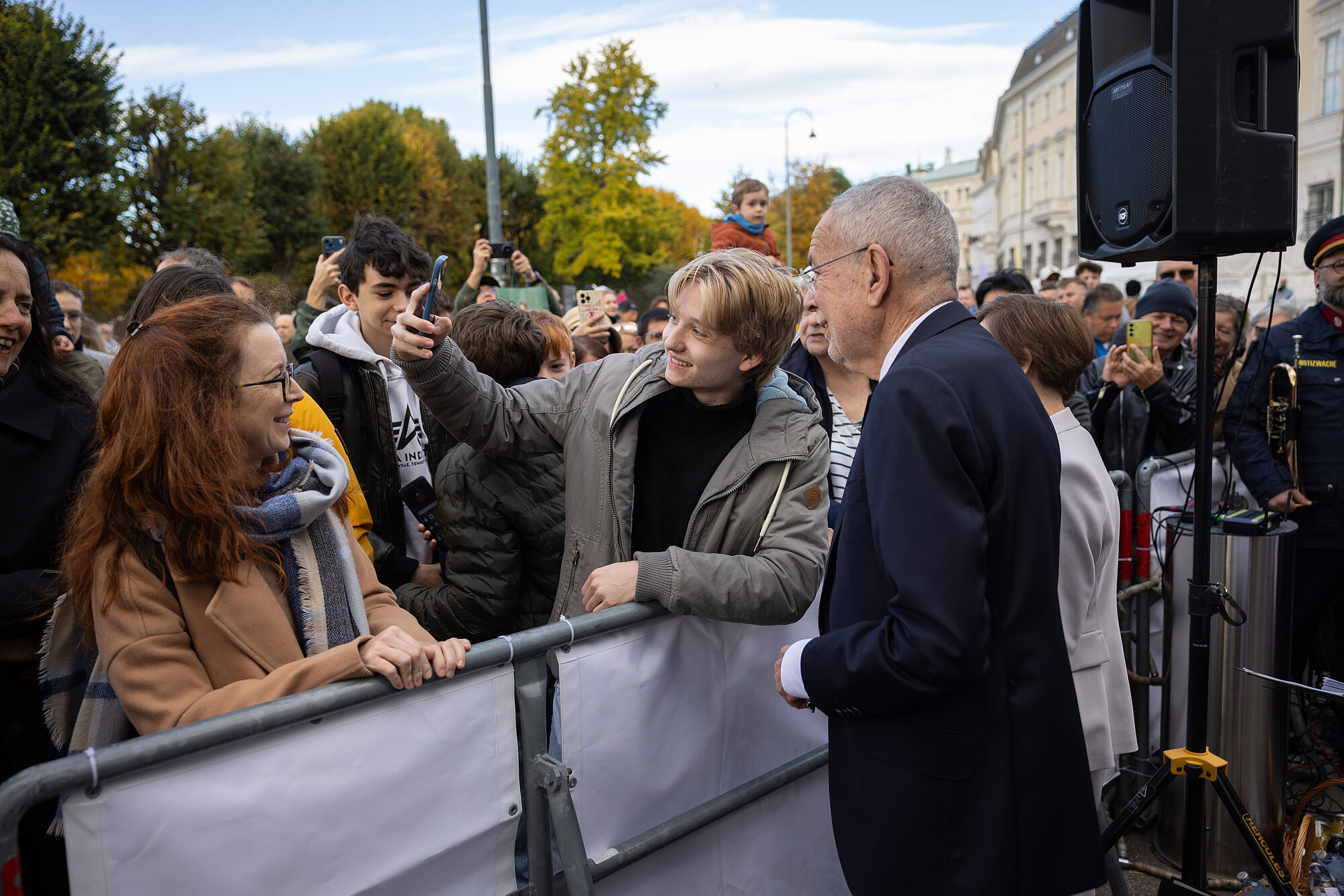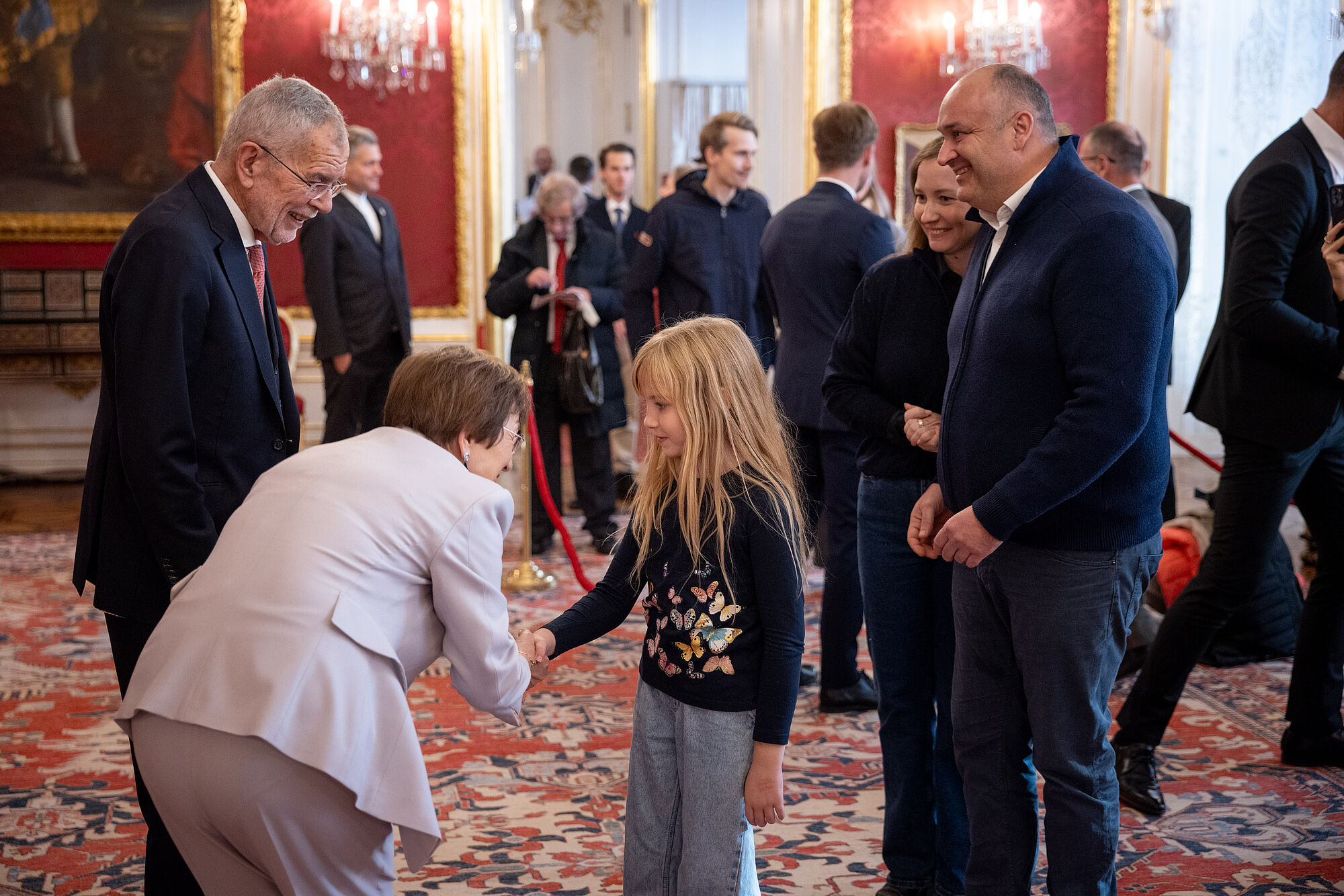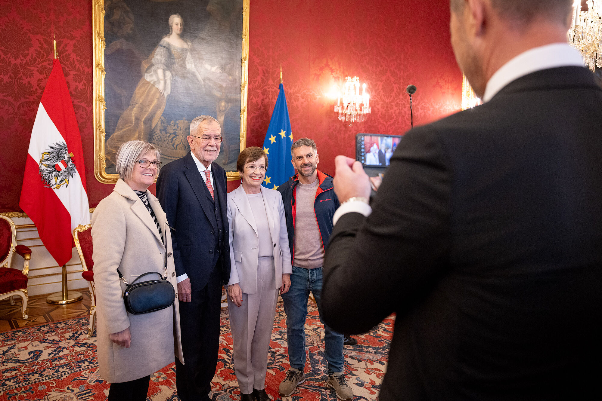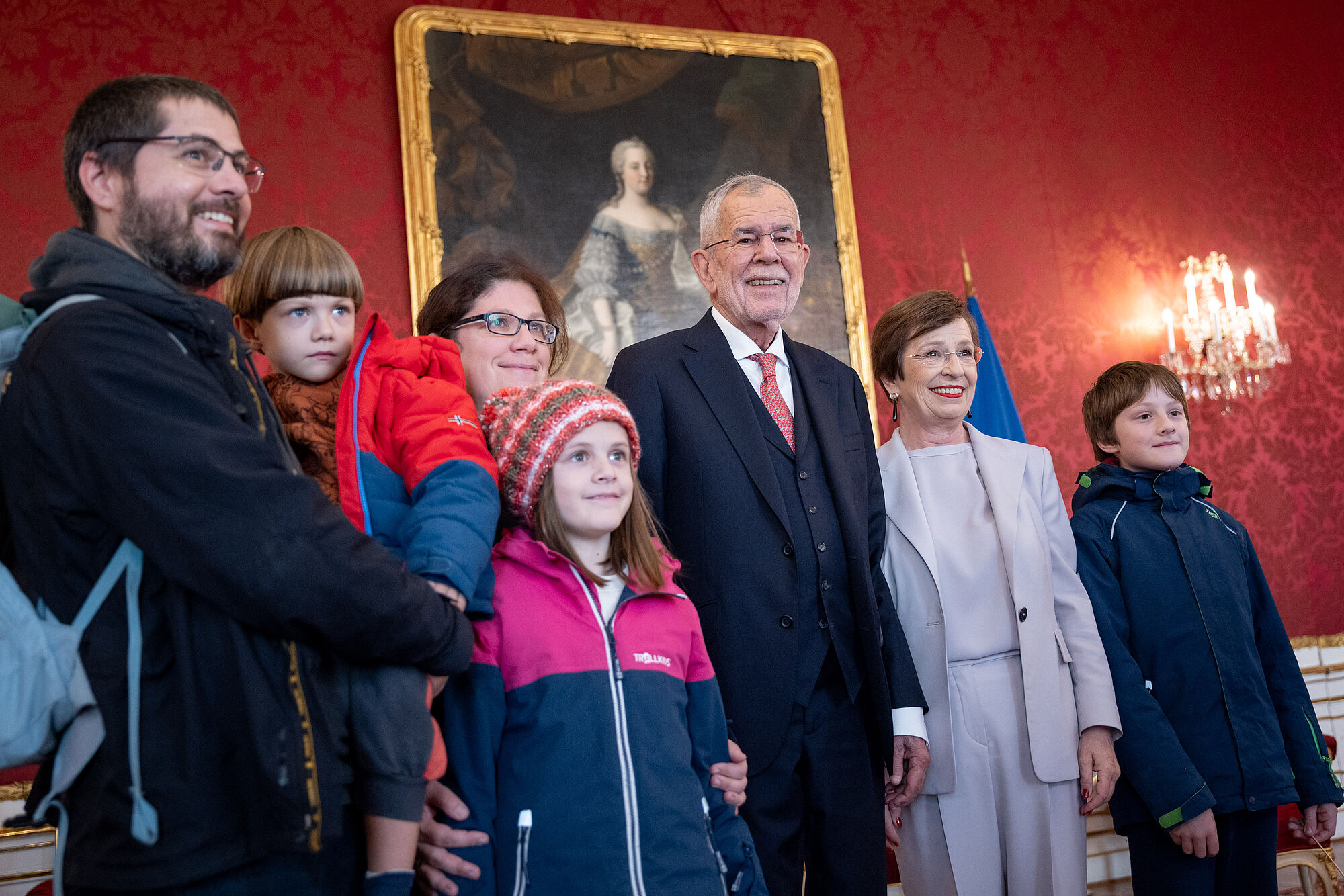 Bundespräsident Alexander Van der Bellen und Doris Schmidauer treffen Besucherinnen und Besucher in der Hofburg.