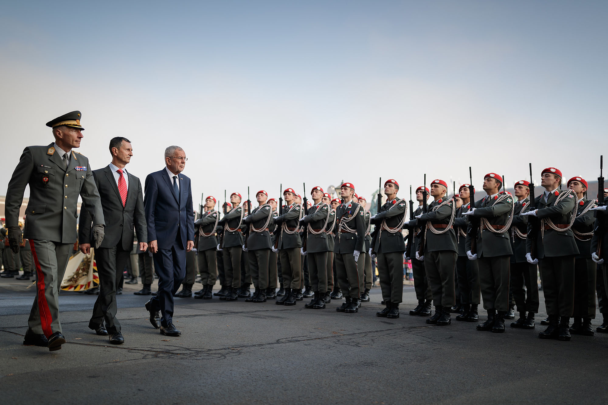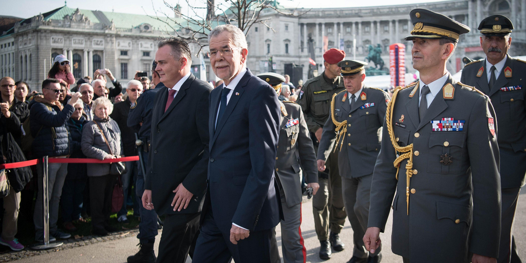 Im Gedenken an die Gefallenen des I. und II. Weltkrieges und die Opfer des Nationalsozialismus legt Bundespräsident Alexander Van der Bellen traditionell zum Auftakt des Nationalfeiertages Kränze am Heldendenkmal im Äußeren Burgtor nieder.