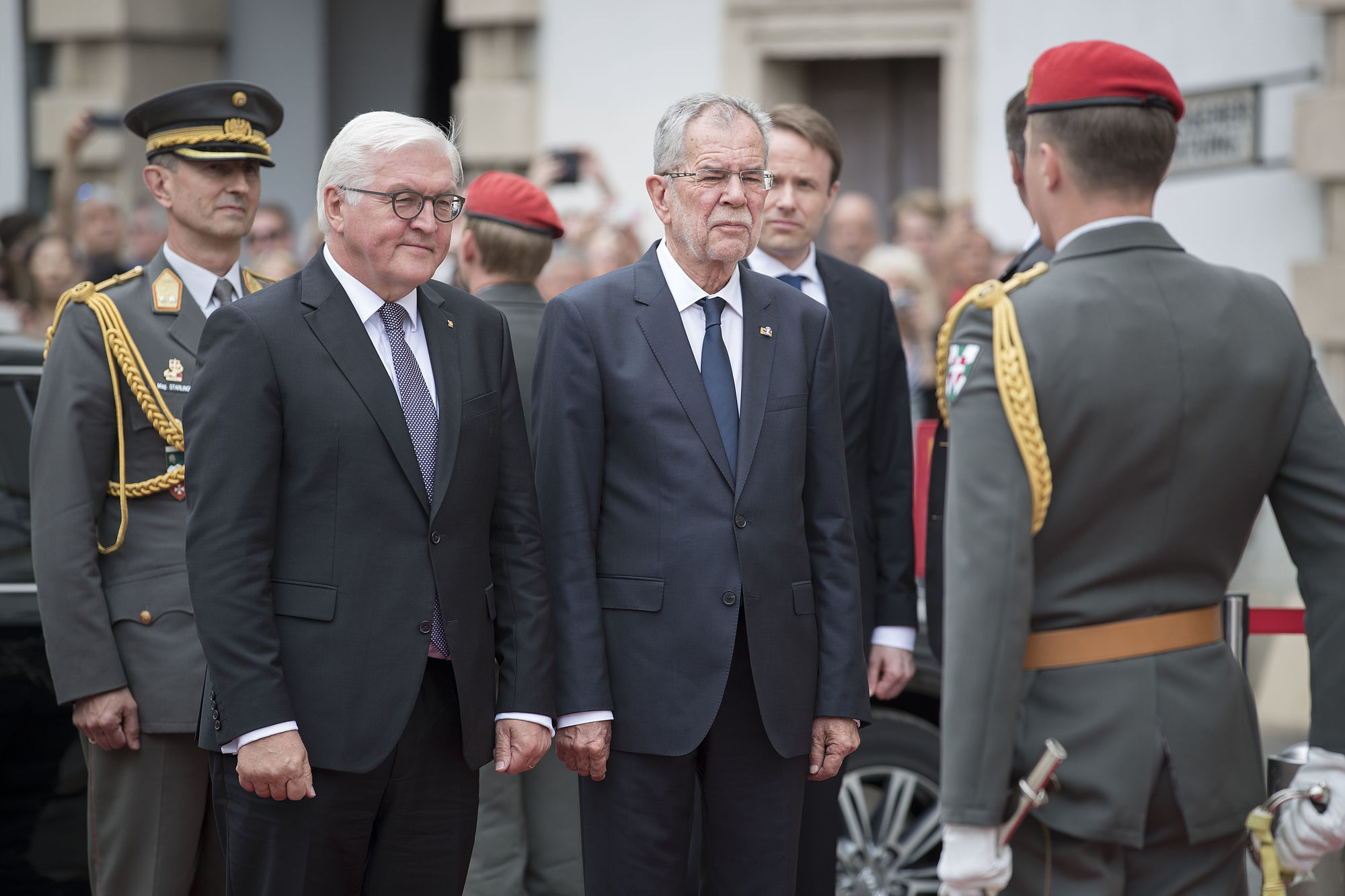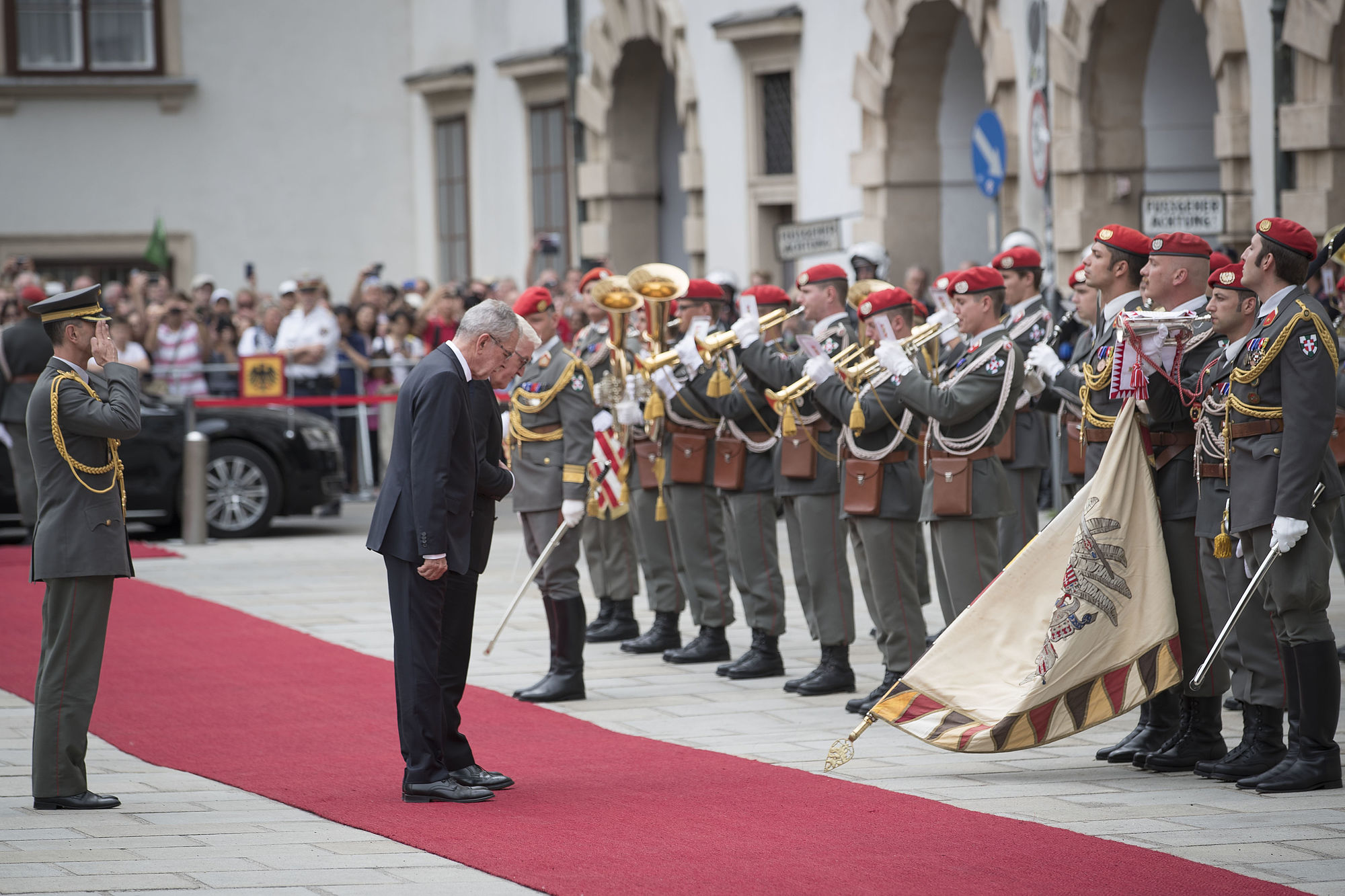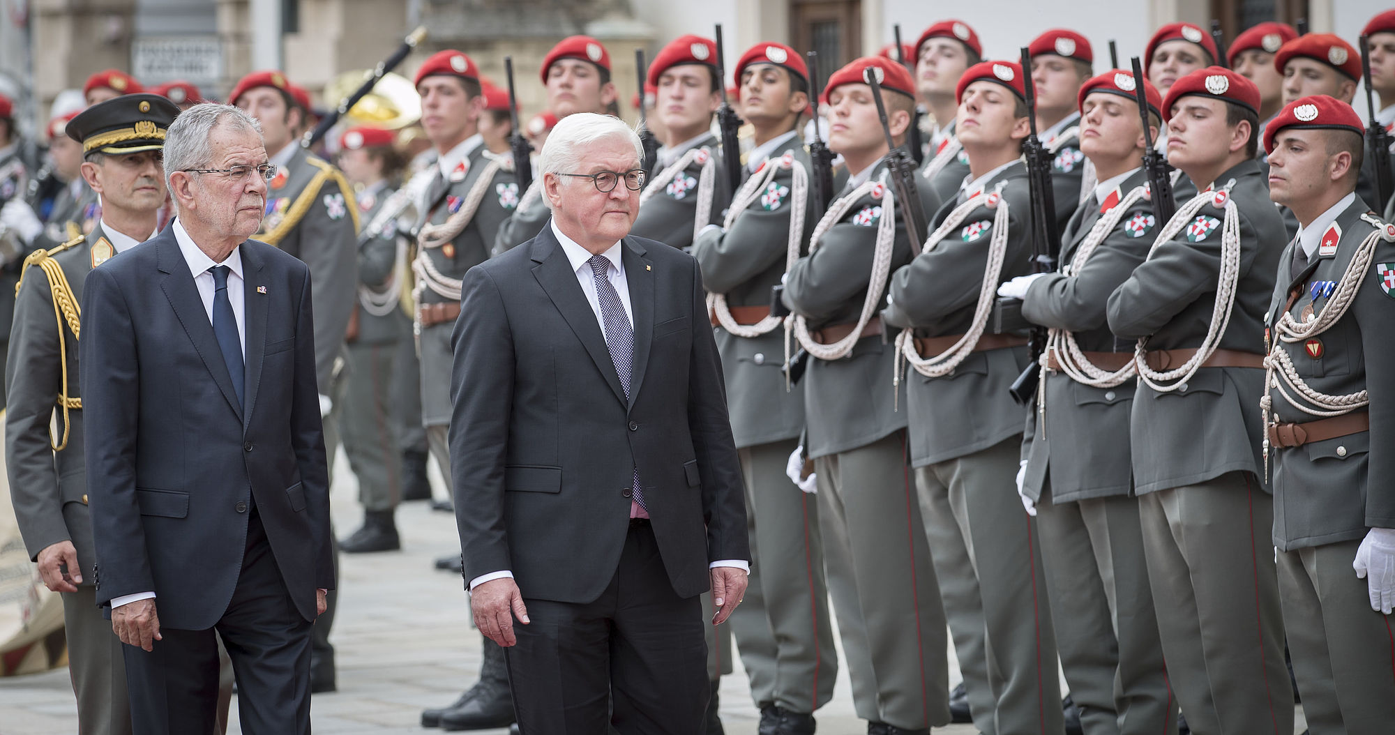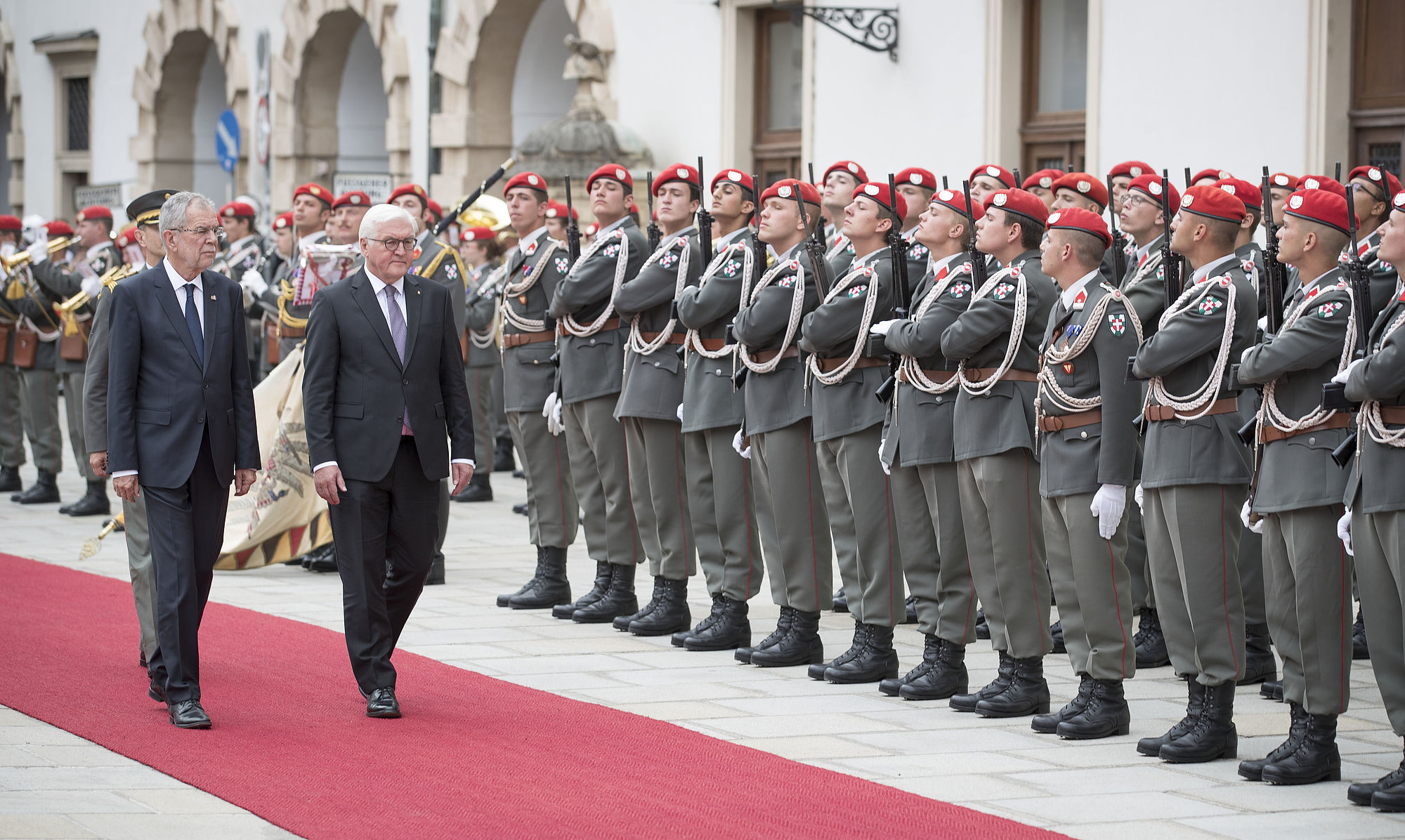 Bundespräsident Alexander Van der Bellen empfängt den deutschen Bundespräsidenten Frank-Walter Steinmeier mit militärischen Ehren im Inneren Burghof. Steinmeier wird von seiner Frau Elke Büdenbender bei diesem offiziellen Besuch in Österreich begleitet.