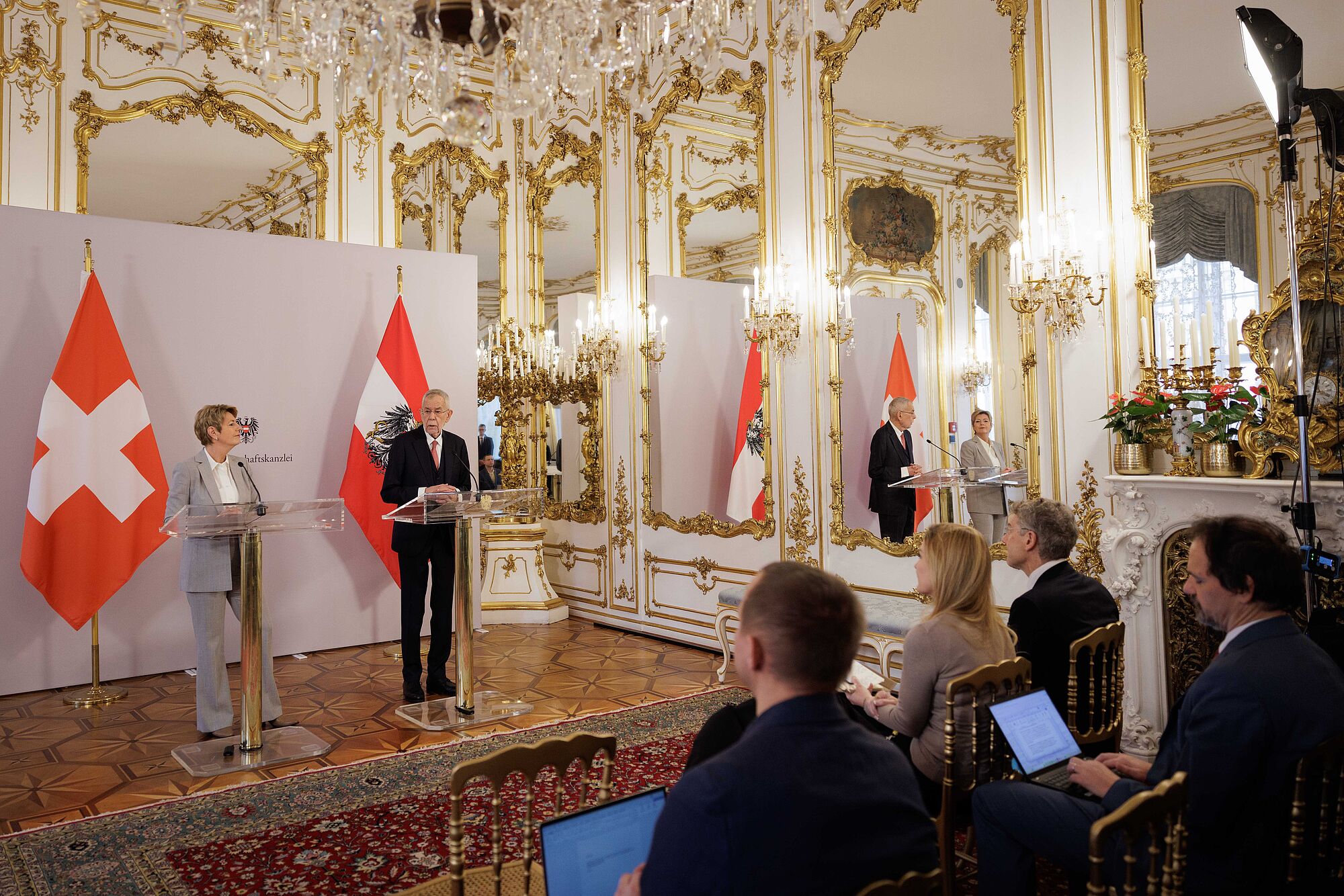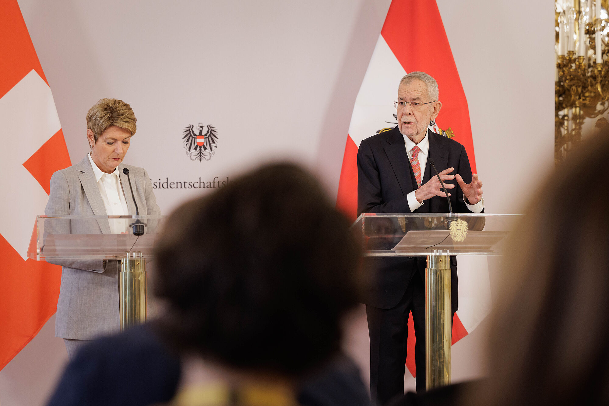 In der gemeinsamen Pressekonferenz lobten Alexander Van der Bellen und Karin Keller-Sutter die guten bilateralen Beziehungen. Zentrales Thema war dabei die vor Weihnachten erzielte Einigung zwischen der EU-Kommission und Schweizer Unterhändlern über einen neuen Grundlagenvertrag. "Wir haben ein wichtiges Etappenziel erreicht", sagte Bundespräsidentin Keller-Sutter unter Verweis auf die noch ausständige innenpolitische Zustimmung in der Schweiz. Alexander Van der Bellen sagte, dass er "positiv überrascht" über die Einigung gewesen sei und wünschte seiner Amtskollegin "aus ganzem Herzen viel Erfolg" bei den noch ausständigen Schritten, die voraussichtlich in einer Volksabstimmung münden werden.
