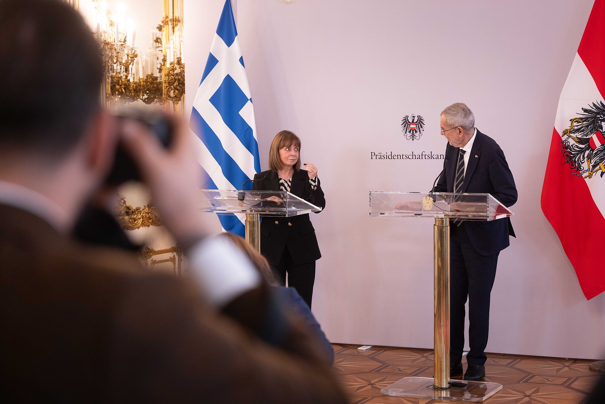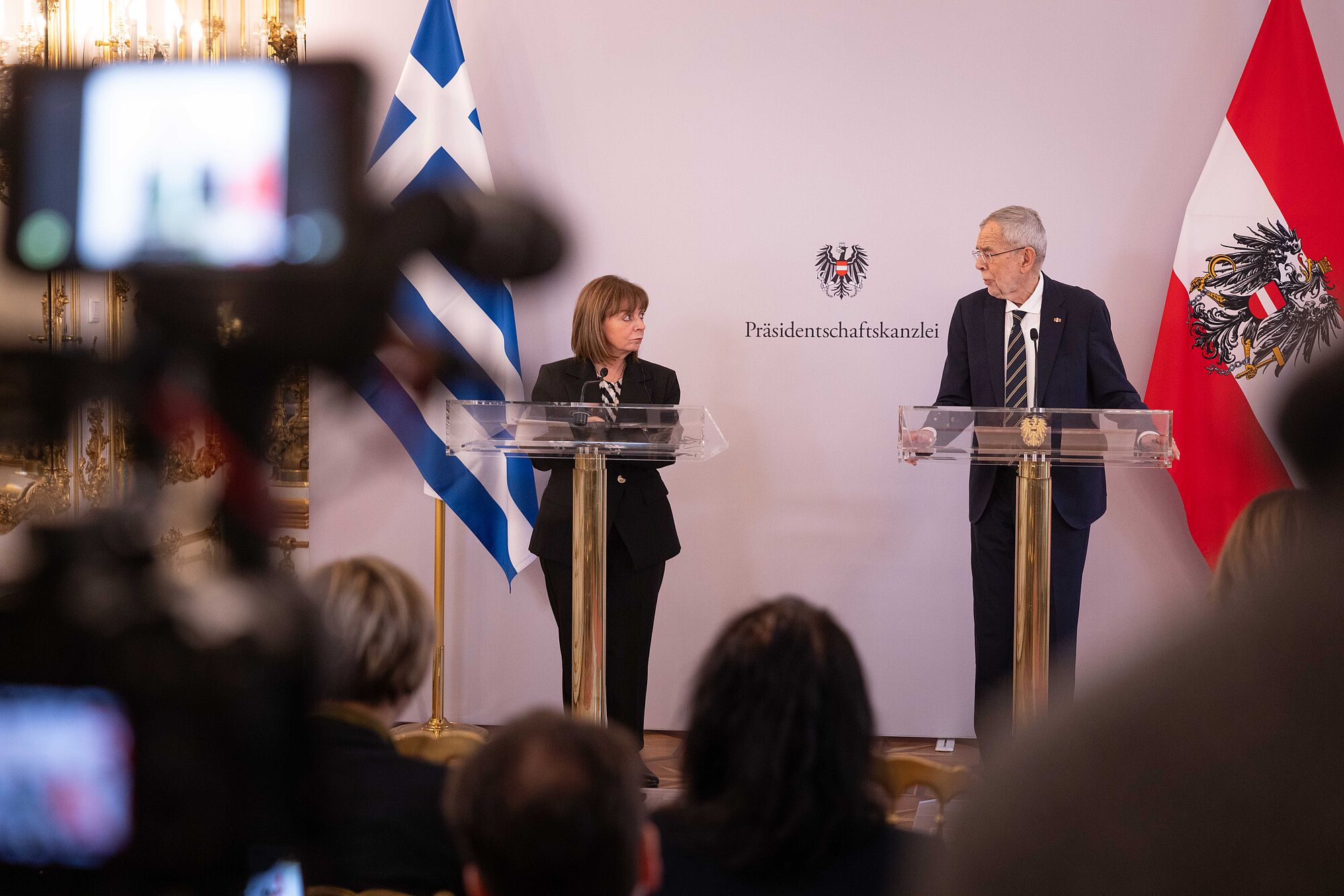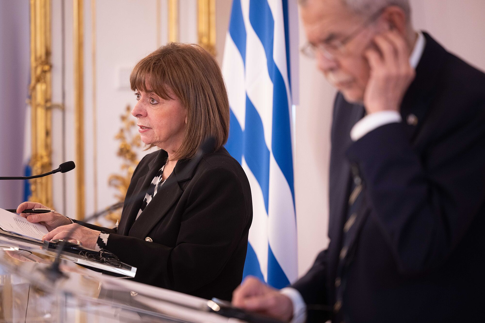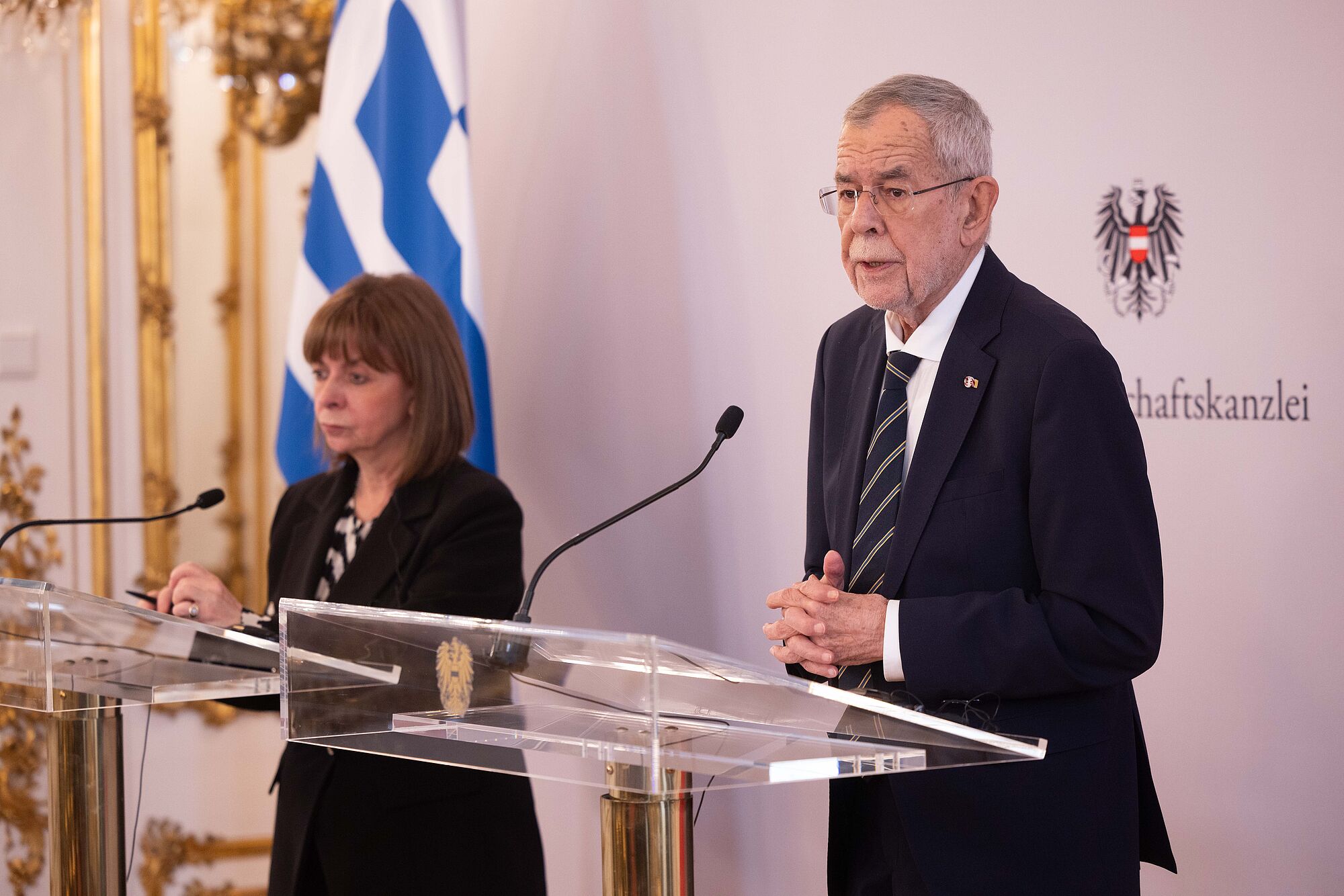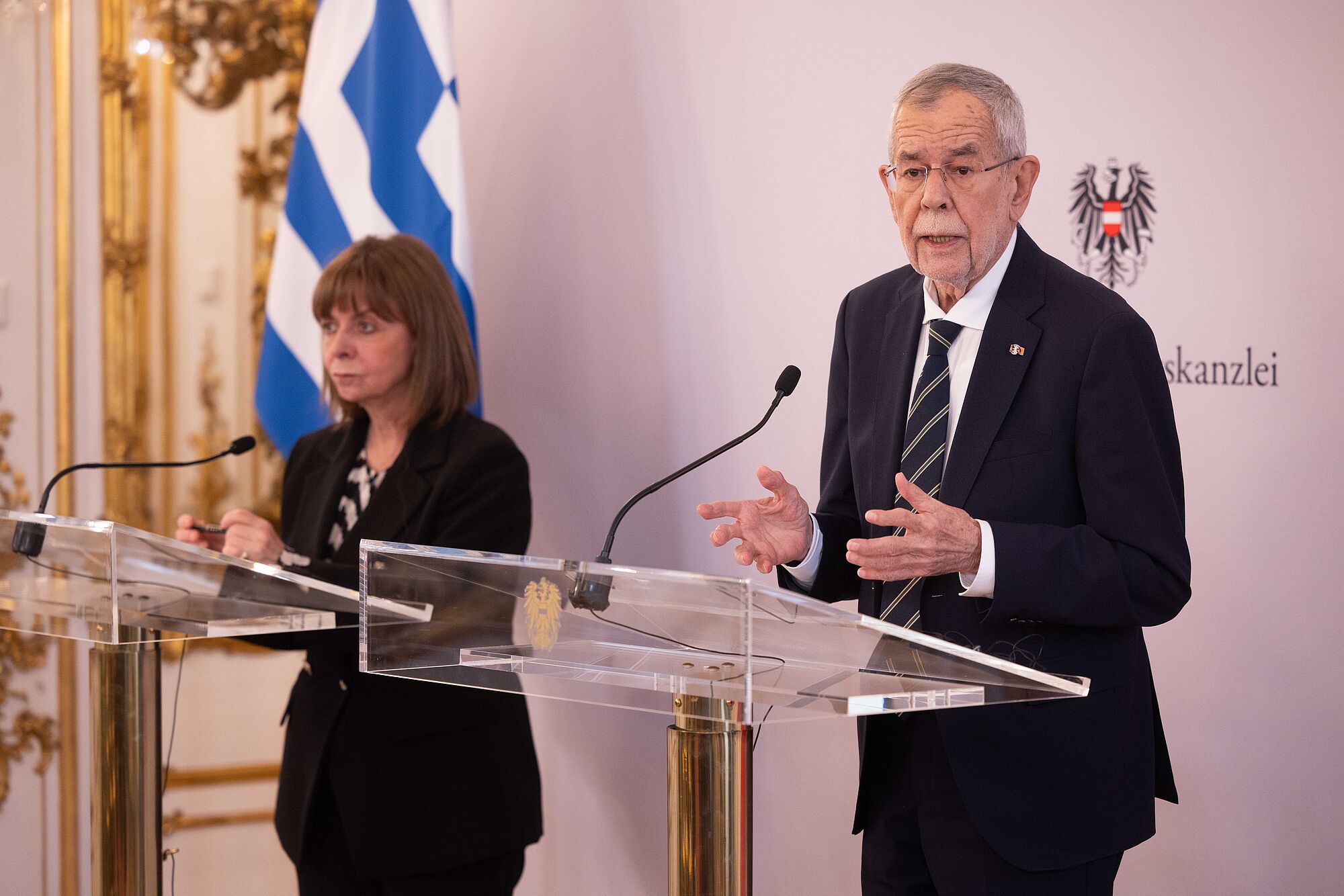 Van der Bellen mahnt bei Pressekonferenz mit griechischer Präsidentin Katerina Sakellaropoulou zu Tempo bei Klimaschutz