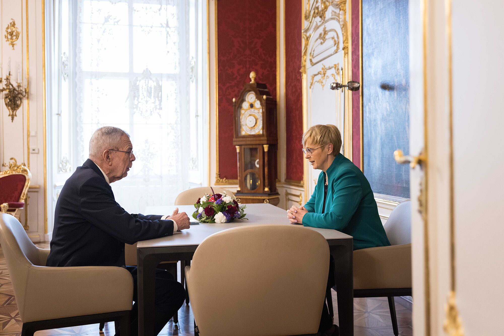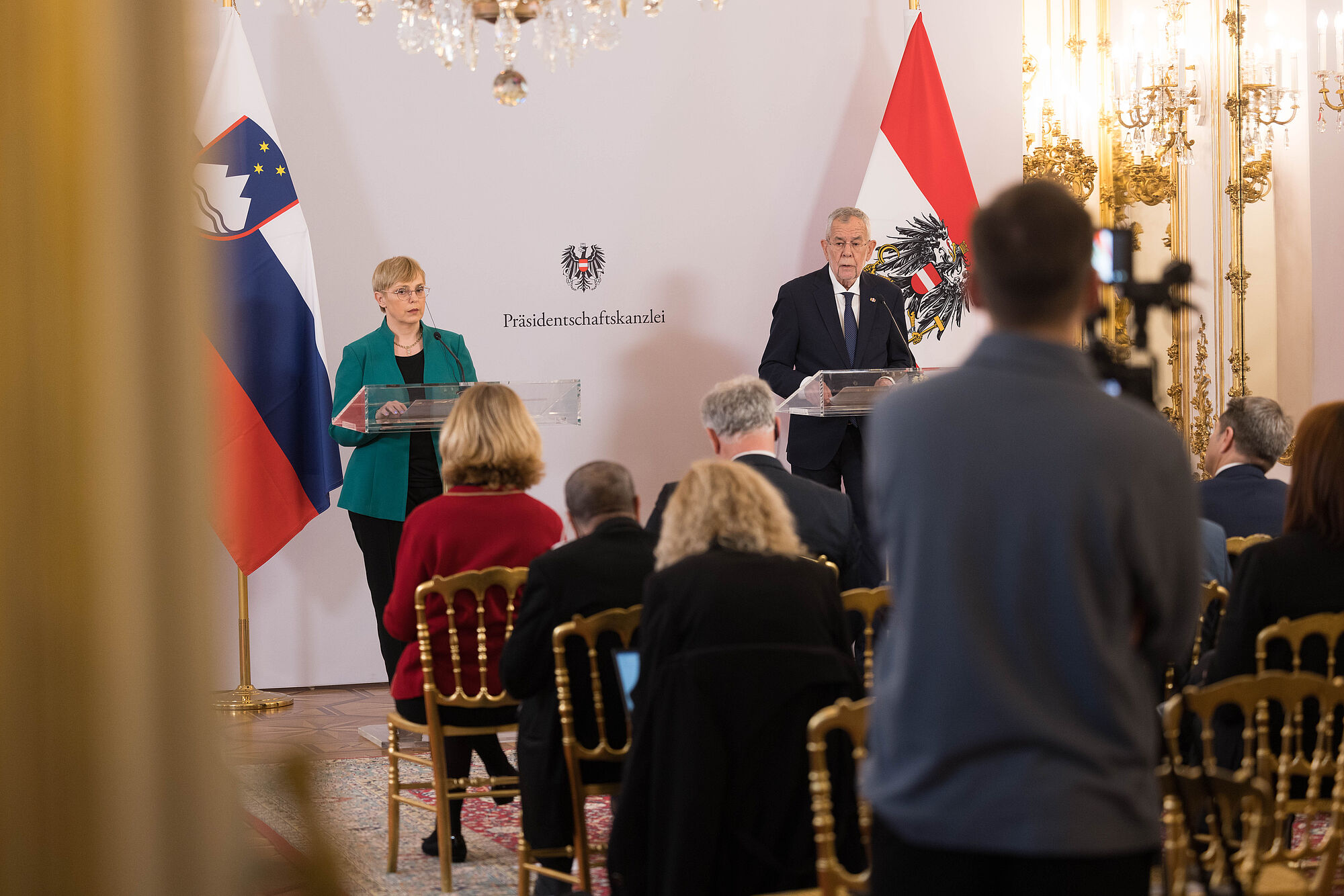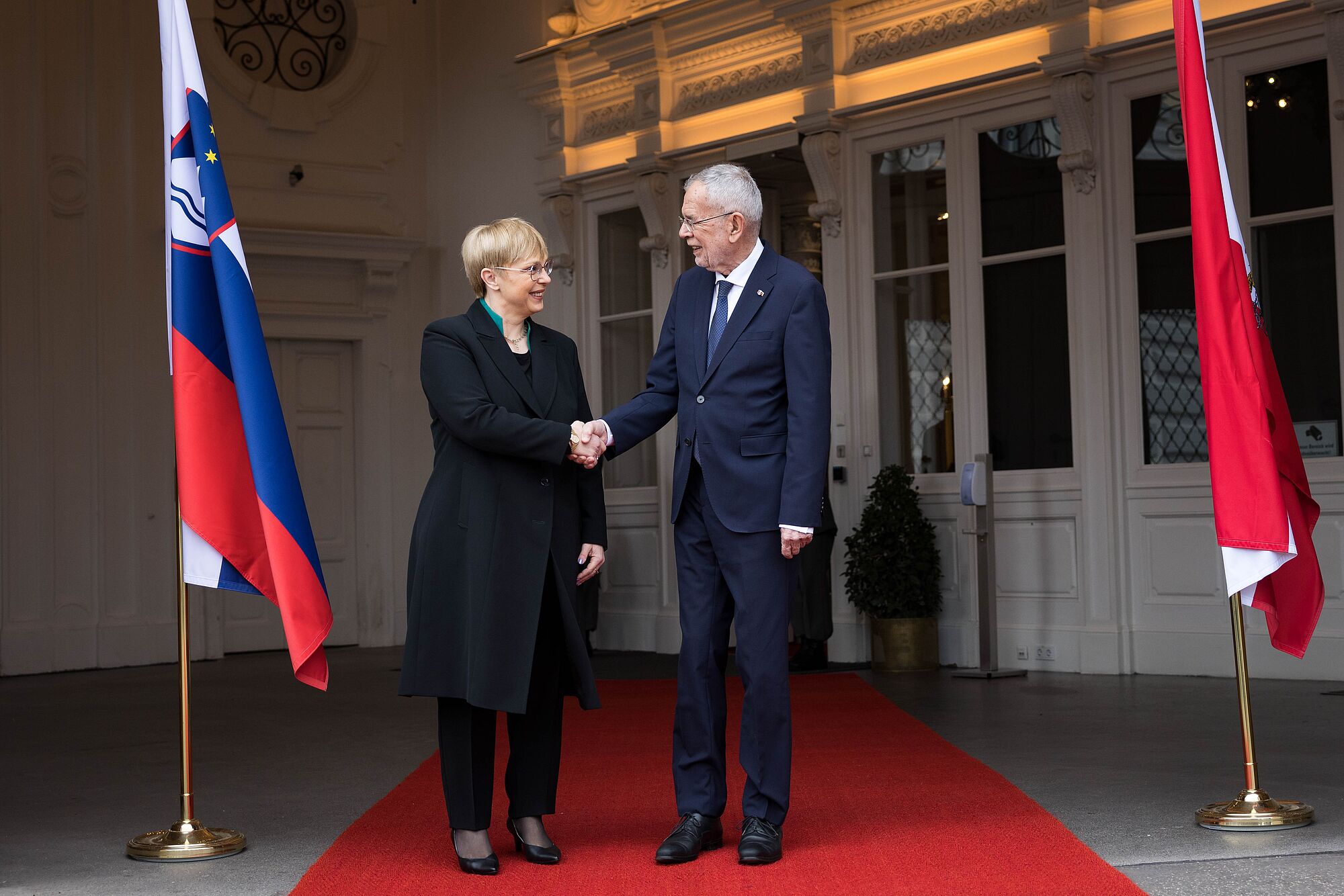 Alexander Van der Bellen hatte seine Amtskollegin mit militärischen Ehren im Inneren Burghof empfangen. Die frühere Informationsbeauftragte sieht Bundespräsident Van der Bellen als politisches Vorbild. Im Vorfeld des Besuchs hatte sie das Klimathema als Schwerpunkt hervorgehoben, doch wollte sie auch die Rechte der slowenischen Minderheit ansprechen.