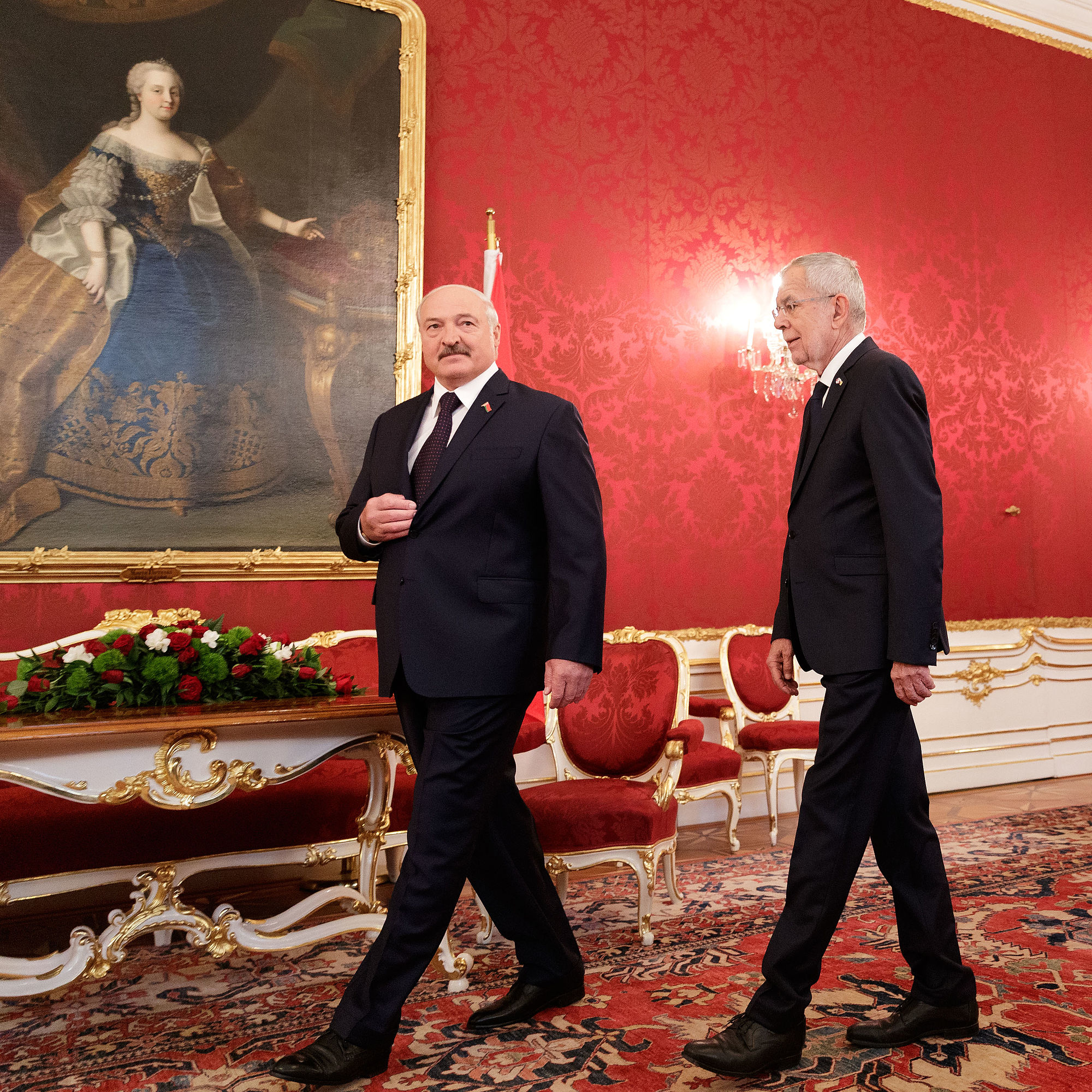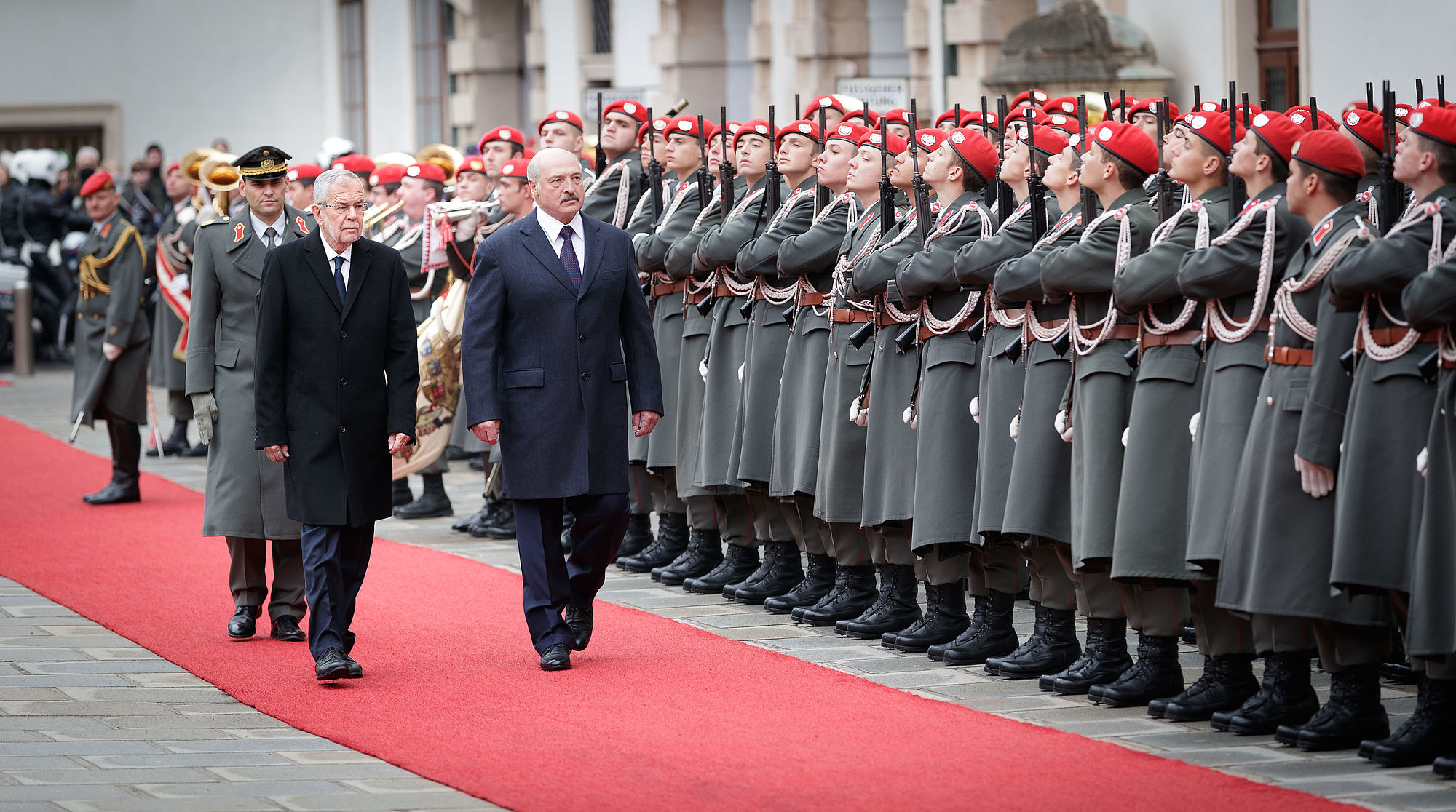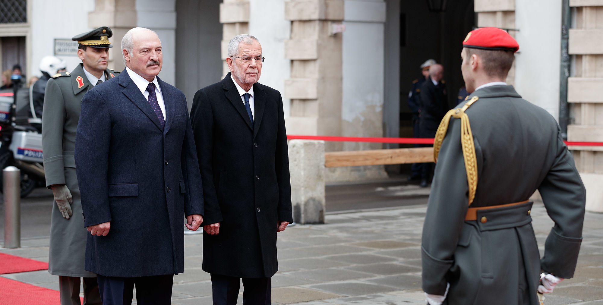 Der Präsident der Republik Belarus Aleksandr Lukashenko wurde von Bundespräsident Alexander Van der Bellen mit militärischen Ehren im Inneren Burghof empfangen. Es handelt sich um seinen ersten offiziellen Besuch in einem EU-Land seit dem Ende der EU-Sanktionen, die 2016 nach der Freilassung politischer Gefangener aufgehoben wurden.
