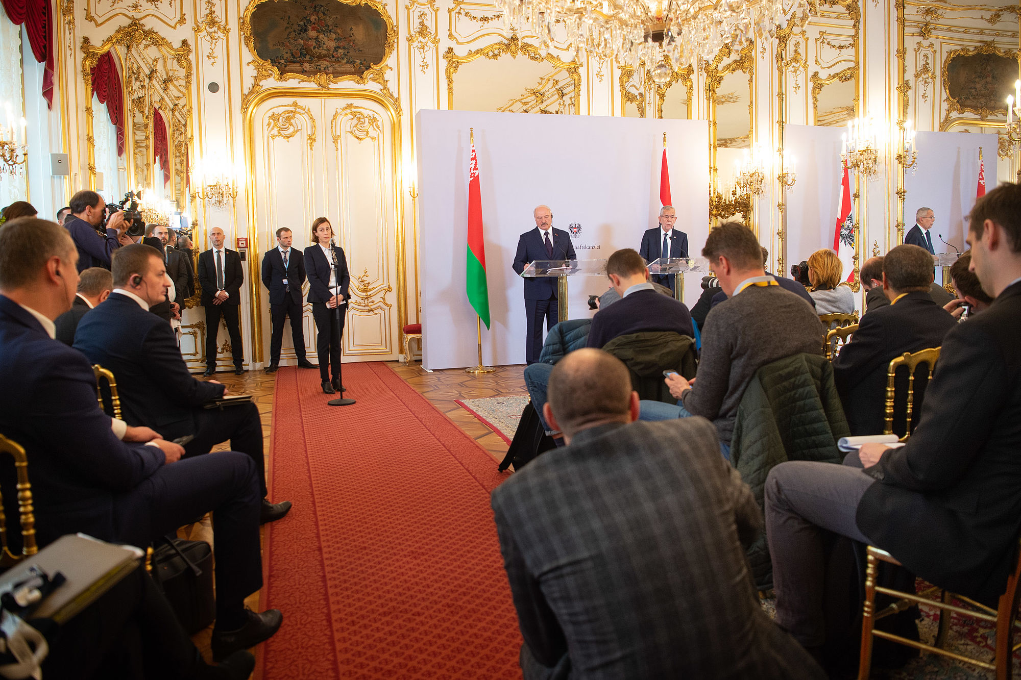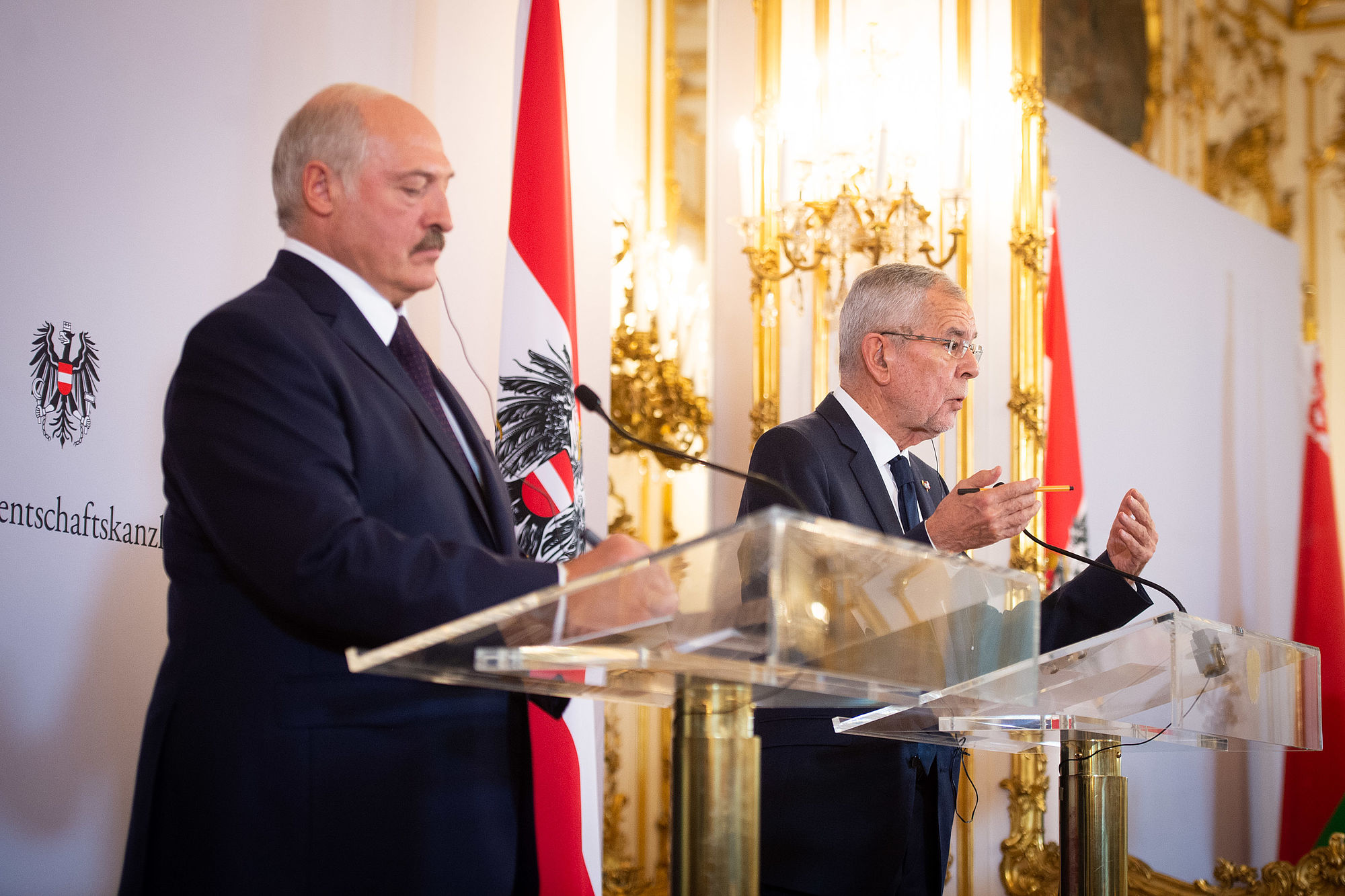 Bundespräsident Alexander Van der Bellen und der Präsident der Republik Belarus Alexander Lukashenko haben die bilateralen Beziehungen gelobt. Lukashenko sprach in einer gemeinsamen Pressekonferenz davon, dass Österreich ein "äußerst wichtiger und zuverlässiger Partner" sei.