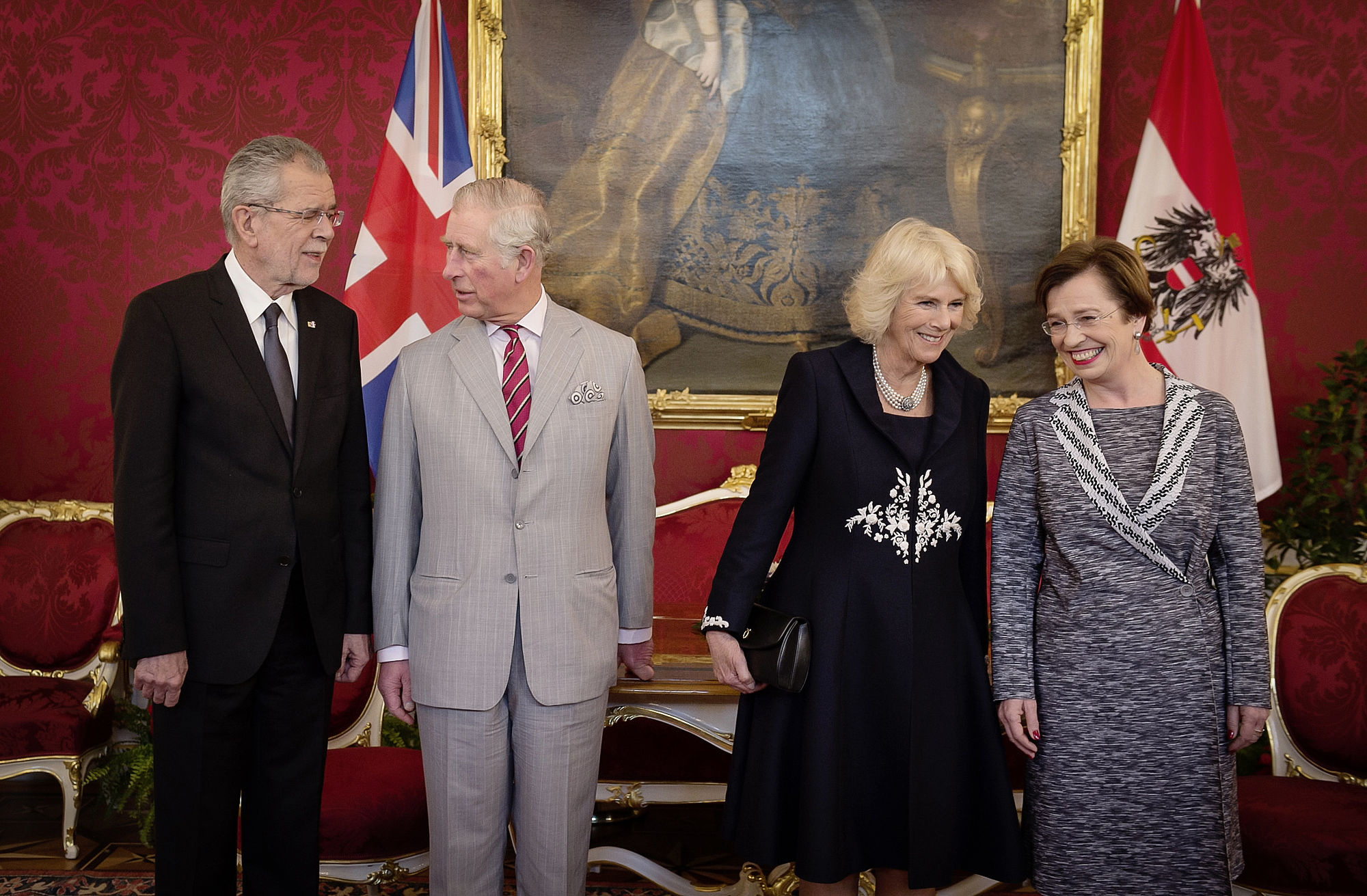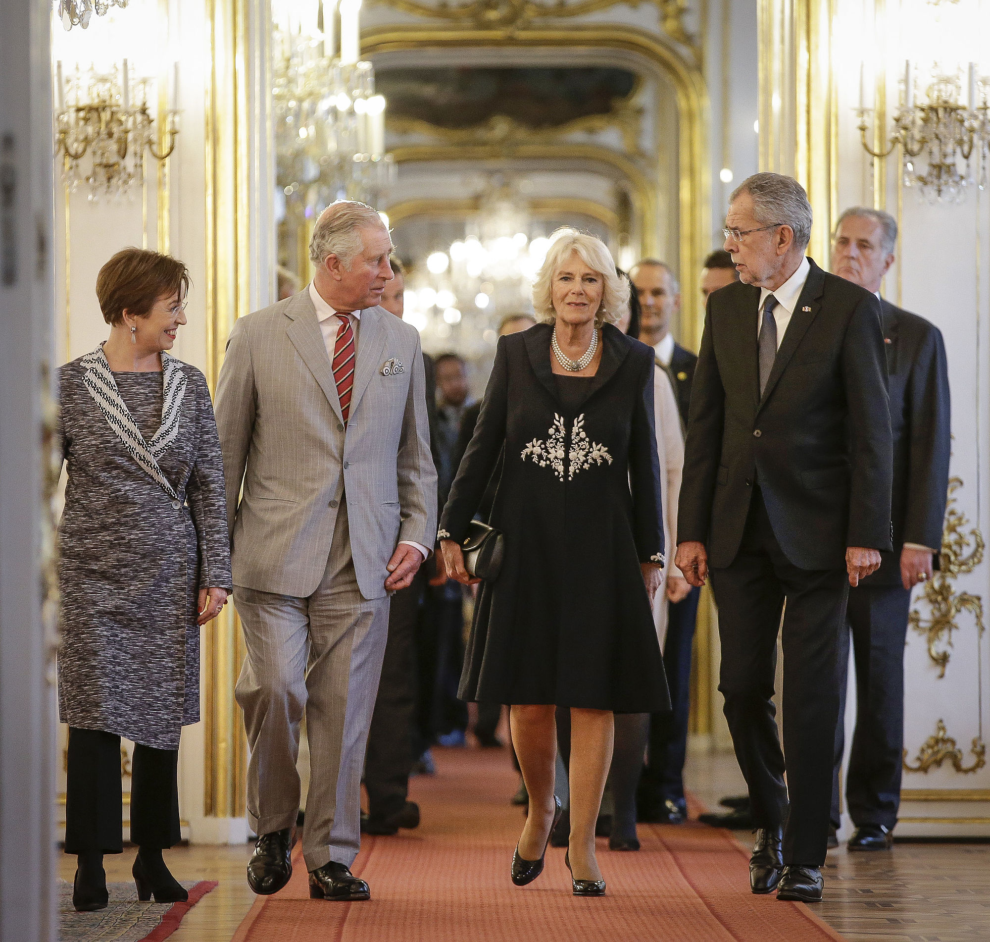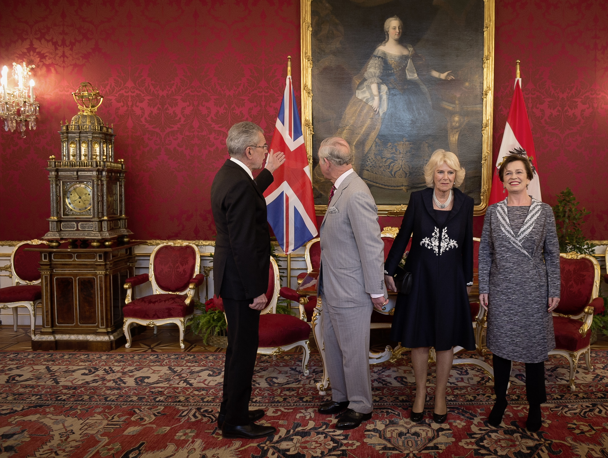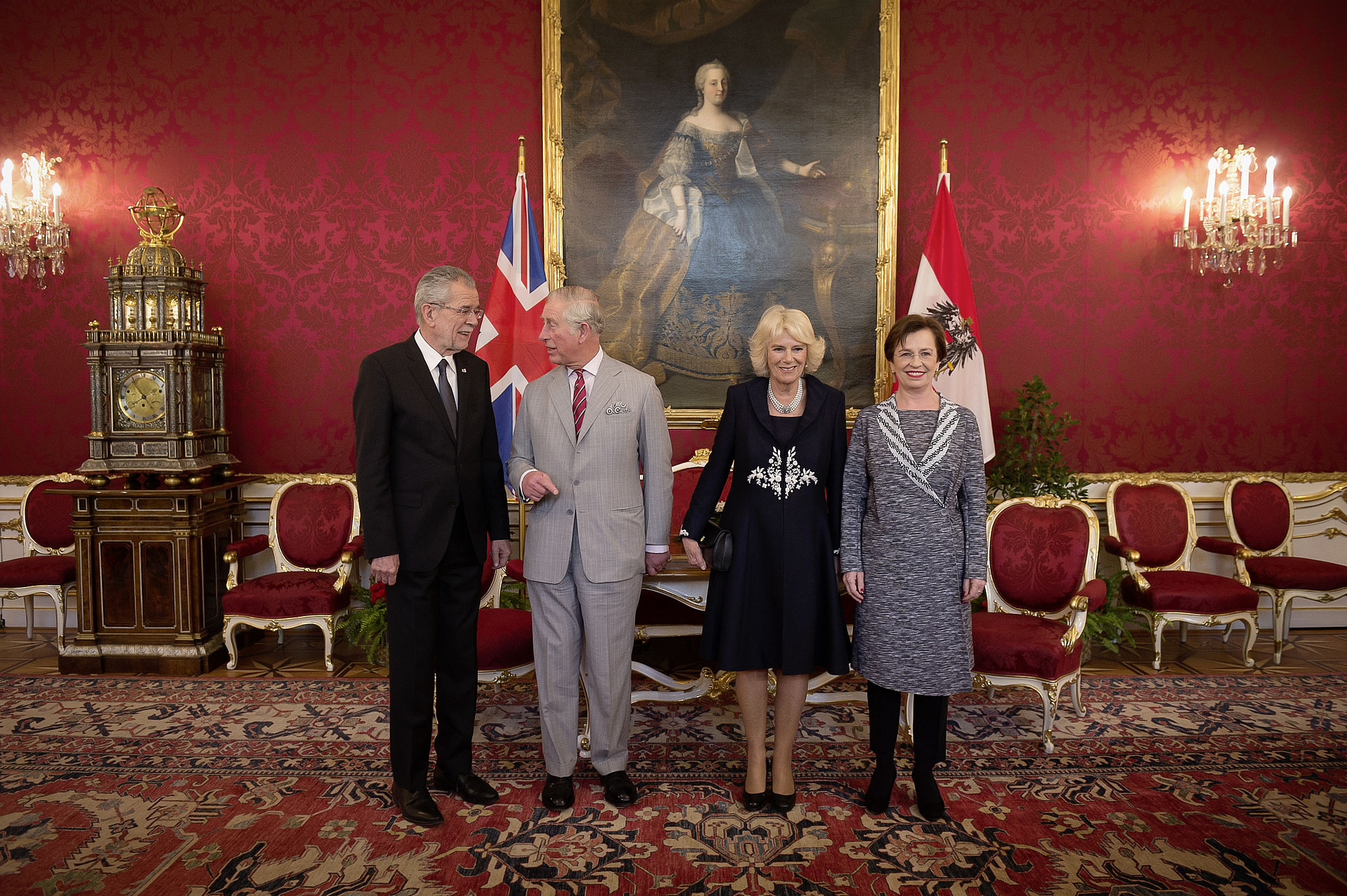 Bundespräsident Alexander Van der Bellen und Doris Schmidauer empfangen Prinz Charles und die Herzogin von Cornwall in der Wiener Hofburg.