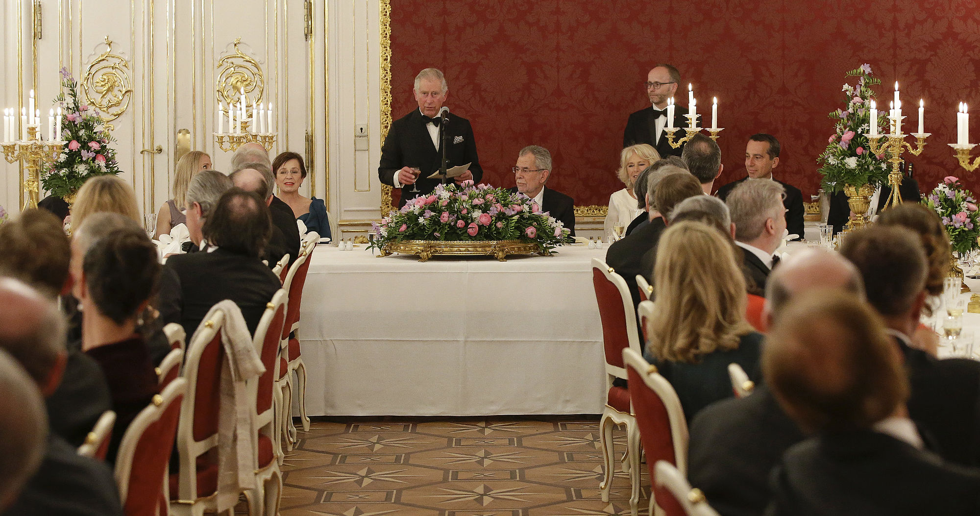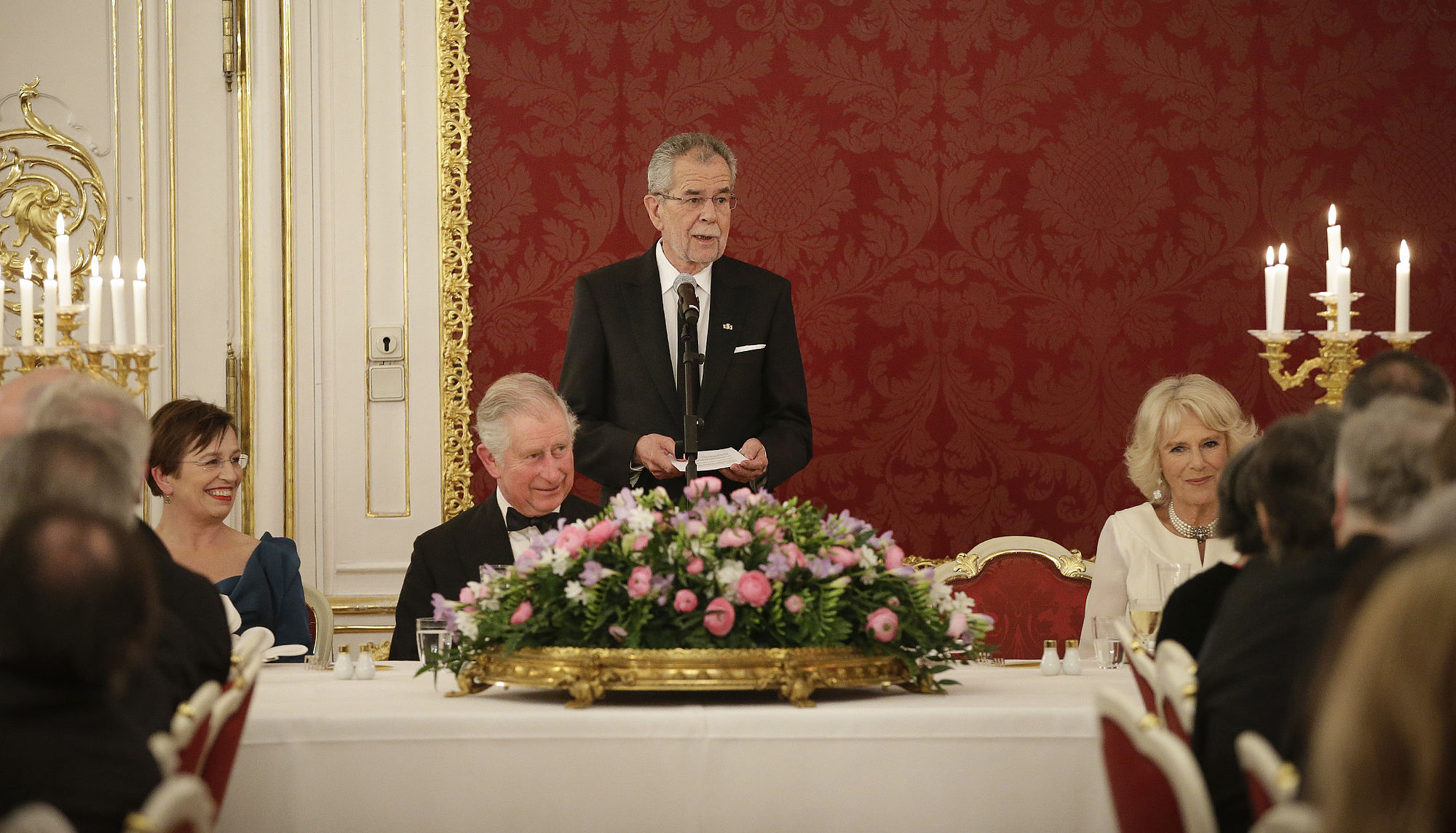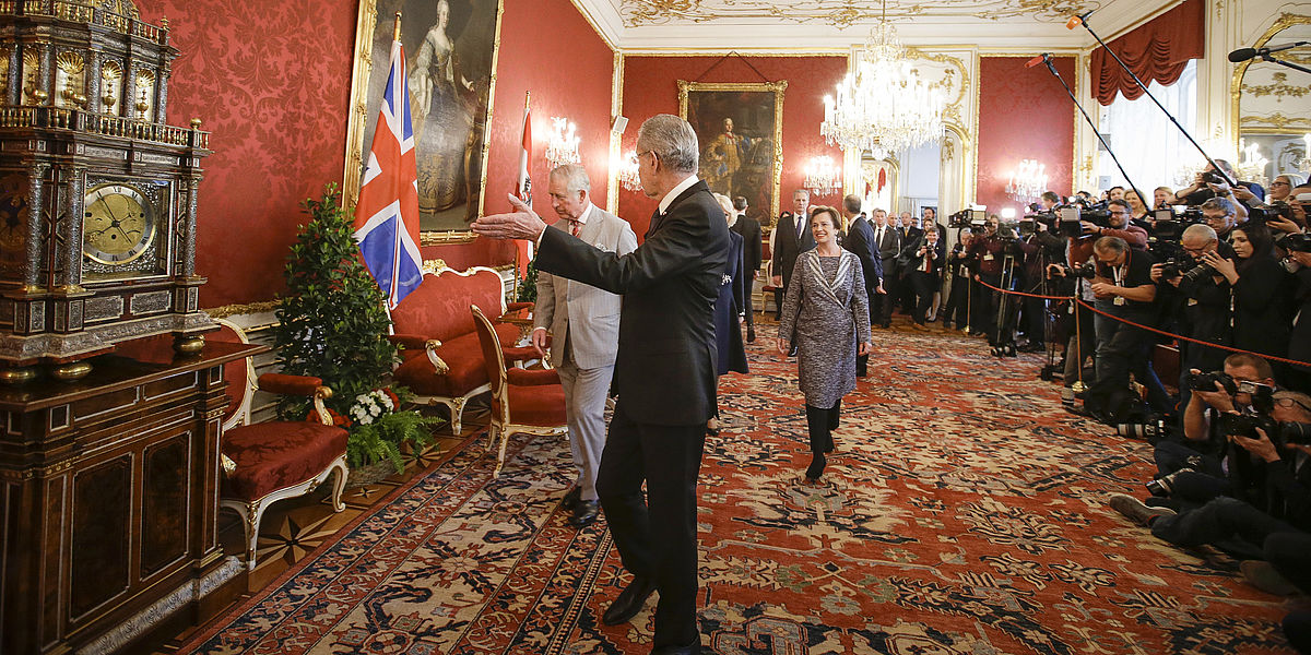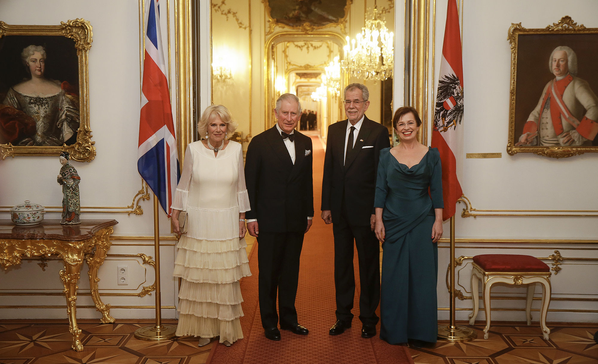 Bundespräsident Alexander Van der Bellen und Doris Schmidauer empfangen Prinz Charles und die Herzogin von Cornwall in der Wiener Hofburg.