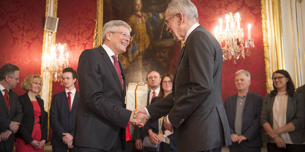 Danach leistete Peter Kaiser die Gelöbnisformel, bevor es zu einer kurzen Unterredung mit Bundespräsident Van der Bellen ging. Als Geschenk hatte der Landeshauptmann dem Bundespräsidenten einen Wasserkrug mitgebracht.