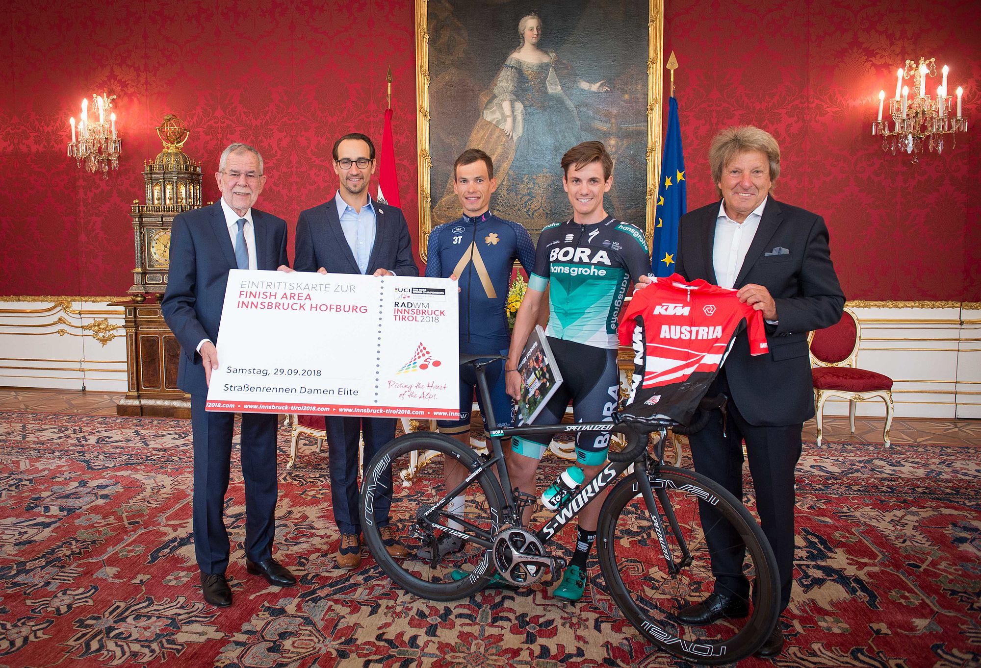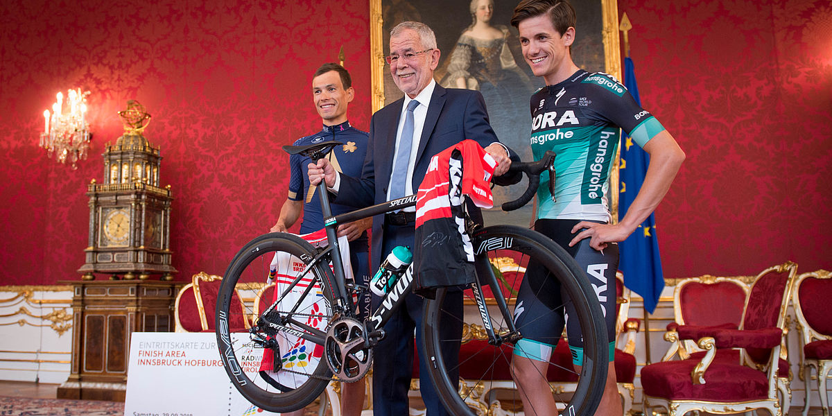 Alexander Van der Bellen zeigte sich radsportinteressiert, er schaue vor allem beim Giro d'Italia und der Tour de France immer wieder zu, meinte das Staatsoberhaupt. Außerdem erkundigte er sich bei Patrick Konrad und Stefan Denifl über die WM-Strecken in seiner engeren Heimat Tirol, ihren Werdegang und technische Details der Rennräder, schließlich sei er in seiner Jugend selbst viel gefahren. "Aber dann ist mir leider in Berlin an der Universität das Rad gestohlen worden", erzählte Van der Bellen in der Wiener Hofburg.