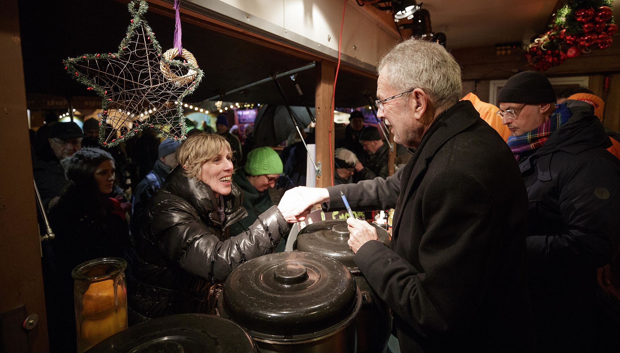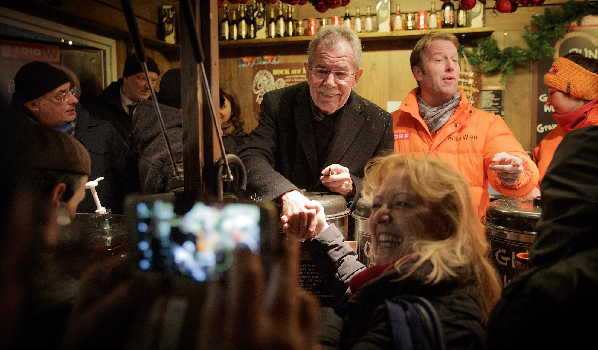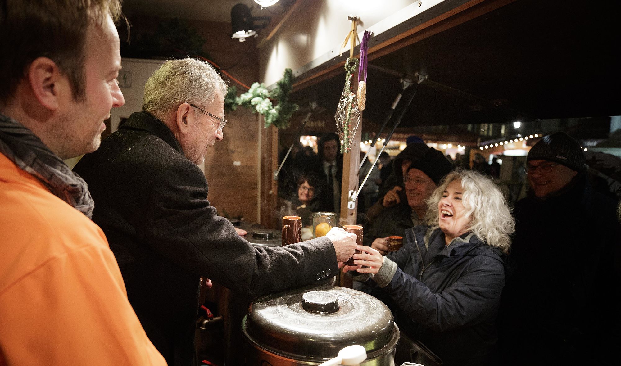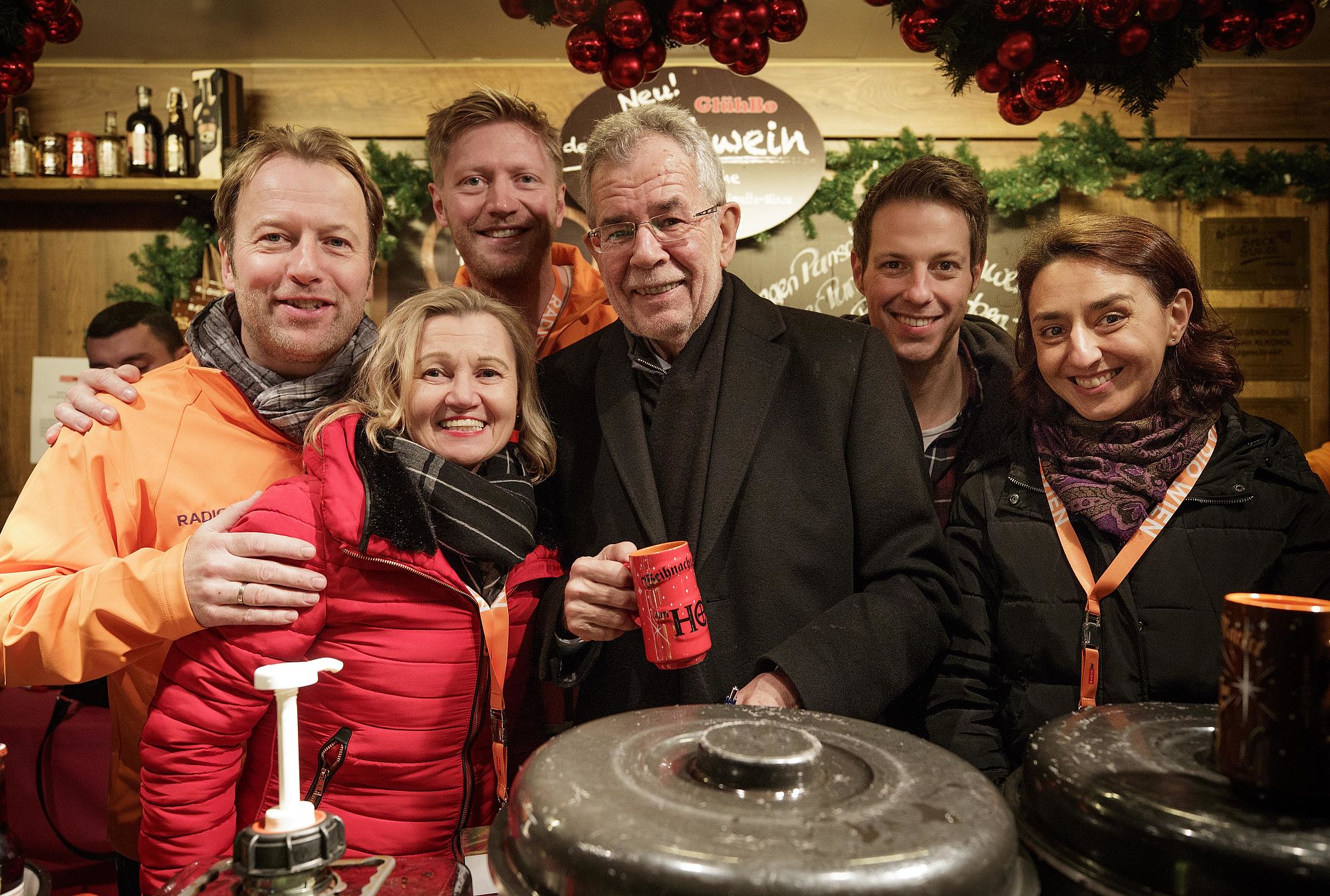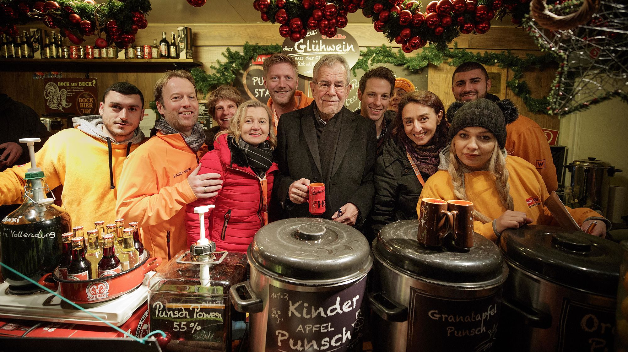 Bundespräsident Alexander Van der Bellen löst ein Wahlkampfversprechen ein, indem er mit ORF Radio Wien Moderatorinnen und Moderatoren Punsch für den guten Zweck ausschenkt.