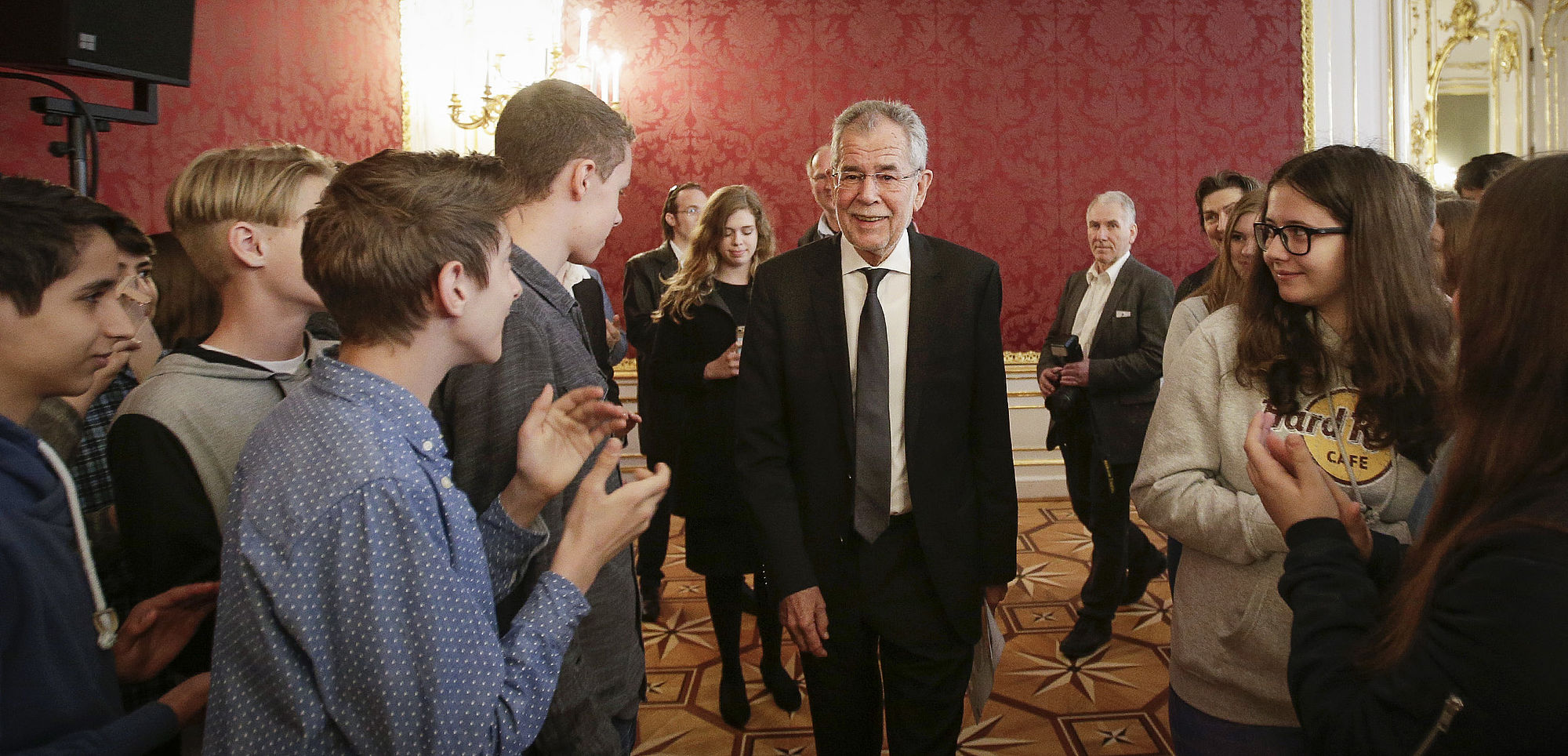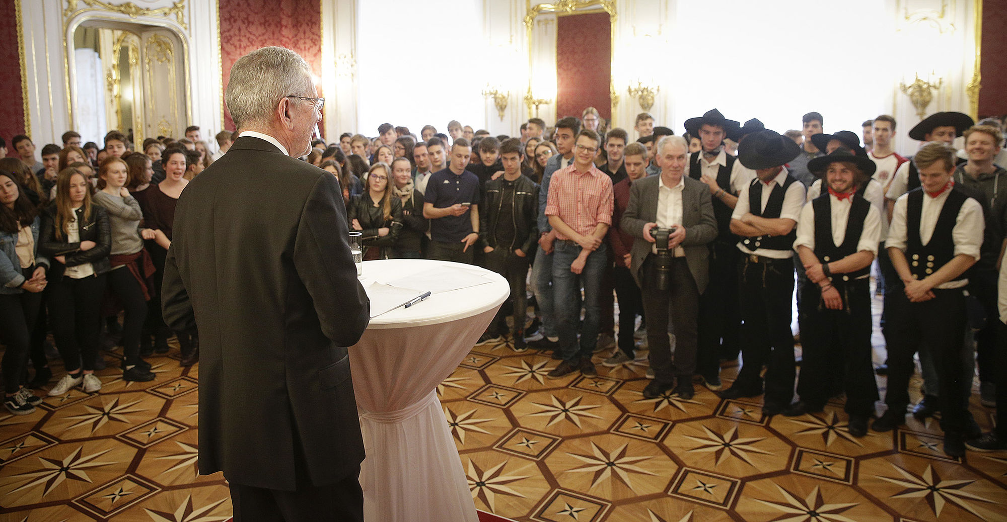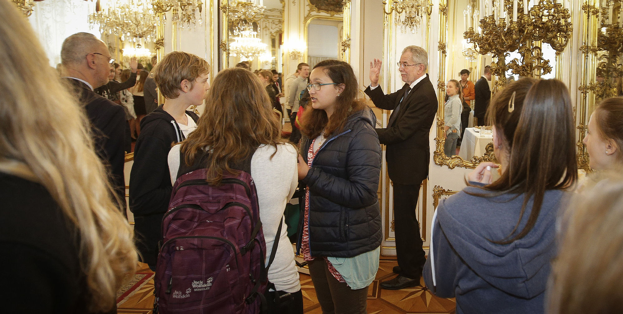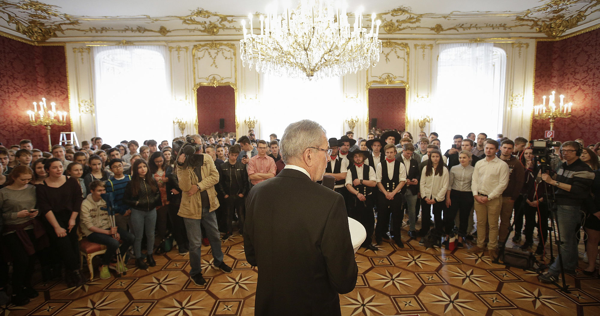 Eingeladen hatten sich die etwa 16- bis 18-jährigen Schüler durchwegs selbst: In zahlreichen Briefen wurde um einen Empfang beim Präsidenten gebeten; anlässlich des Europatages öffnete Van der Bellen nun erstmals in seiner bisher rund 100 Tage zählenden Amtszeit die Präsidentschaftskanzlei. Die rund 250 Schüler aus ganz Österreich begrüßten das Staatsoberhaupt - nach einer kurzen Führung durch die prunkvollen Räumlichkeiten - mit lautstarkem Applaus.