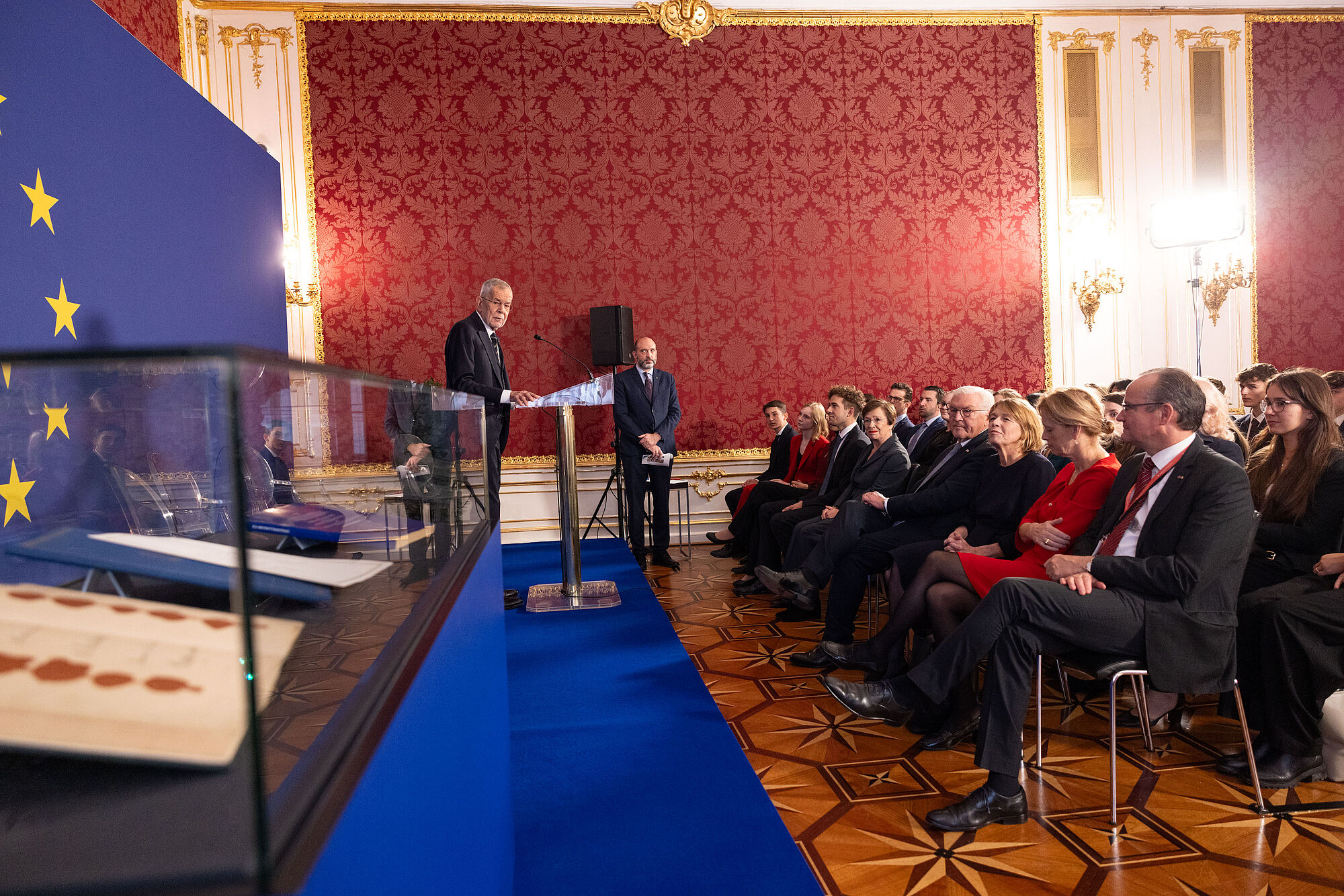 Nach einer kurzen Begrüßung der beiden Bundespräsidenten erläuterte Bundespräsident Alexander Van der Bellen in seinen einleitenden Worten, warum sich ein Alternat des österreichischen Staatsvertrages und der Vertrag zum Beitritt zur Europäischen Union im Raum befanden: