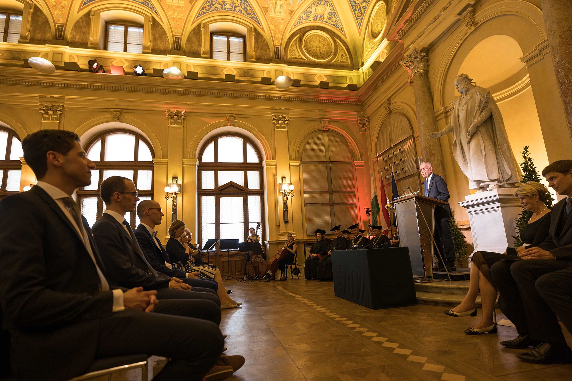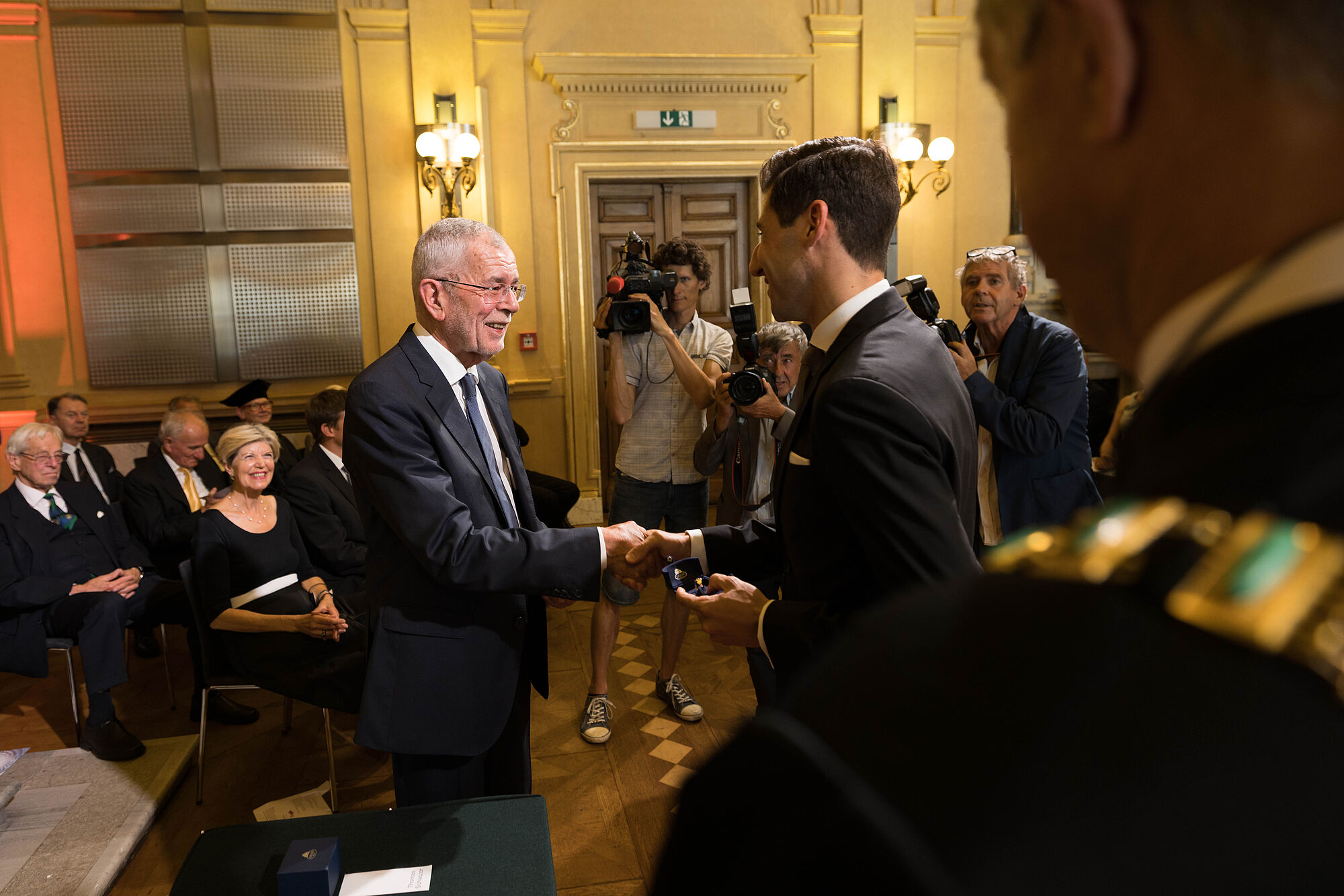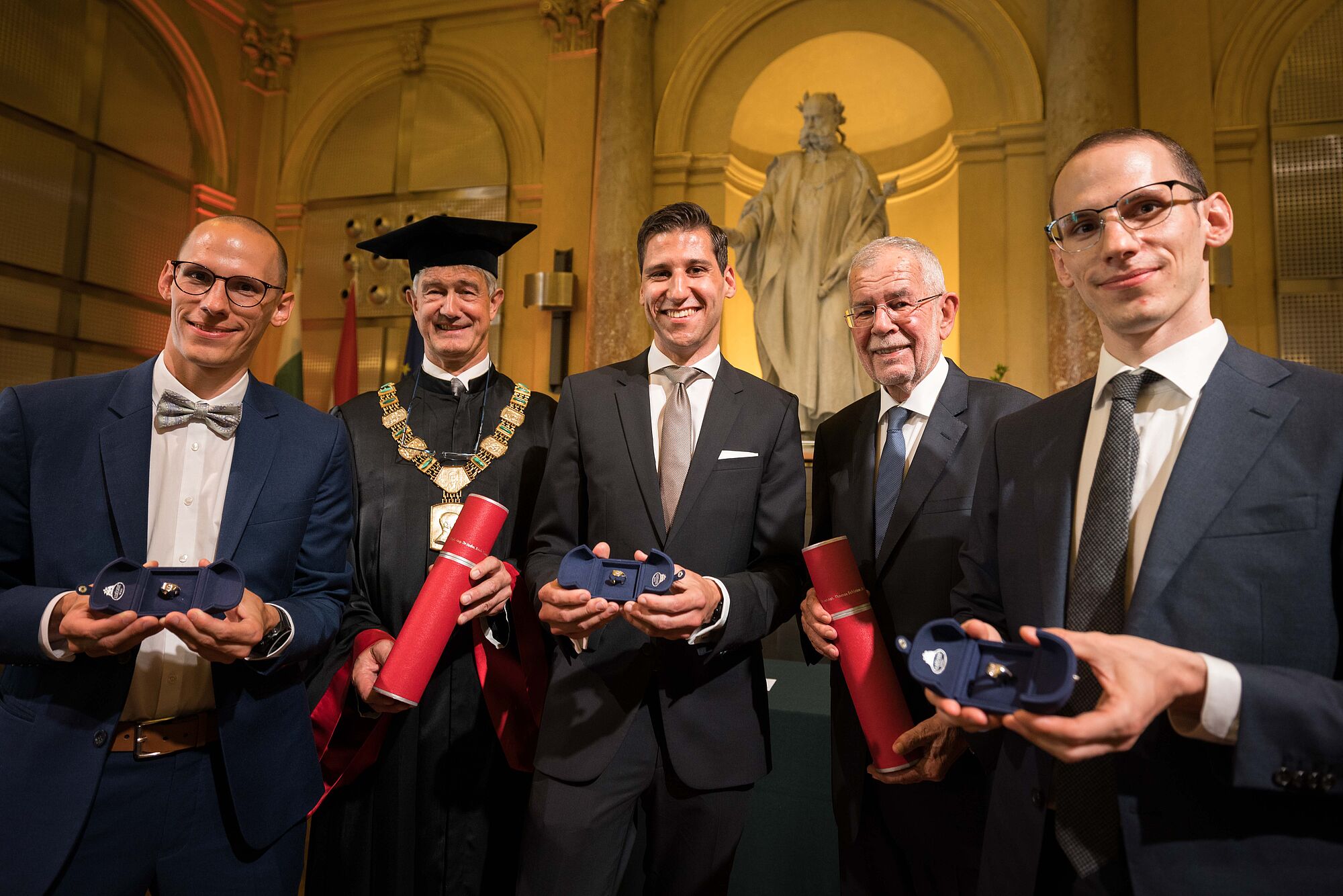 Bundespräsident Alexander Van der Bellen gratuliere den drei ausgezeichneten Absolventen persönlich zu ihrer Leistung: "Was sie geschafft haben, gelingt nicht einmal einem Promille aller Akademikerinnen und Akademiker. Sie haben durch Jahre, eineinhalb Jahrzehnte genau genommen, schulische und wissenschaftliche Höchstleistungen erbracht. Dafür gebührt ihnen Hochachtung".