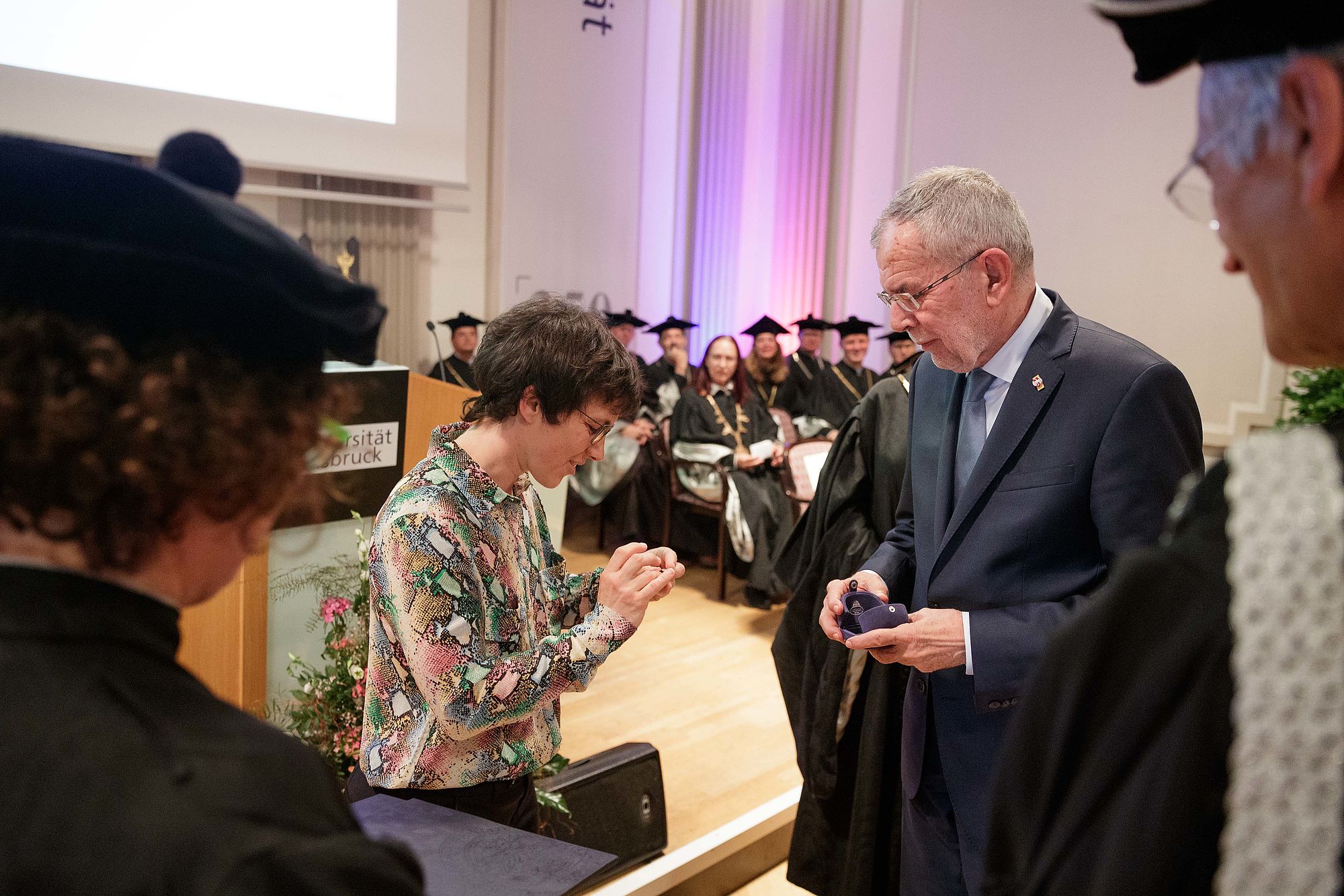 Bundespräsident Alexander Van der Bellen überreicht an der Leopold-Franzens-Universität in Innsbruck  Frau Flavia Guerrini den Ehrenring der Republik Österreich für ihre herausragenden Schul- und Studienleistungen.