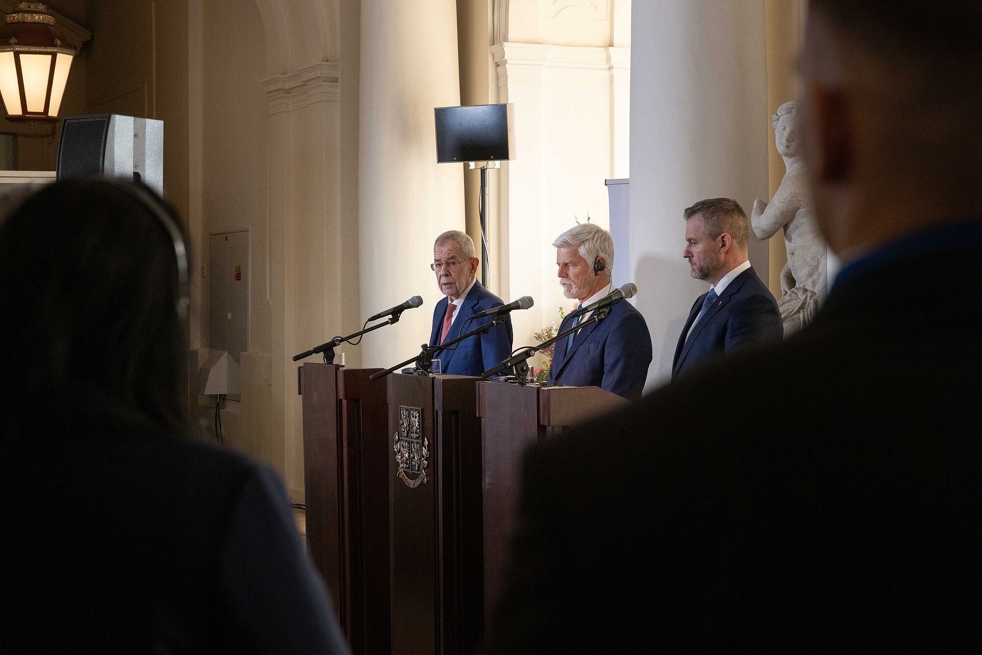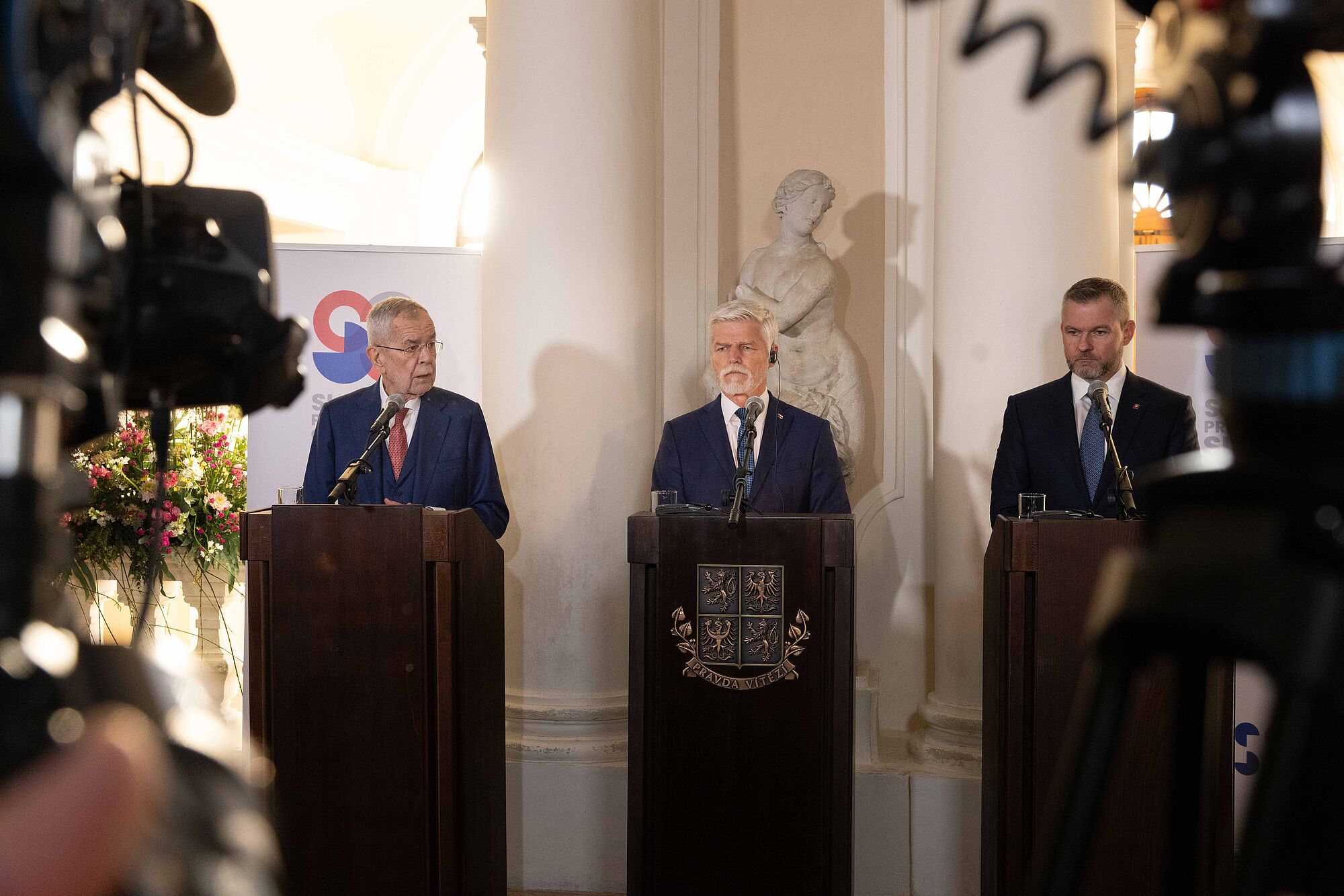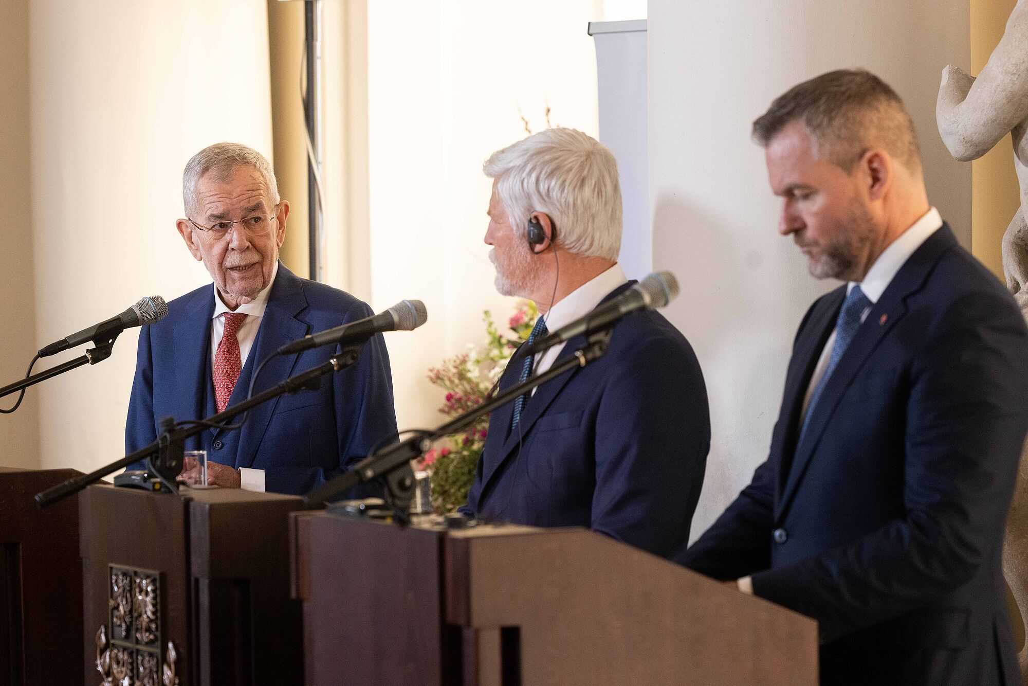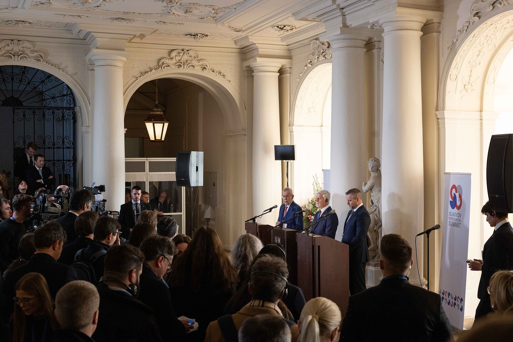 Van der Bellen nannte einige konkrete Beispiele für die Zusammenarbeit im Slavkov-Format. "So wirkten Tschechien, die Slowakei und Österreich gemeinsam erfolgreich darauf hin, dass Deutschland seine umstrittene Gastransitgebühr aufgab." Die "hohe Qualität" der grenzüberschreitenden Zusammenarbeit sei auch 2021 sichtbar geworden, als österreichische Rettungskräfte beim Tornado in Südmähren mithalfen. 2023 halfen Feuerwehrleute aus Tschechien in Oberösterreich, einen Großbrand im Zentrum von Ulrichsberg zu löschen. Und Feuerwehrleute aus der Slowakei unterstützten dabei, den Waldbrand im Rax-Gebiet zu bekämpfen. Van der Bellen äußerte zuversichtlich, dass "diese engen grenzüberschreitenden Beziehungen unserer drei Länder in Zukunft sogar noch enger und intensiver werden".