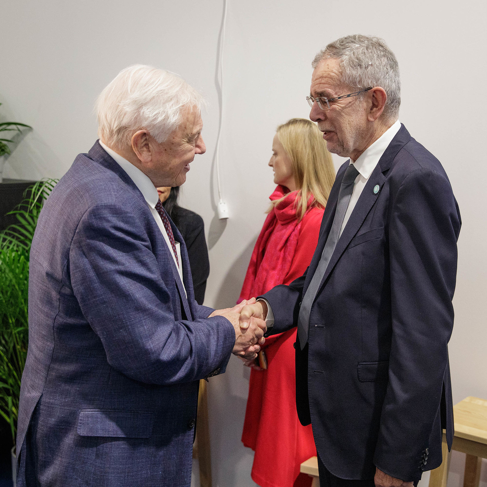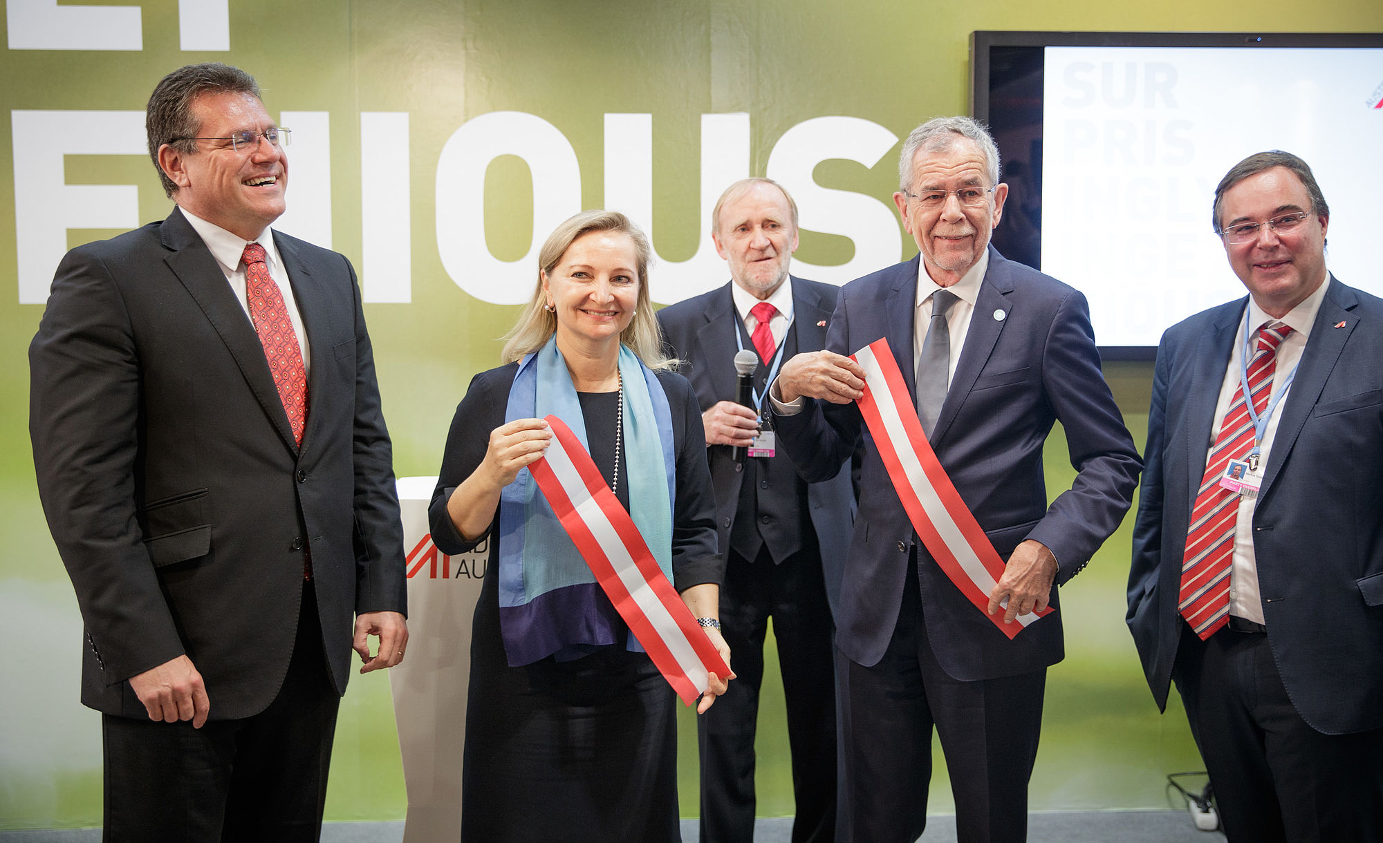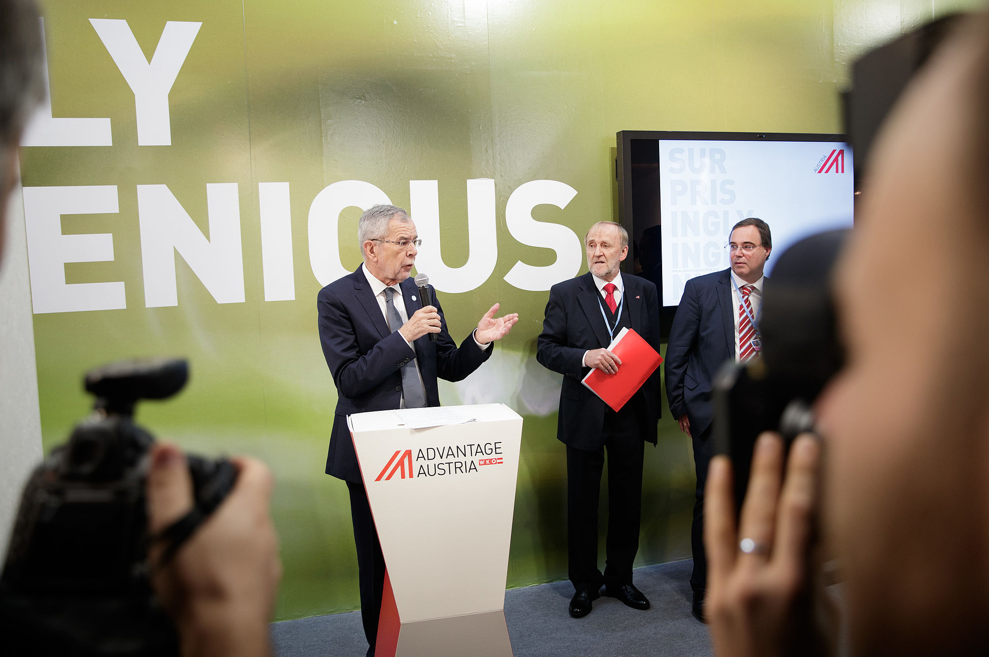 Alexander Van der Bellen warnte mit den Worten "wir stehen vor dem globalen Klimakollaps" erneut vor der enormen Gefahr des Klimawandels. Die gute Nachricht sei aber, dass inzwischen die nötige Technologie bereit steht, um die Gefahr einzudämmen. Österreich zähle hierbei zu den führenden Ländern. Der Sektor ist aber nicht nur für das Klima, sondern - mit seinen zehntausenden Arbeitsplätzen - auch für die Wirtschaft von Bedeutung, meinte der Bundespräsident. Auf dem Stand werden Projekte österreichischer Unternehmen präsentiert, die in Sachen Klimaschutztechnologie vorbildlich sind.