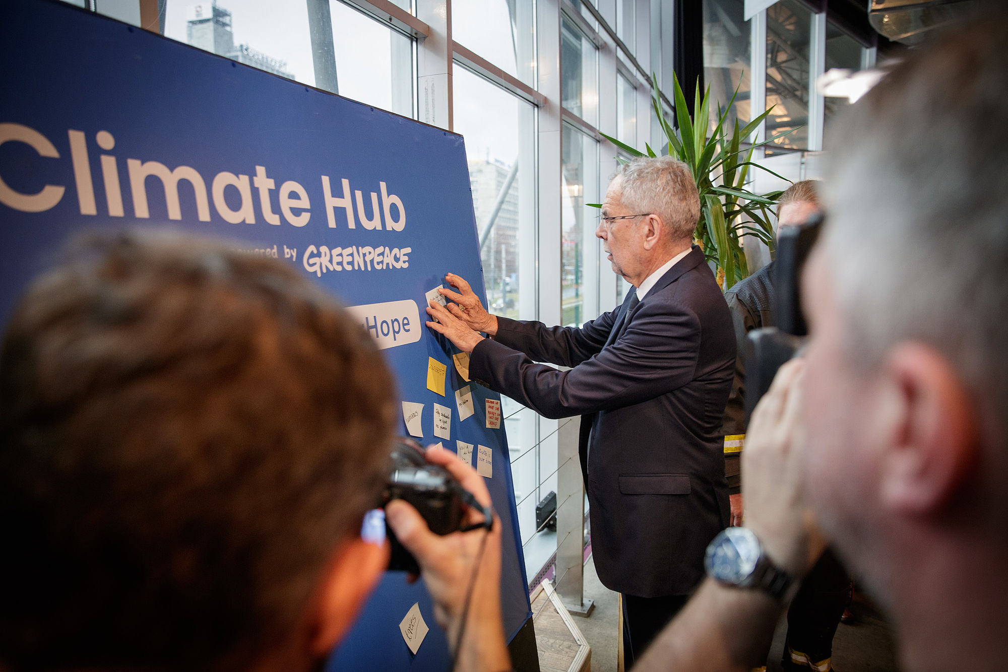 Neben seinen Treffen mit Politikern besuchte der Bundespräsident auch das Veranstaltungszentrum "Climate Hub" von Greenpeace. "Der Besuch des österreichischen Bundespräsidenten ist ein starkes Zeichen an die Zivilgesellschaft", sagte Annabella Rosemberg, Programmdirektorin von Greenpeace International.